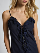 The neckline is framed with delicate scalloped lace trim and adjustable straps for a personalised fit, while two front tie closures add a touch of romantic detail. Light, elegant and impossibly easy to wear, the Lucia Maxi is a timeless summer essential.