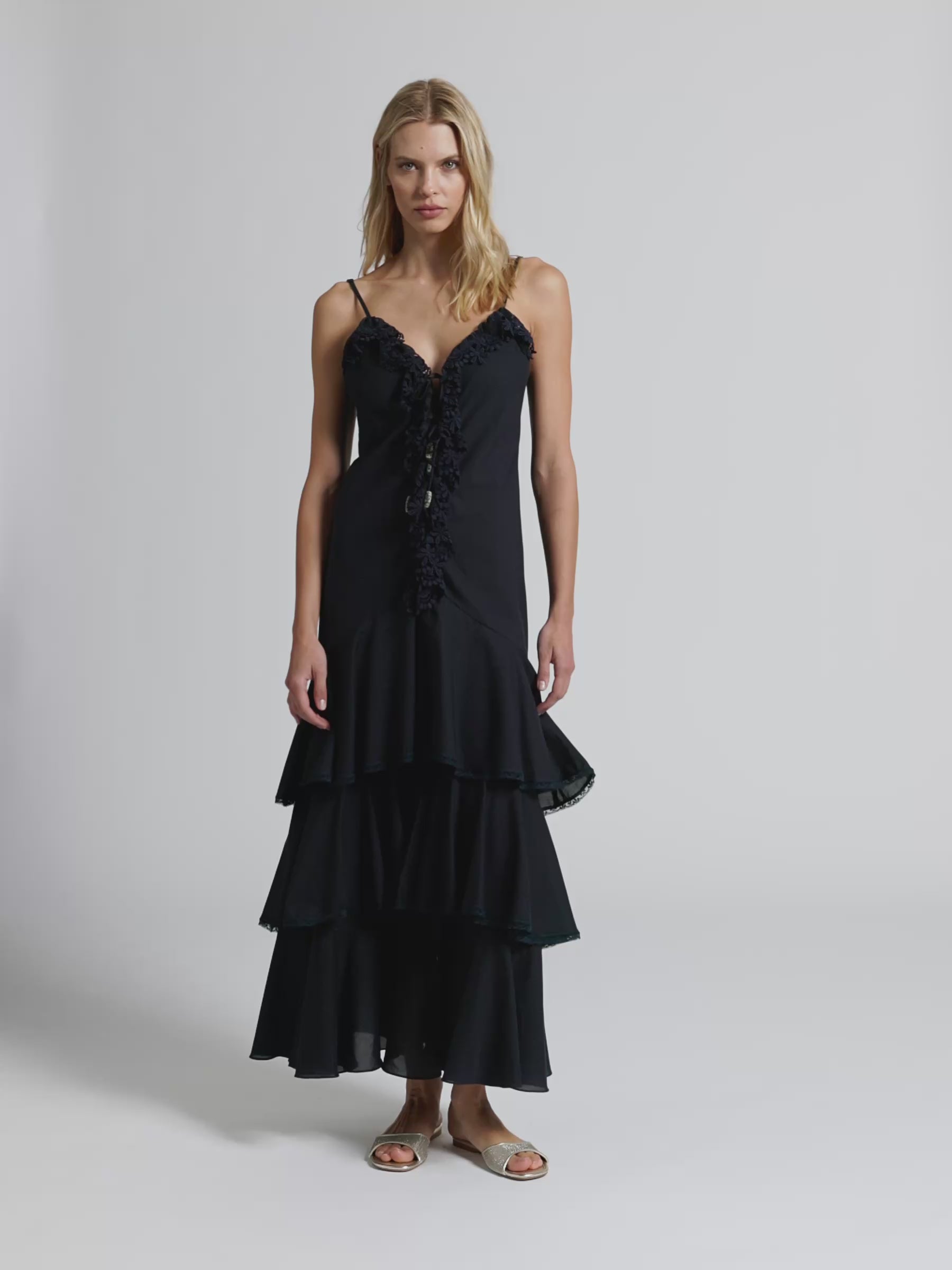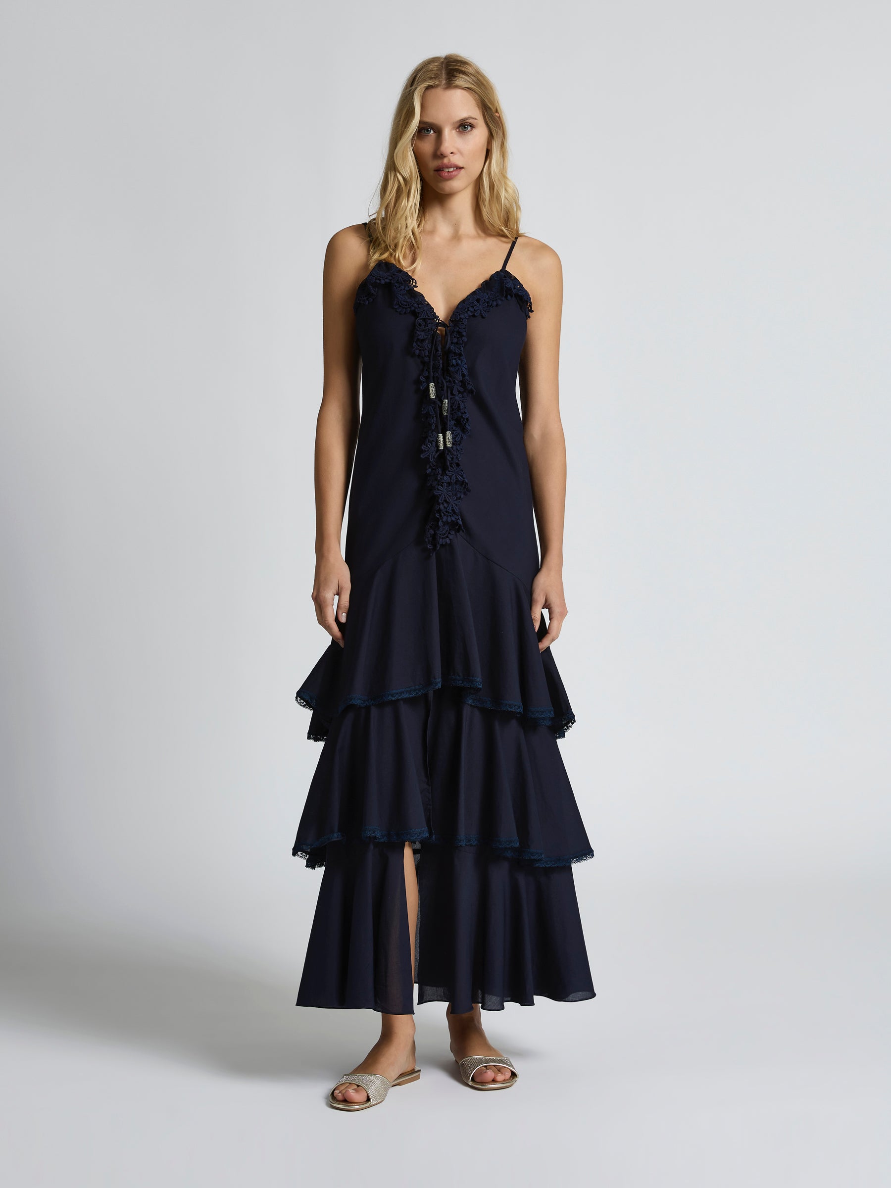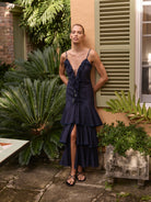 Effortless and feminine, the Lucia Maxi is crafted from 100% cotton for a soft, breathable feel perfect for warm days and elevated occasions. This designed features a beautifully tiered, ruffled skirt that falls to a graceful maxi length, finished with a subtle front slit for fluid movement.