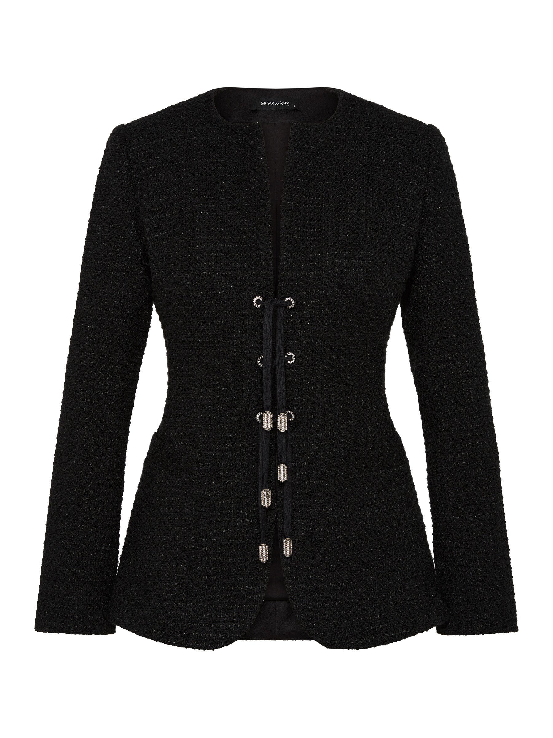 Crafted from an Italian stretch tweed fabrication in a cotton viscose blend, the Luna Jacket is a timeless refined style that will be a favourite in your wardrobe. This statement collarless jacket is fitted through the body with silver diamante eyelets and diamante tie toggles on a cotton draw string, featuring a split on the sleeves and side pockets. Pair the Luna Jacket with the Luna Short or Rachel Pant for a sophisticated look.