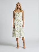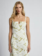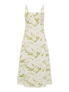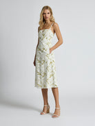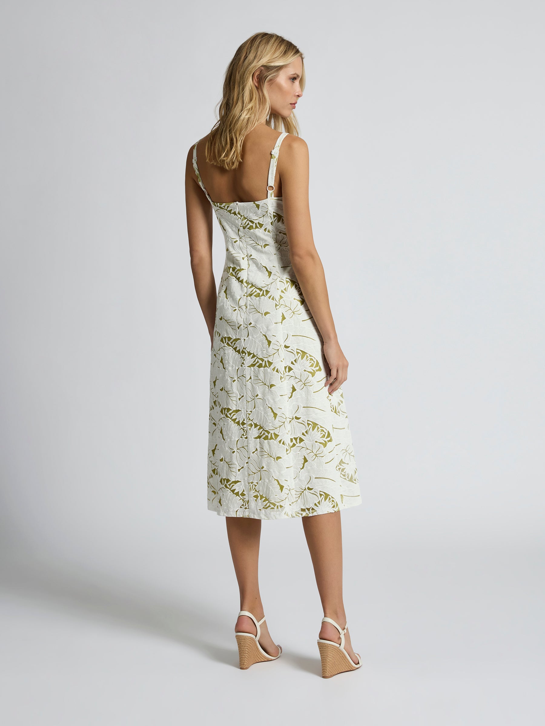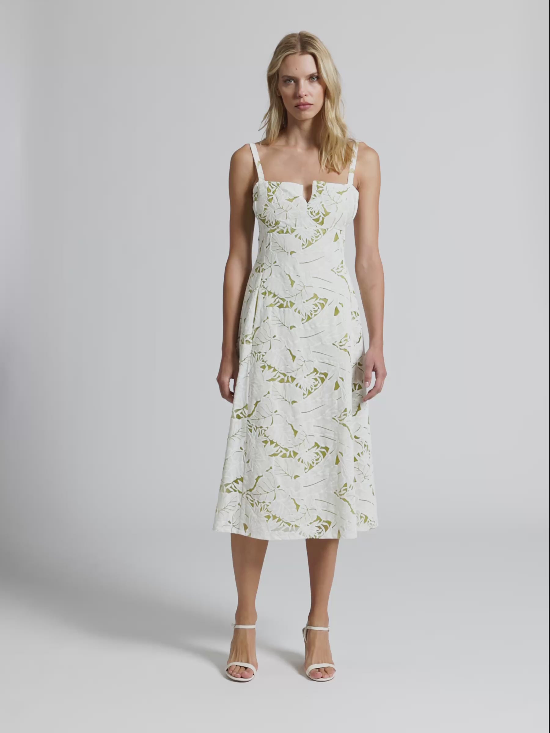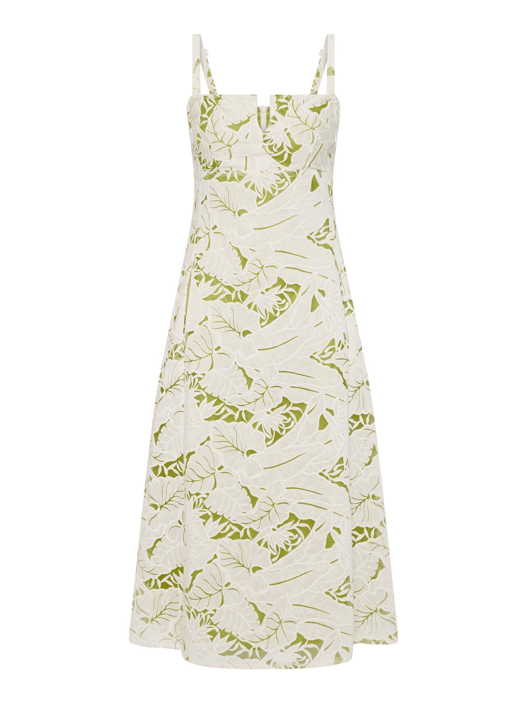 The adjustable straps allow for a personalised fit, while functional side pockets bring ease to its considered design. Falling to a graceful mid-calf length, the skirt moves with soft fluidity, creating a timeless and flattering shape. Fully lined and finished with a centre back invisible zipper for a smooth profile, the Palm Midi Dress is a fresh, contemporary piece perfect for warm-weather occasions and elegant daytime events.