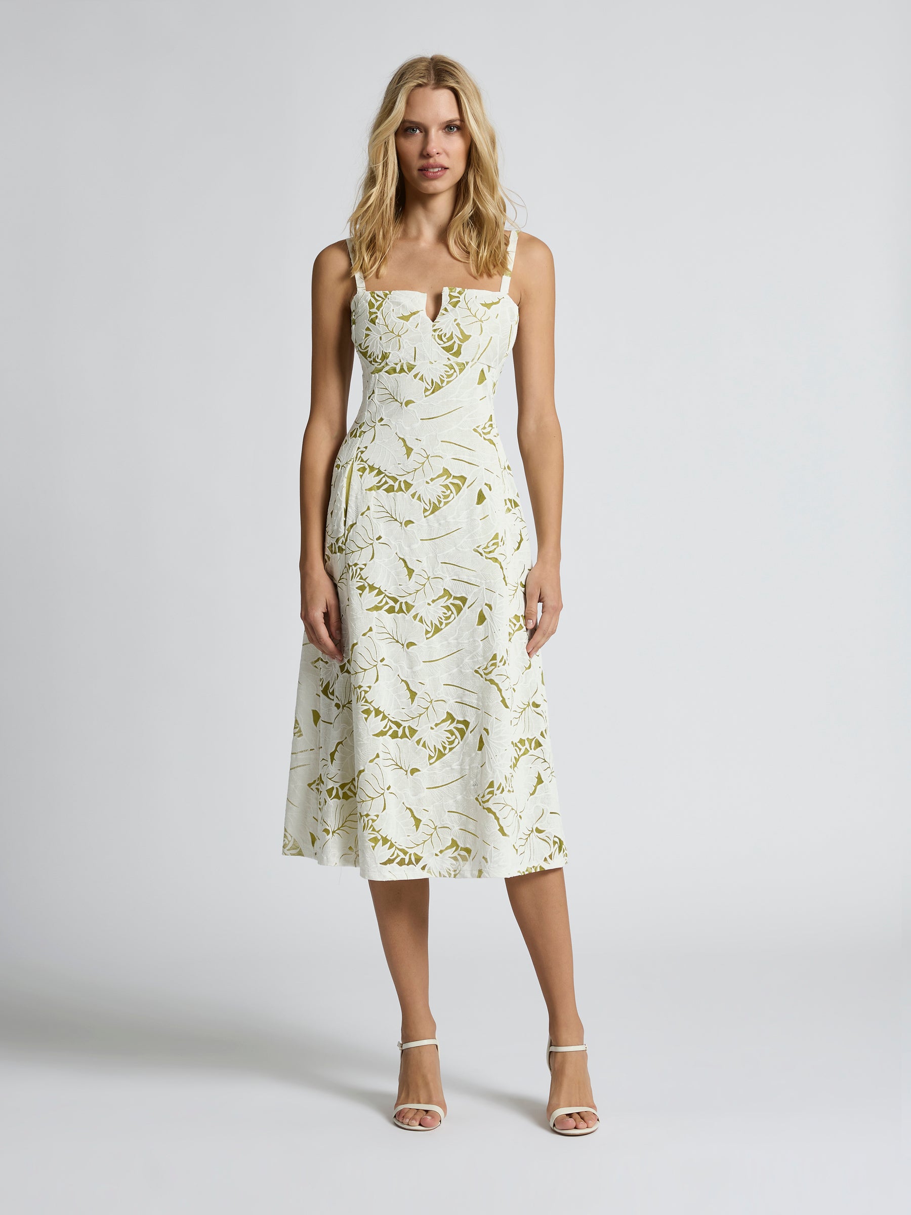 The Palm Midi Dress offers a refined balance of comfort and elevated femininity. Intricate textured print detailing reveals a subtle citrus tulle fabric, adding depth and modernity to the clean, white silhouette.