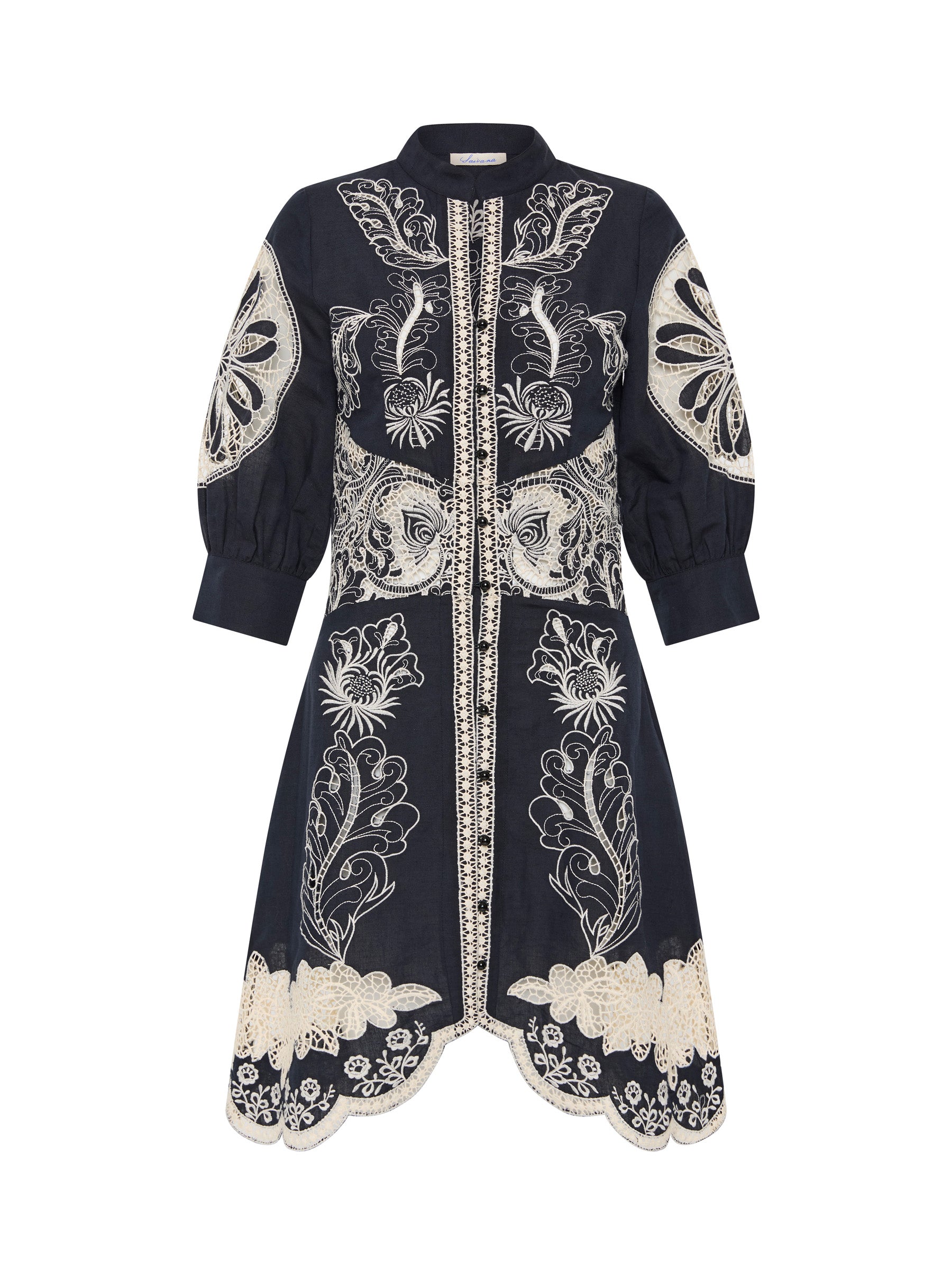 The Alma Short Dress is crafted from an embroidered linen cotton fabrication with intricate cut out detailing. Fitted through the body and waist, falling into a subtle A-Line hem with embroidered scallop detailing. It features a detailed centre front closure with loops and pearl buttons and finishes just above the knee. An effortless, chic, staple piece that can be worn day to night.