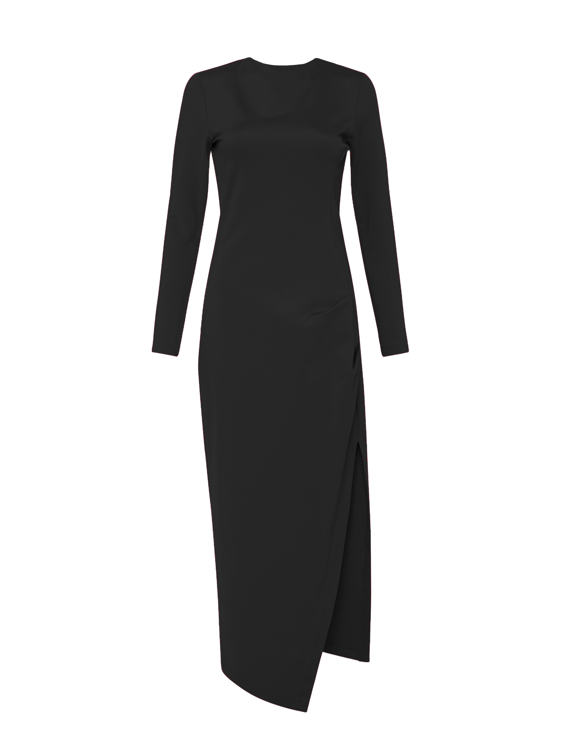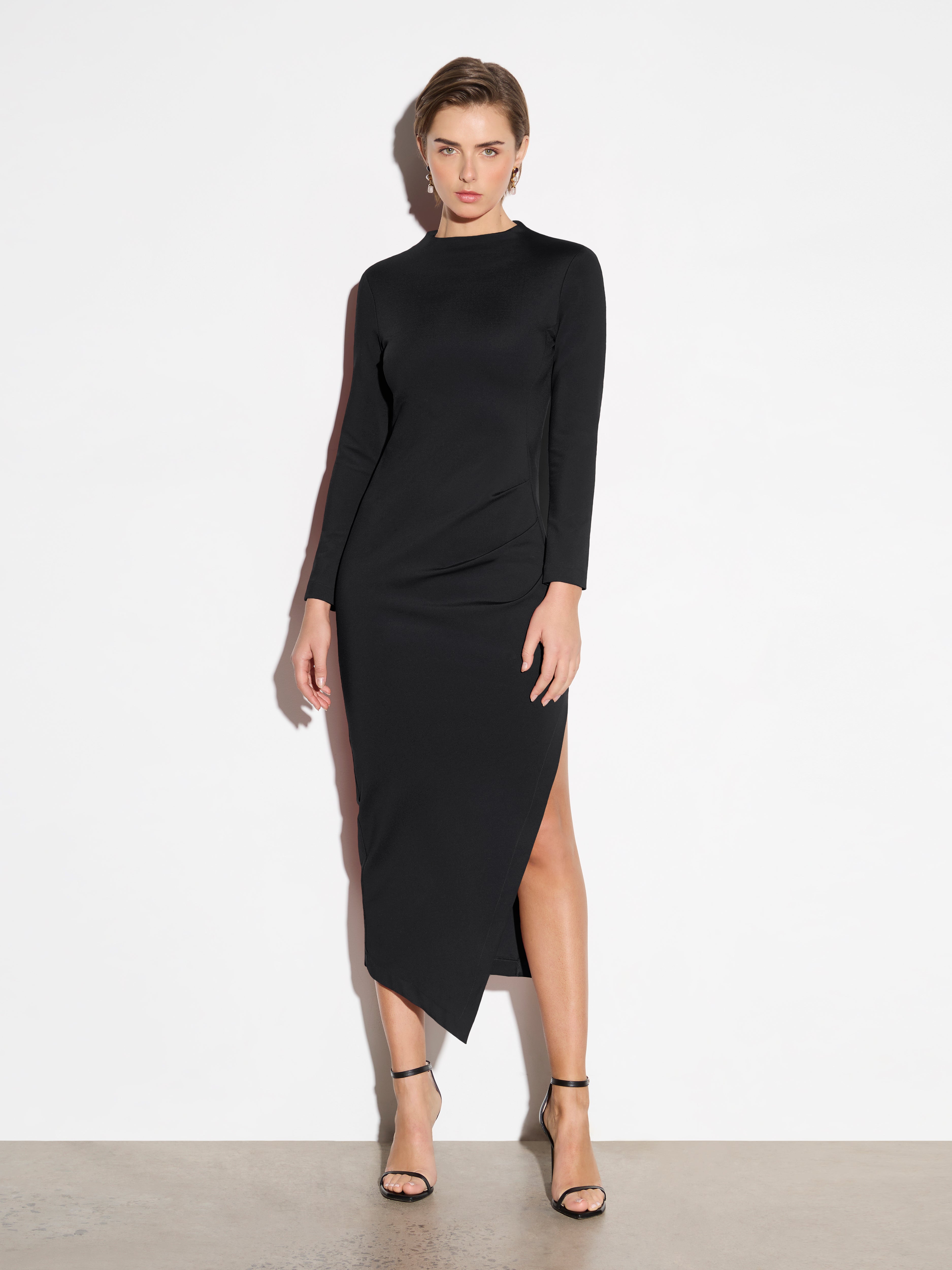The Brandy Dress is crafted from a heavy knit fabric. Designed with an extended neckline, full length sleeves and a forward side split starting from just above the knee. The Brandy Dress is fitted throughout the body with two tucks above the split for a more flattering fit. This staple piece is the perfect day to night dress, team yours with boots or a classic pump.