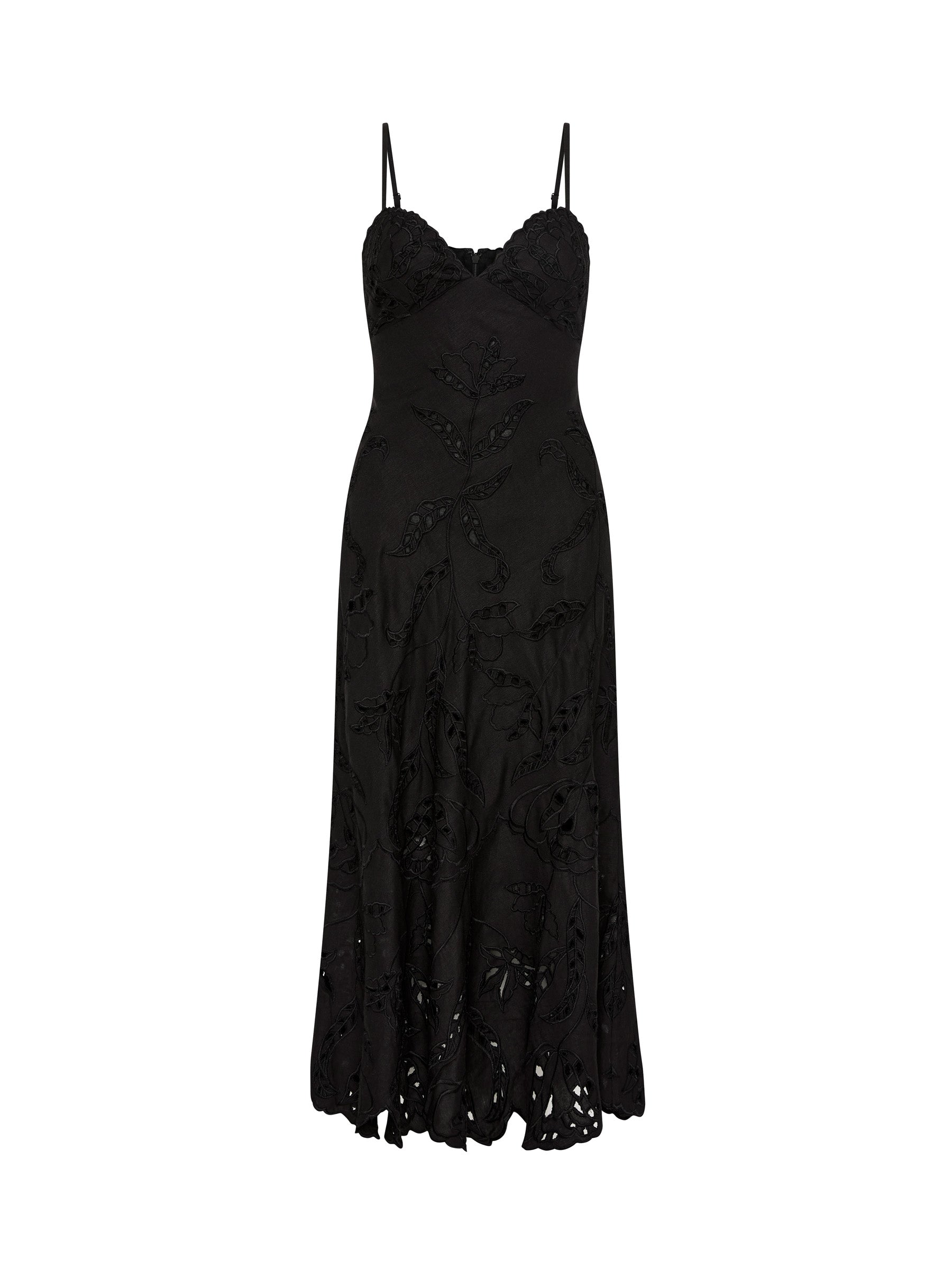 The Cannes Dress is intricately embroidered with cutwork and embroidery on a Linen/Viscose fabrication. Fitted at the bust with embroidery detailing and adjustable straps it falls into a bias-cut skirt. Beautifully tailored and lined in cotton voile the Cannes dress is worthy of a special occasion as well as an easy dress for summer days. Dress it up with heels or flats for holidays