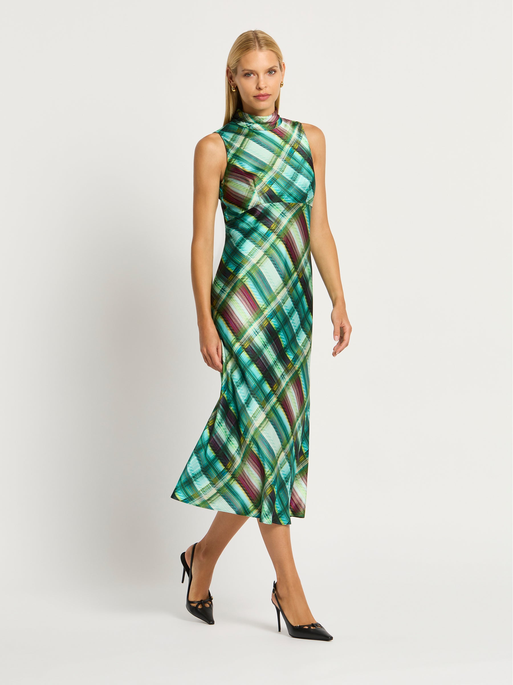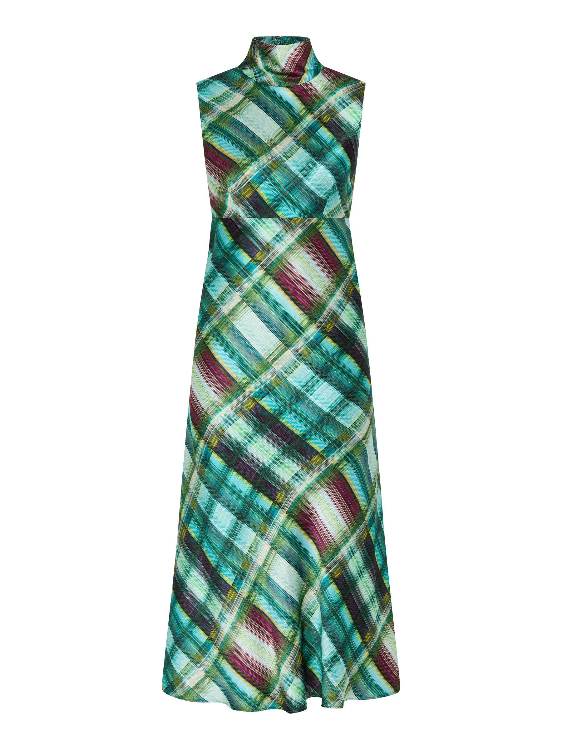 With a vibrant contemporary plaid print in shades of green and plum on a mid-weight viscose satin, the Carrie Sleeveless is cut on the bias and fitted through the bodice with an under bust seam. It has a distinctive soft high collar, cut away armhole and a shapely, yet relaxed silhouette falling to a mid-length slight A-line hem. A very on-trend piece that will stand out in your trans-seasonal wardrobe.