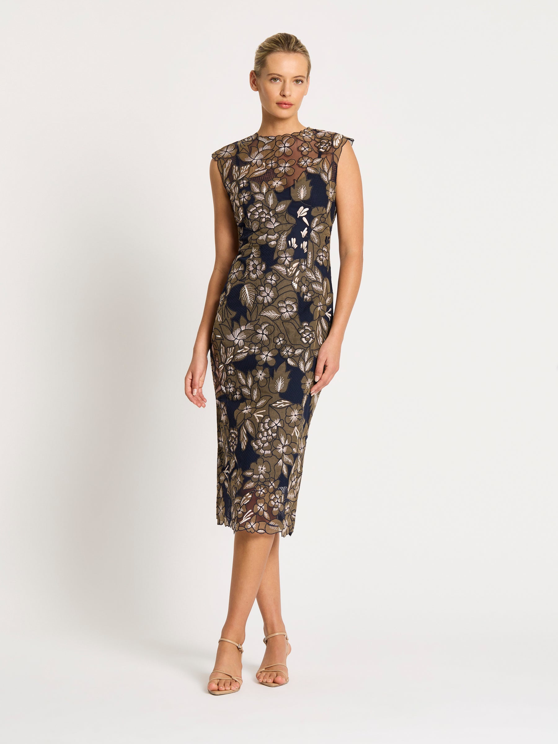 The intricate applique of delicate pink and white flowers woven into a grey background and embroidered onto a dark navy fine tulle create the unique look of the Fleur Dress. Designed with a figure-flattering shift silhouette, it finishes at mid-calf with an invisible zip back closure.