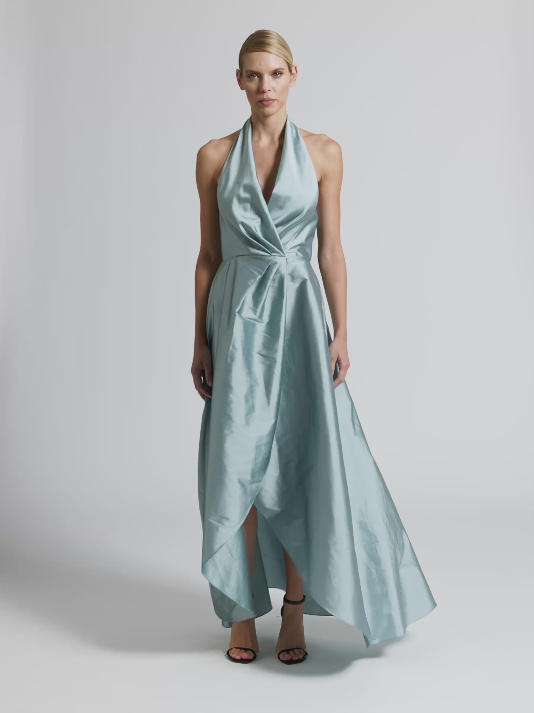 A dramatic interpretation of a classic style, the Hemmingway Gown evokes feelings of grand entrances and glamorous soirees. With its halter neck statement tie at the back neck and bodice secured at the waist with tucks, its sky blue taffeta falls to a classic wrap front high-low skirt, flowing down to ankle height. Perfect for any formal event, cocktail party or wedding.