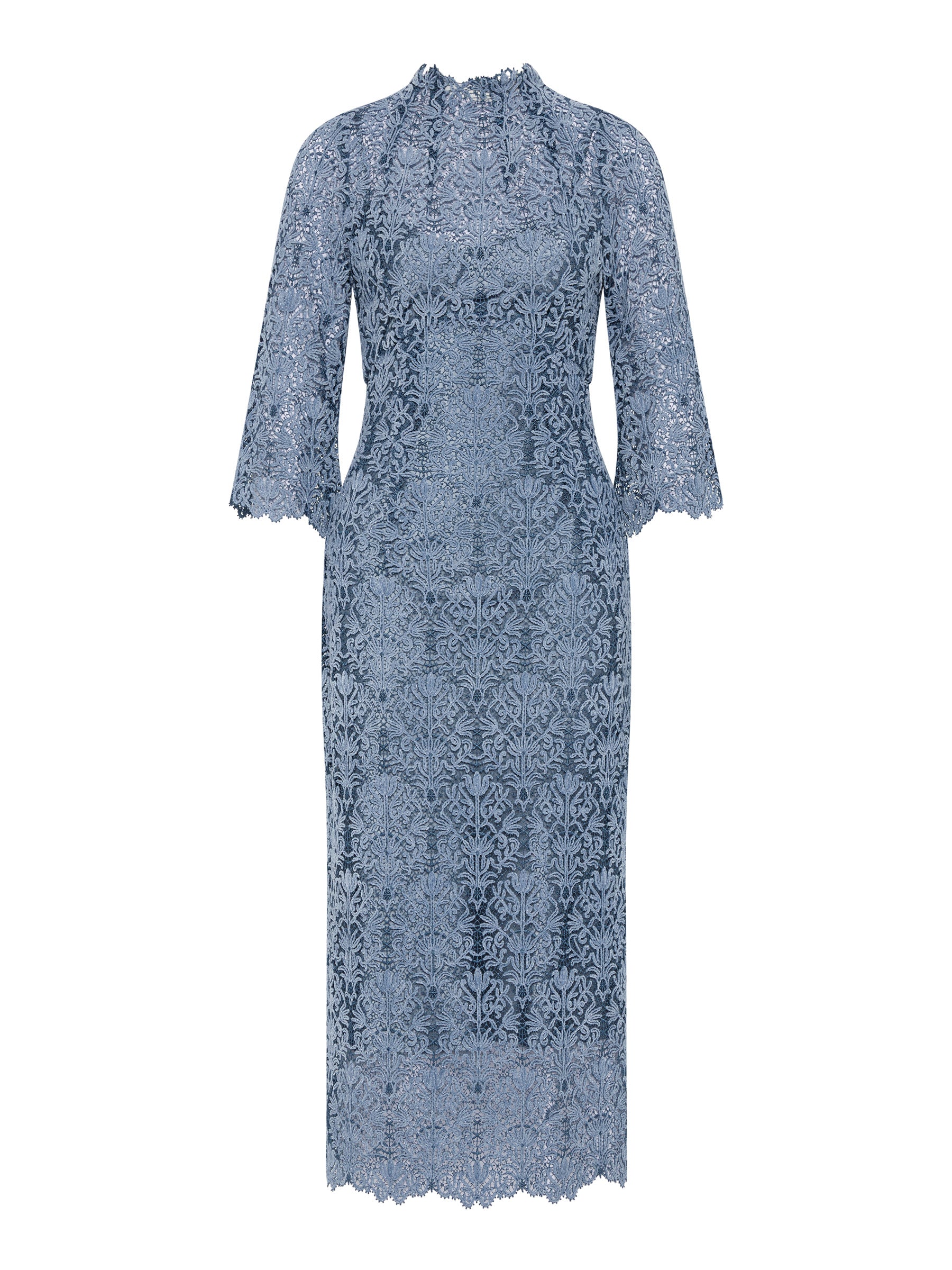 A truly versatile autumn-winter dress, the beautifully intricate embroidered pattern of the Juliette Midi in soft blue two-tone lace is enhanced with a delicate velvet finish. Scallop detailing extends around the high neckline and three quarter length sleeves creating a stunning impression from a classic, figure flattering shape for any day or night event. Comes with a matching jersey slip.