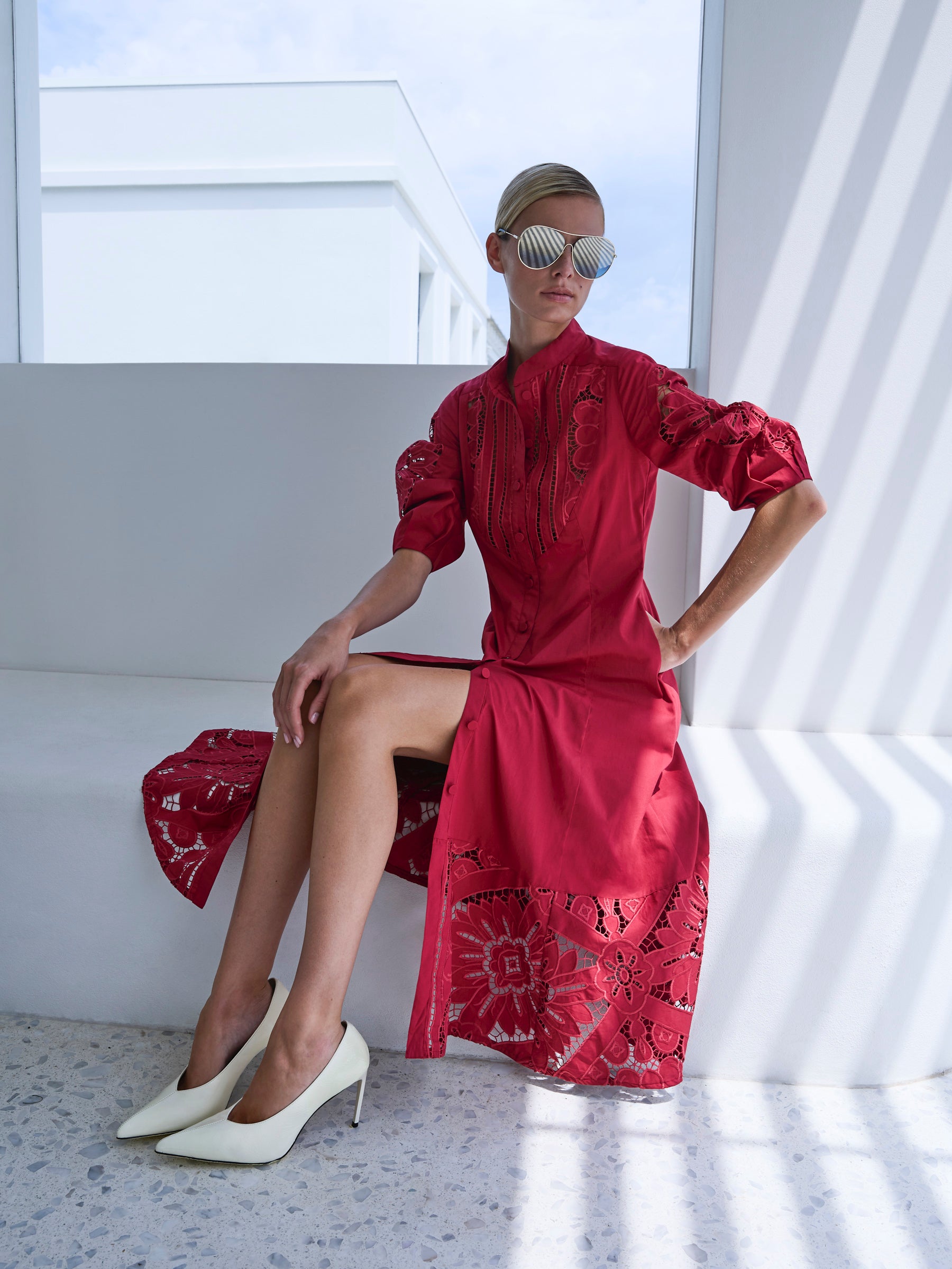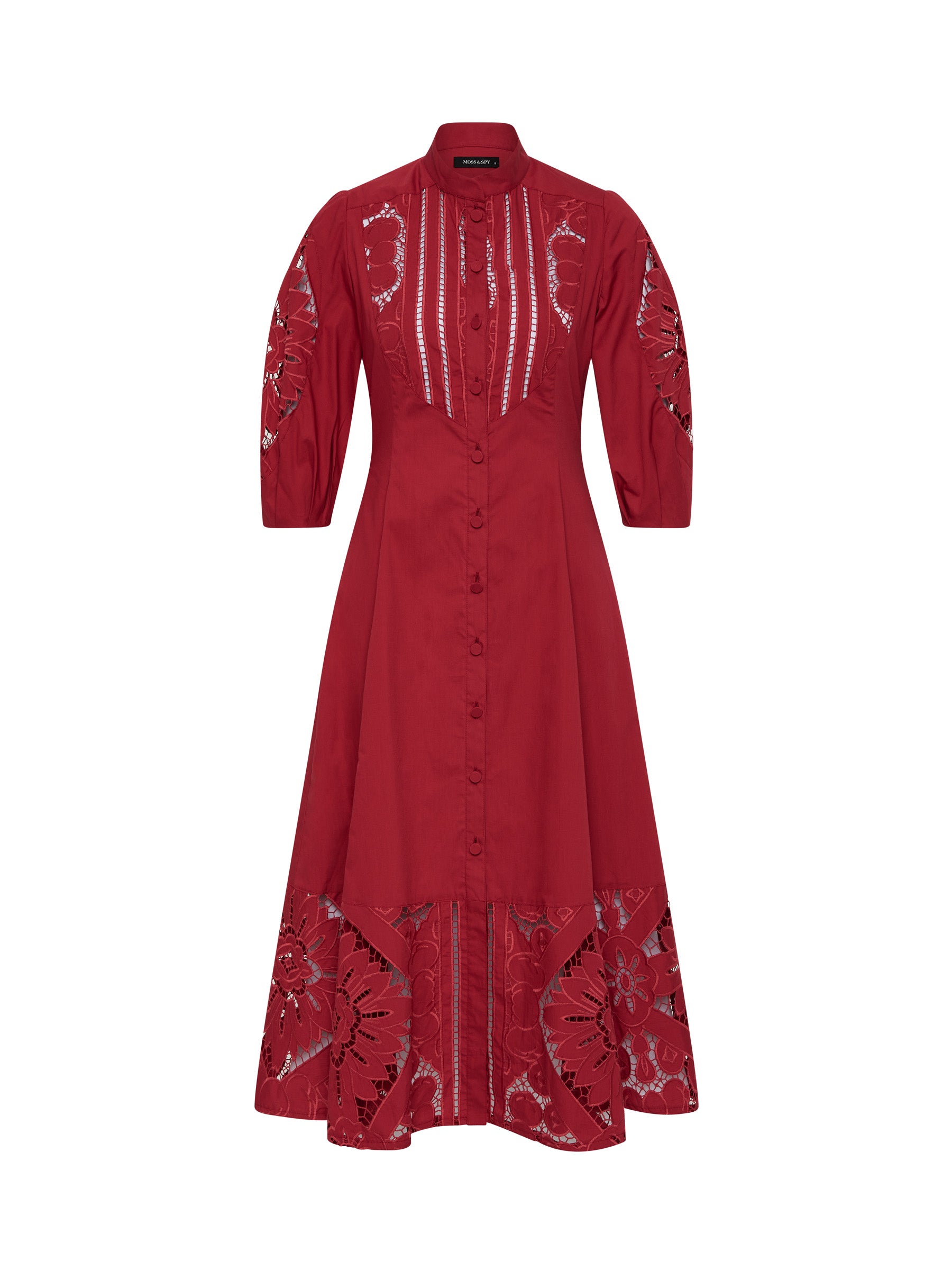The effortlessly relaxed Letitia Shirt Dress features a cut-out geometric floral design in rich garnet-red on cotton poplin to create texture and dimension. Designed with elbow length sleeves and a flattering shapely silhouette, it gently flares into an A-line skirt detailed with embroidery along the hem. A centre-front covered button closure and discreet side pockets complete the look. Versatile and timeless, this piece transitions seamlessly from work to night with understated charm.