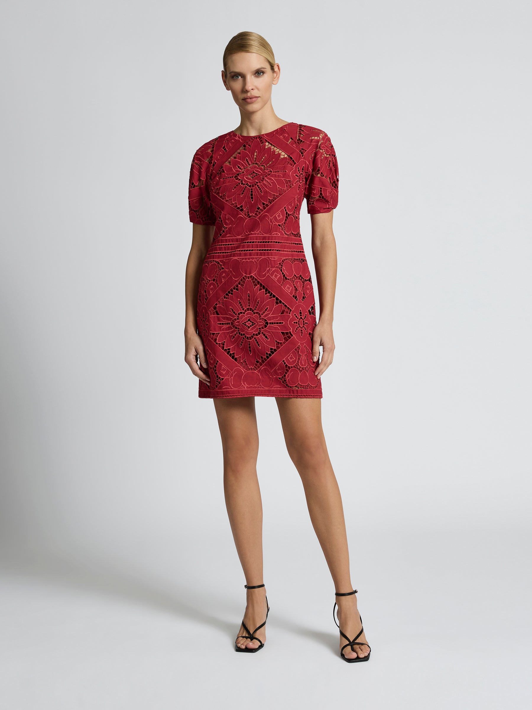 Intricately embroidered with a cut-out geometric floral design in rich garnet-red on cotton poplin that adds texture and dimension. The Letitia Short Dress is a mini shift silhouette, fitted through the body with a round neckline, elbow-length sleeves finishing above the knee. A matching cotton slip is included for effortless layering and comfort.