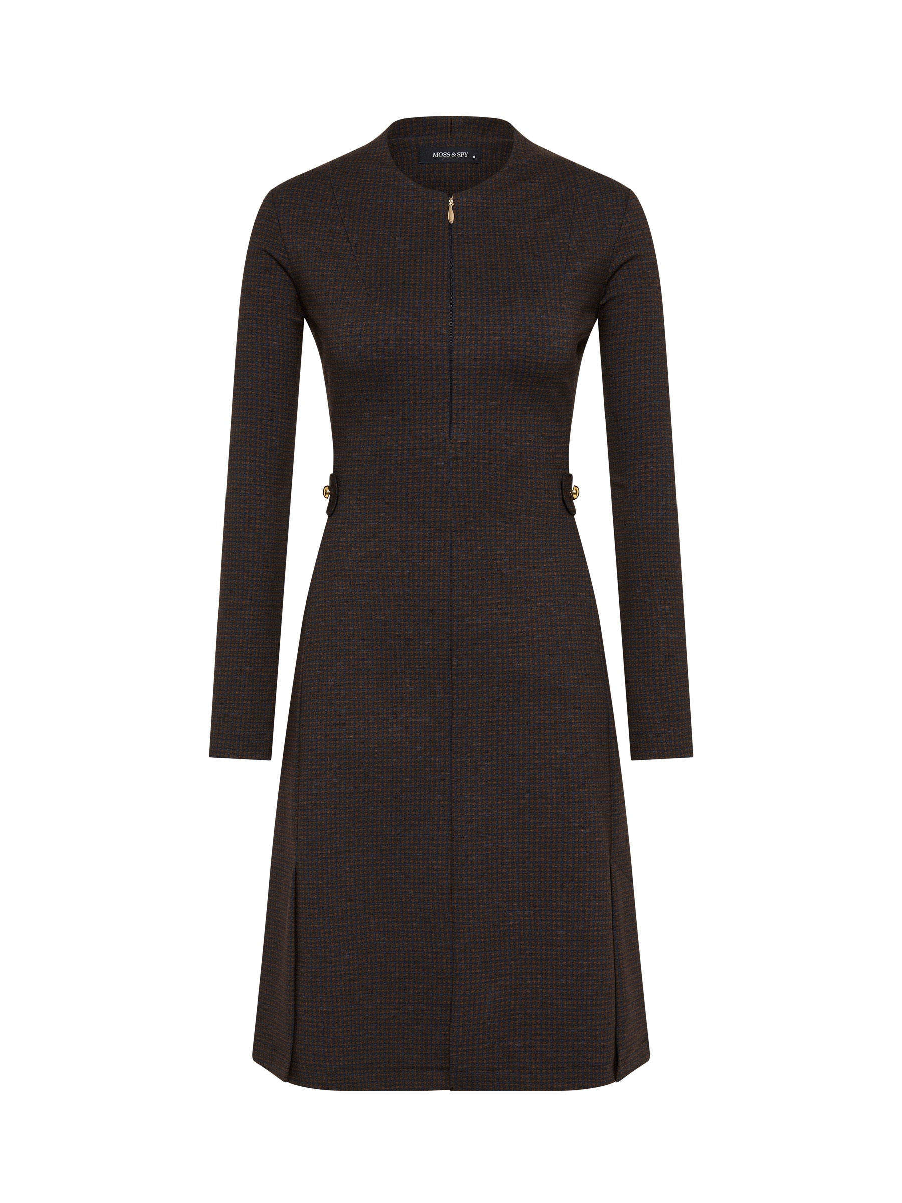The Madison Dress has a chocolate and navy fine check printed onto a stretch Ponte, featuring a round neck with a gold concealed centre front zip and gold button detail on the waist tabs. Features a centre front split with pleats at the hem and side panel pockets, falling to an A-Line silhouette. The Madison Dress is the perfect blend of comfort and elegance for day or night.