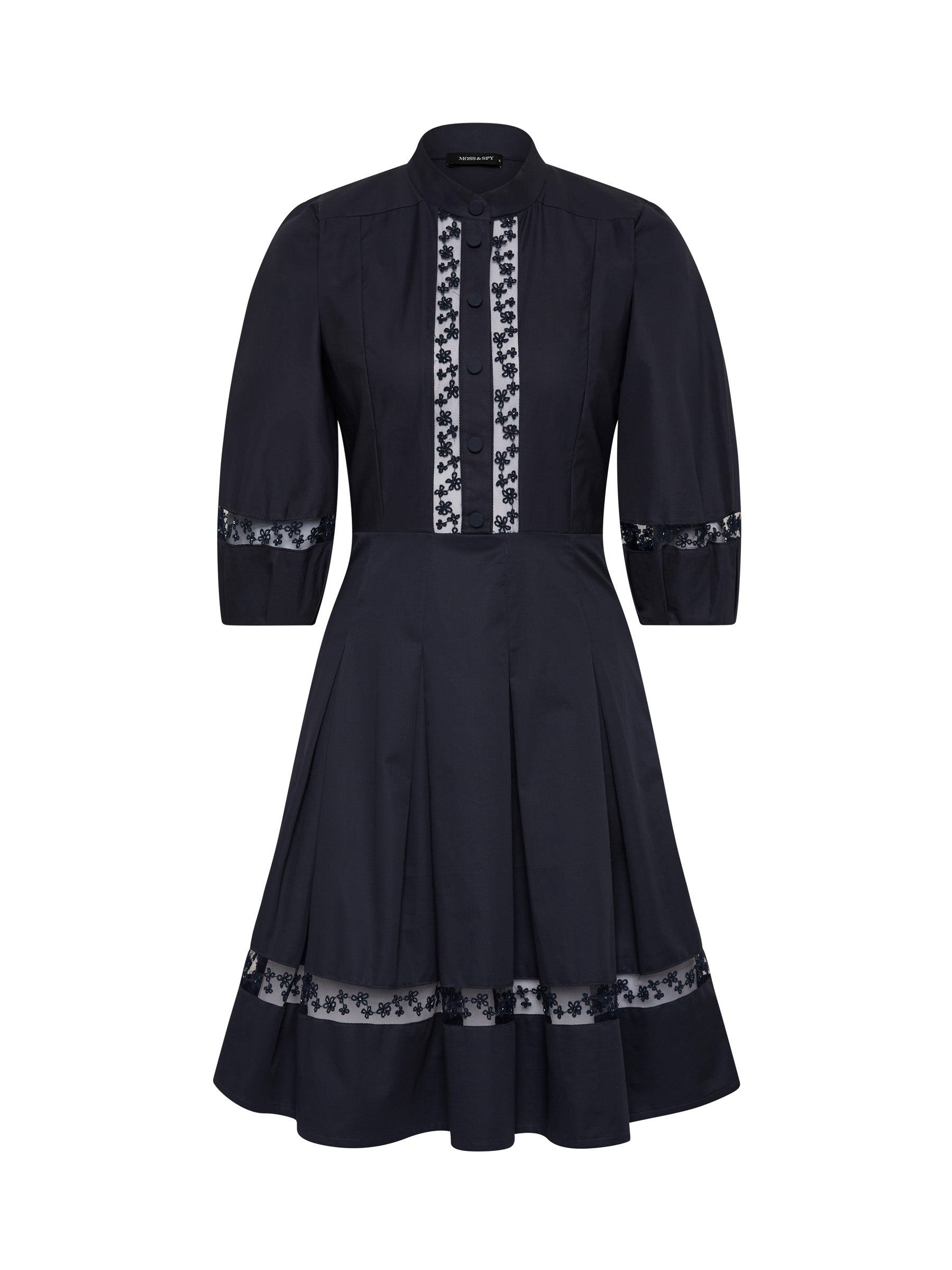 The perfect shirt dress to take you from day to night. The Olivia Short Dress features sheer tulle panels embroidered with a delicate floral motif and subtle beading along the centre front, above the hem and on the edges of the sleeves. The rich navy cotton poplin is fitted through the bodice and waist with an open collar, centre front button closure and elbow length sleeves. The pleated full skirt finishes just above the knee, creating a cool, relaxed look.