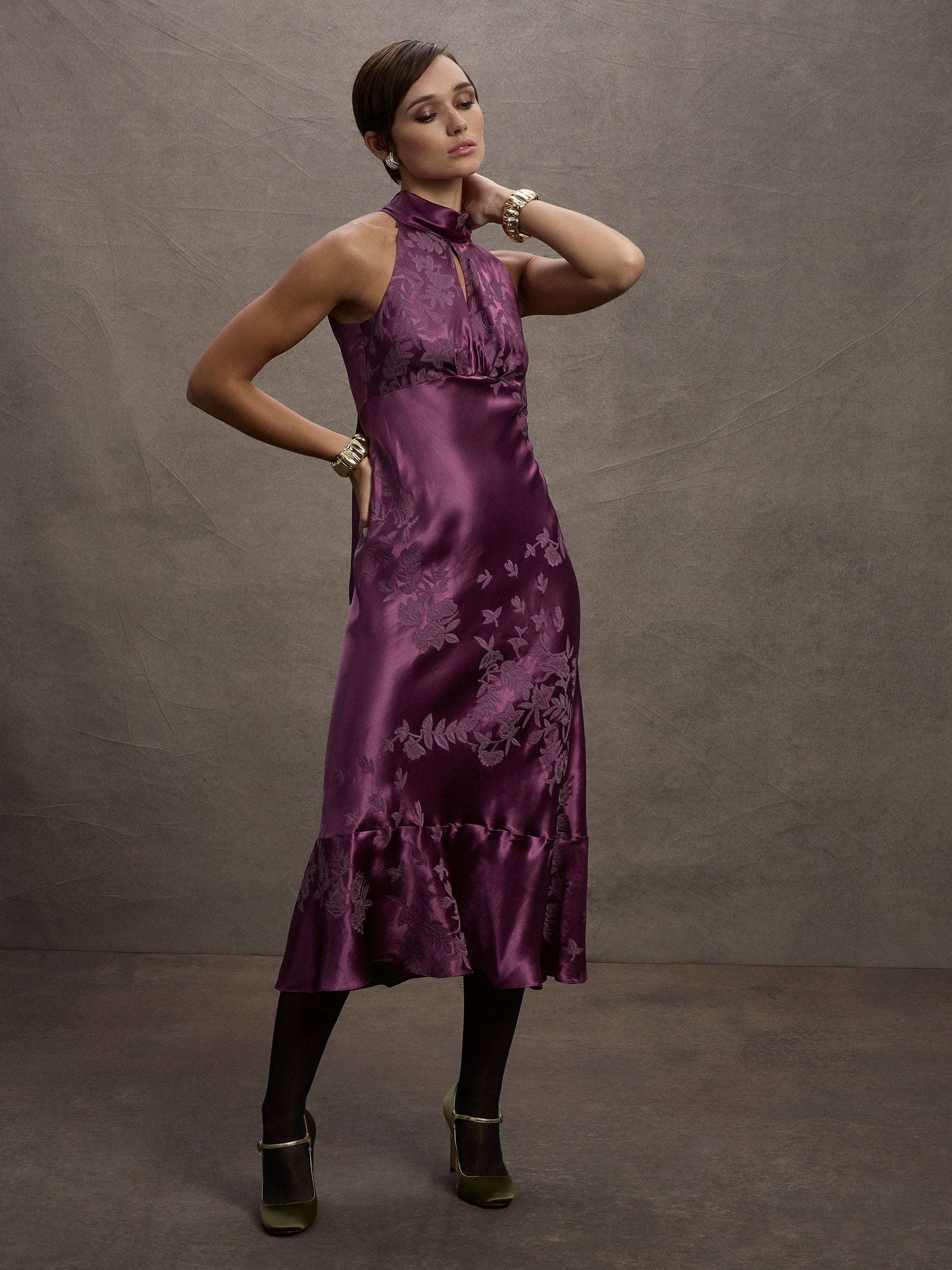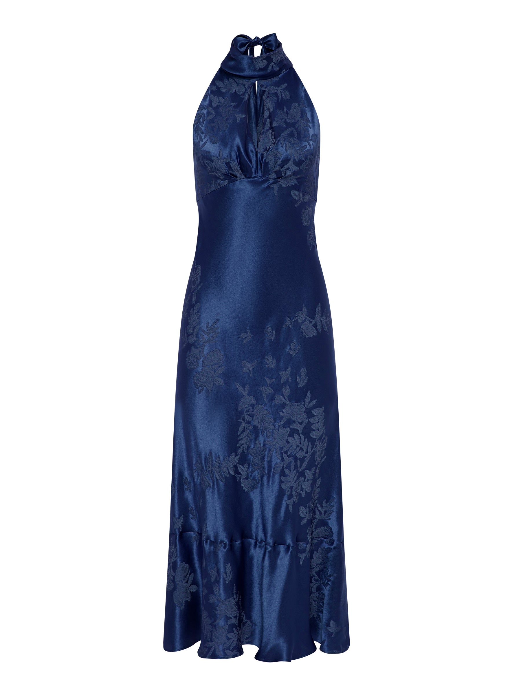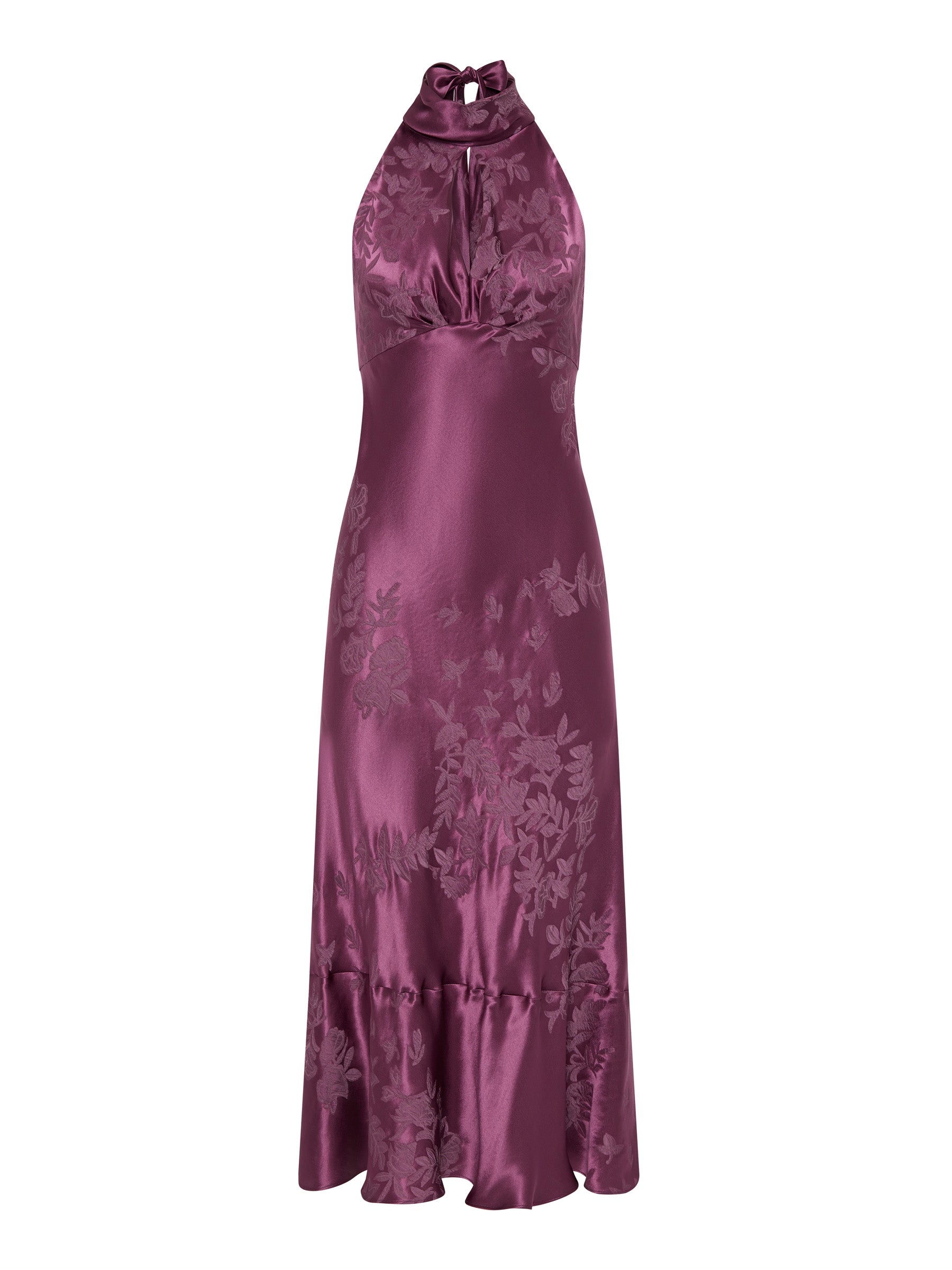 The subtle, yet striking floral motifs of the Primrose Sleeveless in a silk blend jacquard will leave a lasting impression at your next cocktail party or special event. Choose from either rich plum or royal blue to add to your trans-seasonal wardrobe. Fitted through the bodice with a cut away armhole, under bust seam and keyhole opening it secures with adjustable ties at centre back and falls to an A-line flounce hem, finishing at mid-calf.