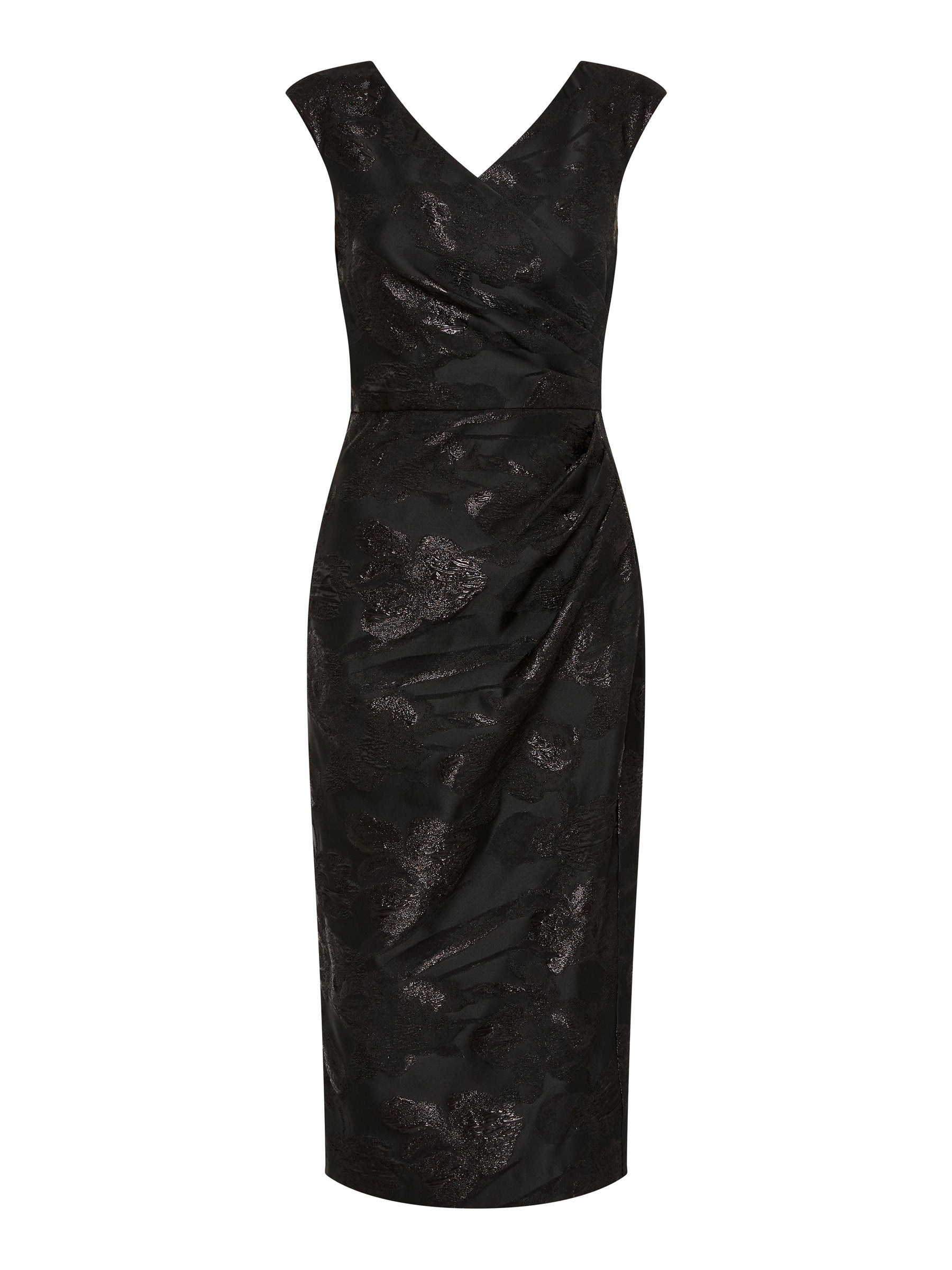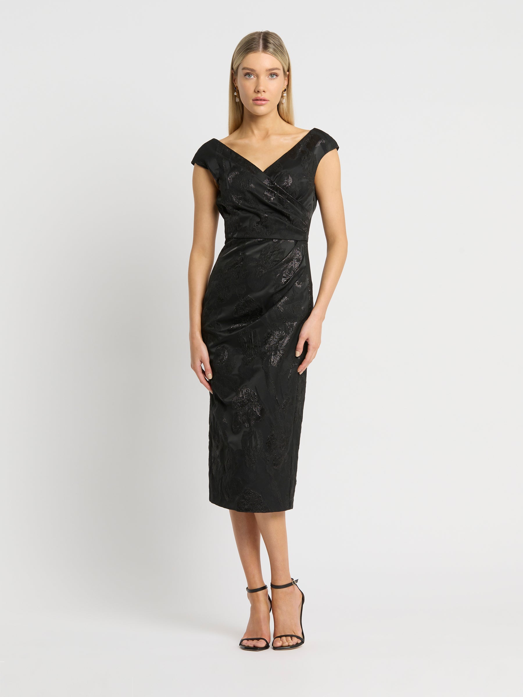 The Remy Dress, cut from a deluxe Jacquard is the perfect statement dress for cocktail and formal events. This dress features a wide V-Neckline front and back with tucks at the side front to give you a flattering fit. For added detail, the Remy Dress has a centre back split at the hem and finishes at mid-calf. Style this elegant, body fitting dress with your favourite pair of classic heels.
