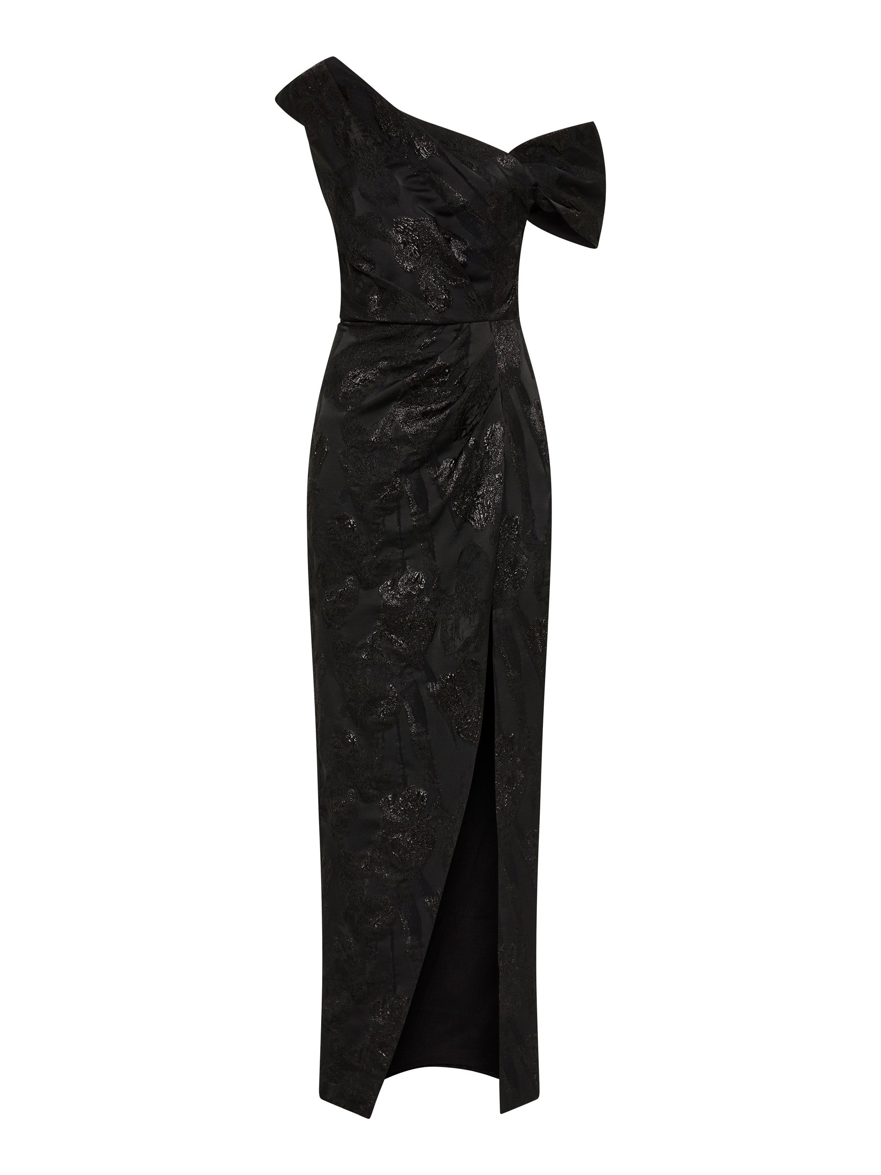 The Remy Gown is a dress sure to stun. Crafted from a deluxe Jacquard fabrication in black, this dress features a side front split starting from just above mid-thigh and an off-the-shoulder sleeve. For added detail this dress has front side tucks giving a flattering hourglass shape with the skirt tapering in at the sides finishing just above the ankle. The Remy Gown is an exquisite piece perfect for formal events.