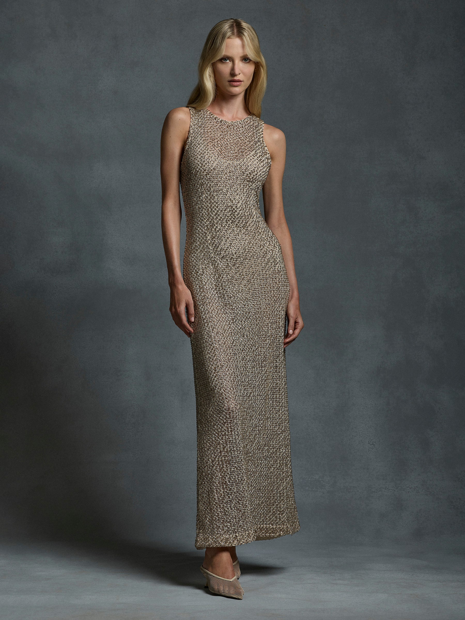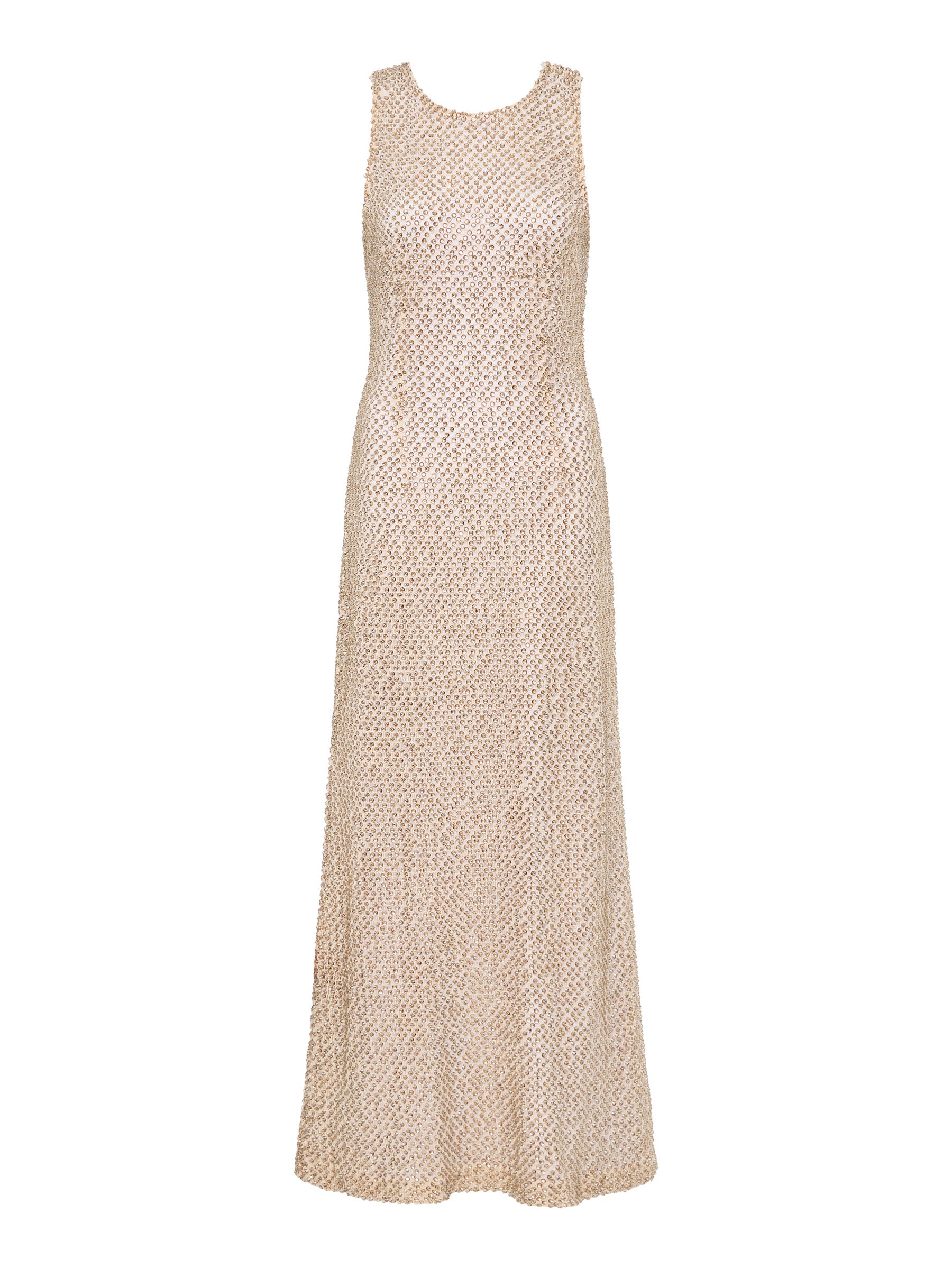 The Sabine Gown is heavily beaded with pale gold glass beads on a cream cotton netting. Fitted to the body falling to a slight A-line shape, finishing at maxi length. It also comes with a matching jersey slip. A real showstopper for your next formal or black-tie event.