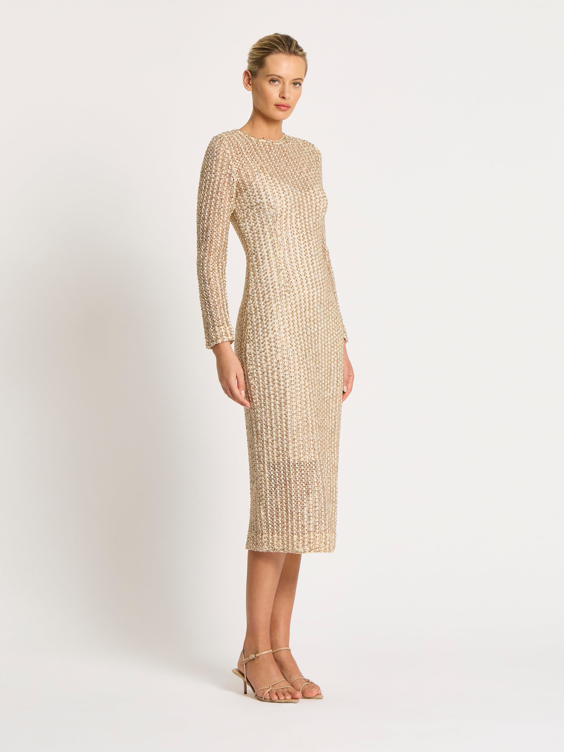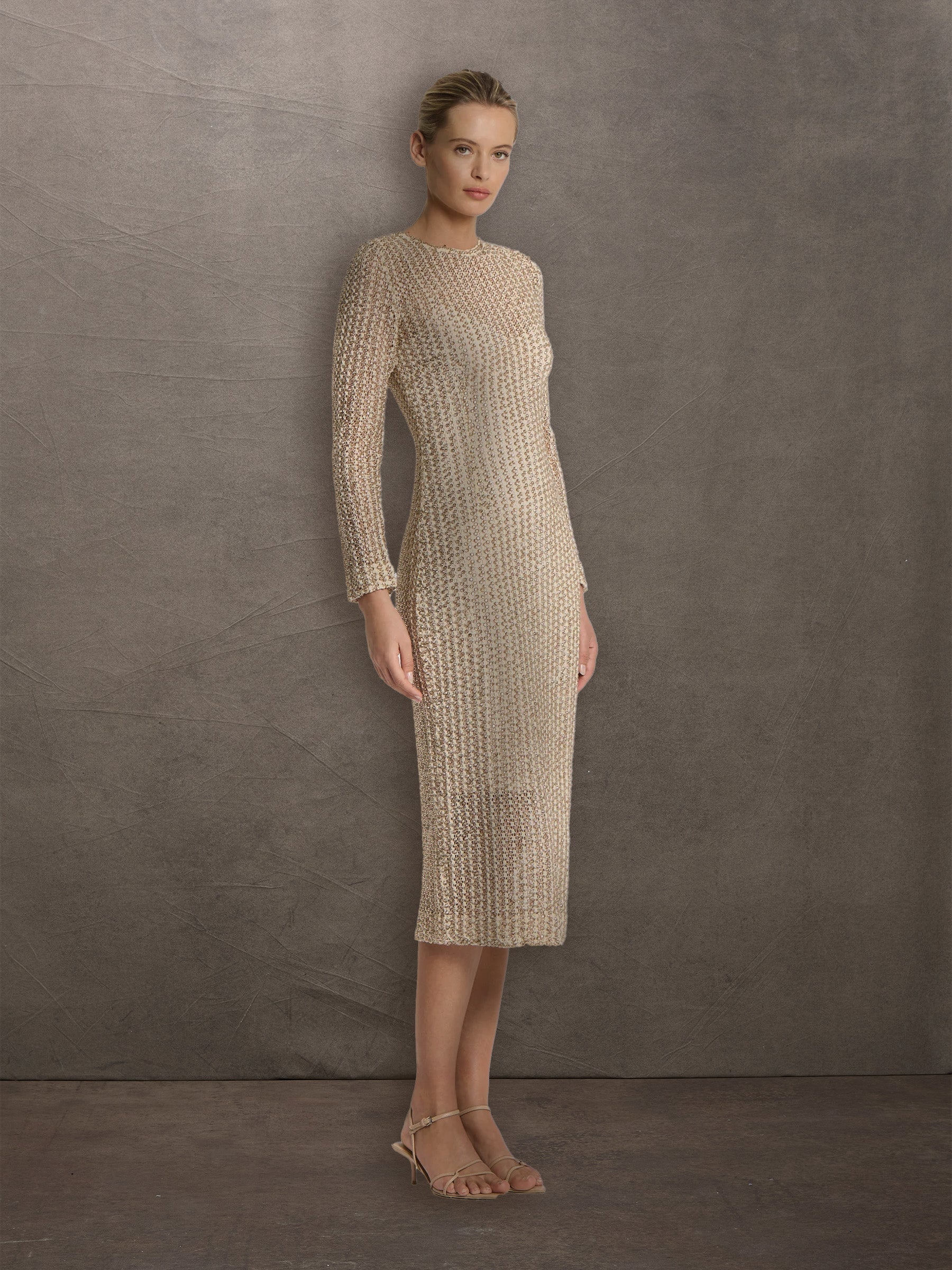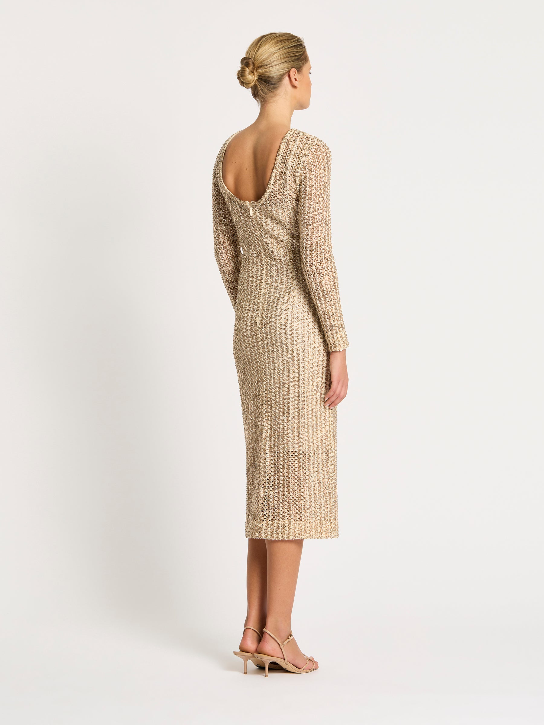 The Sabine Midi is heavily beaded with pale gold glass beads on a cream cotton netting. Fitted to the body falling to a shift silhouette, finishing at mid-calf. It also comes with a matching jersey slip. A real showstopper for your next formal or black-tie event.