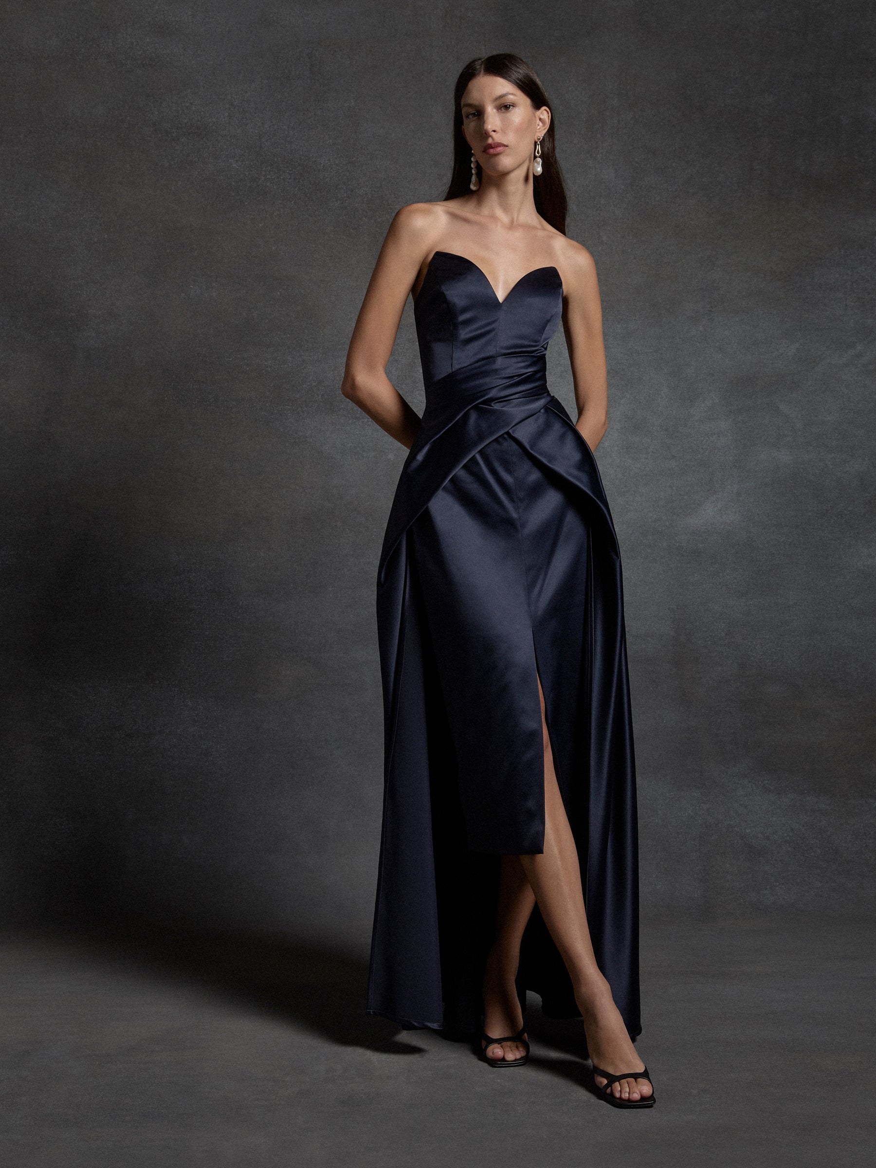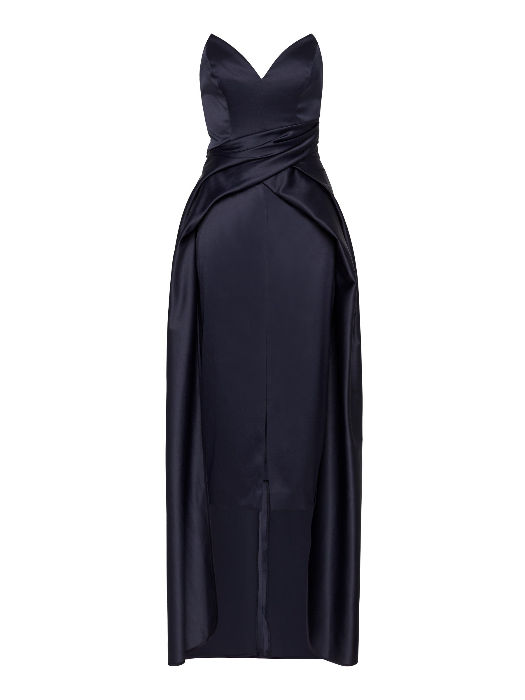 The Sephora Gown is a beautiful and elegant strapless gown, with a sweetheart V-neckline. This silhouette is fitted through the bust and waist and features an A-line skirt overlay with tucks and draping attached at the waist seam. The bodice is structured with boning on the side seams. The Sephora Gown is a perfect statement piece, ideal for your next black-tie event.