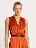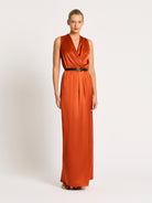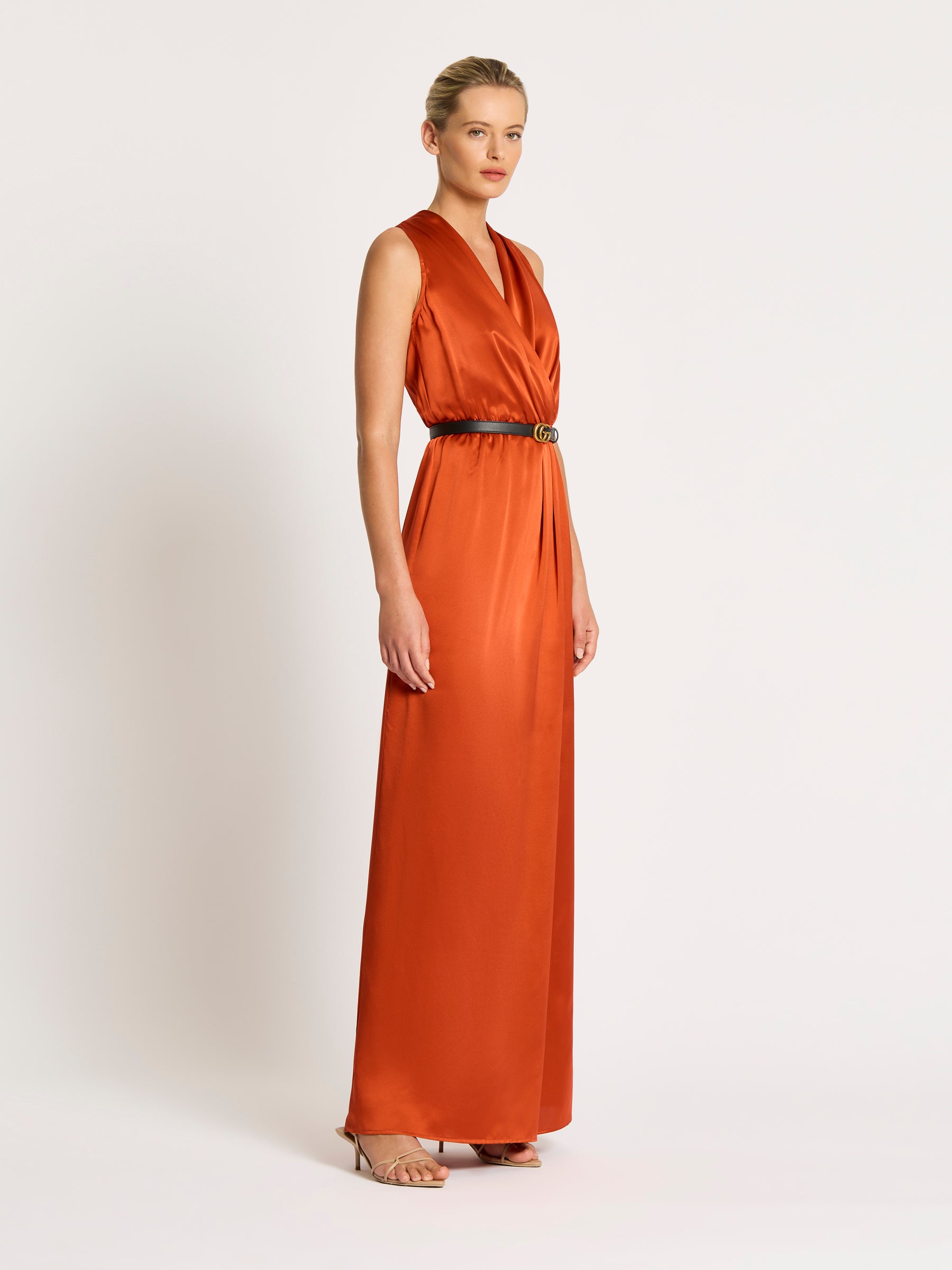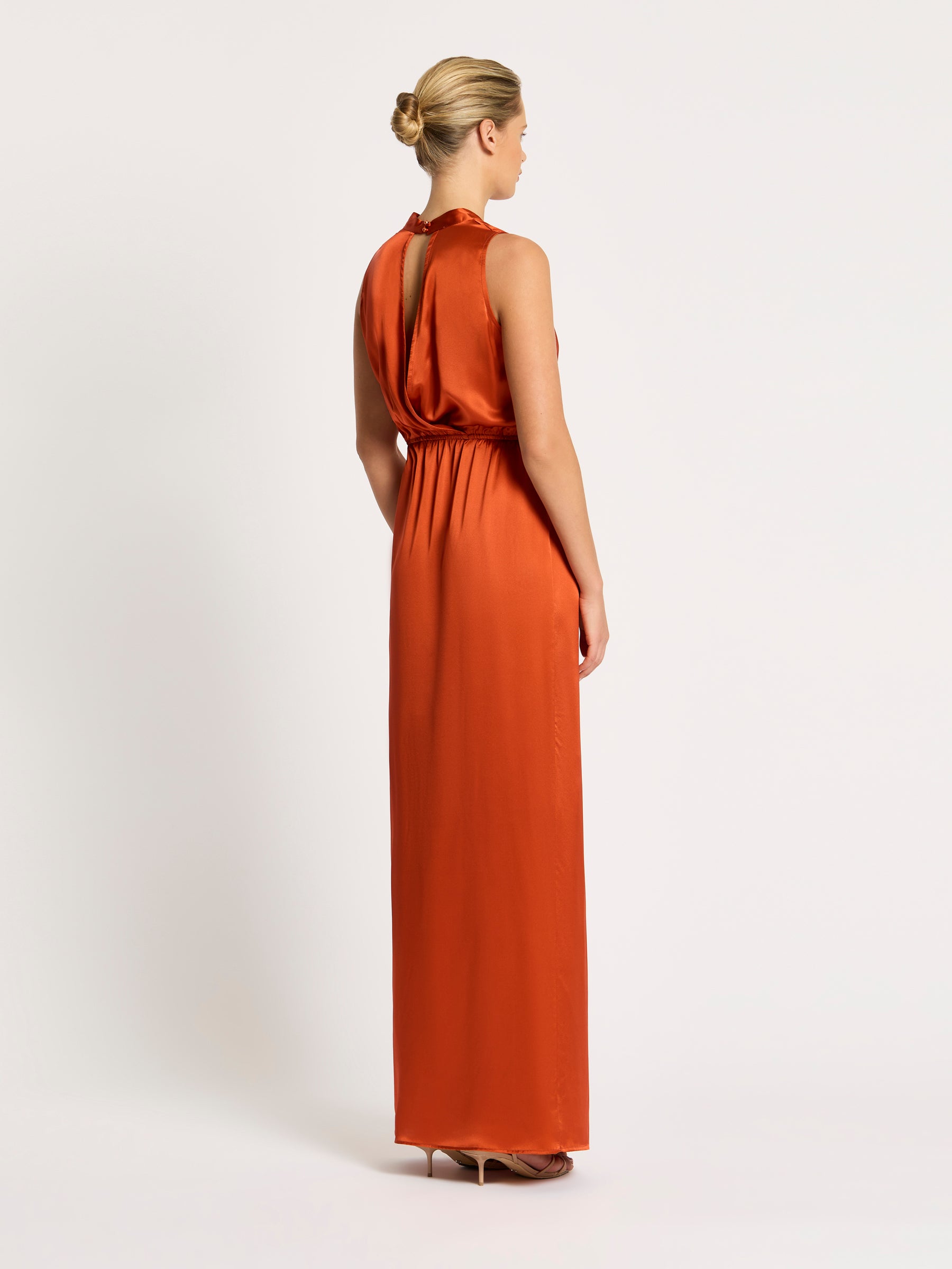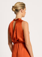 The Adele Gown is crafted from a luxurious silk satin, featuring a draped cross-over bodice leading to an elasticated waist. A classic design with a front hidden split, the Adele Gown also has a cross over bra-friendly back with gold button closure at the back neck. A perfect summer dress for your elegant events, with a great pair of heels or designer sandals.