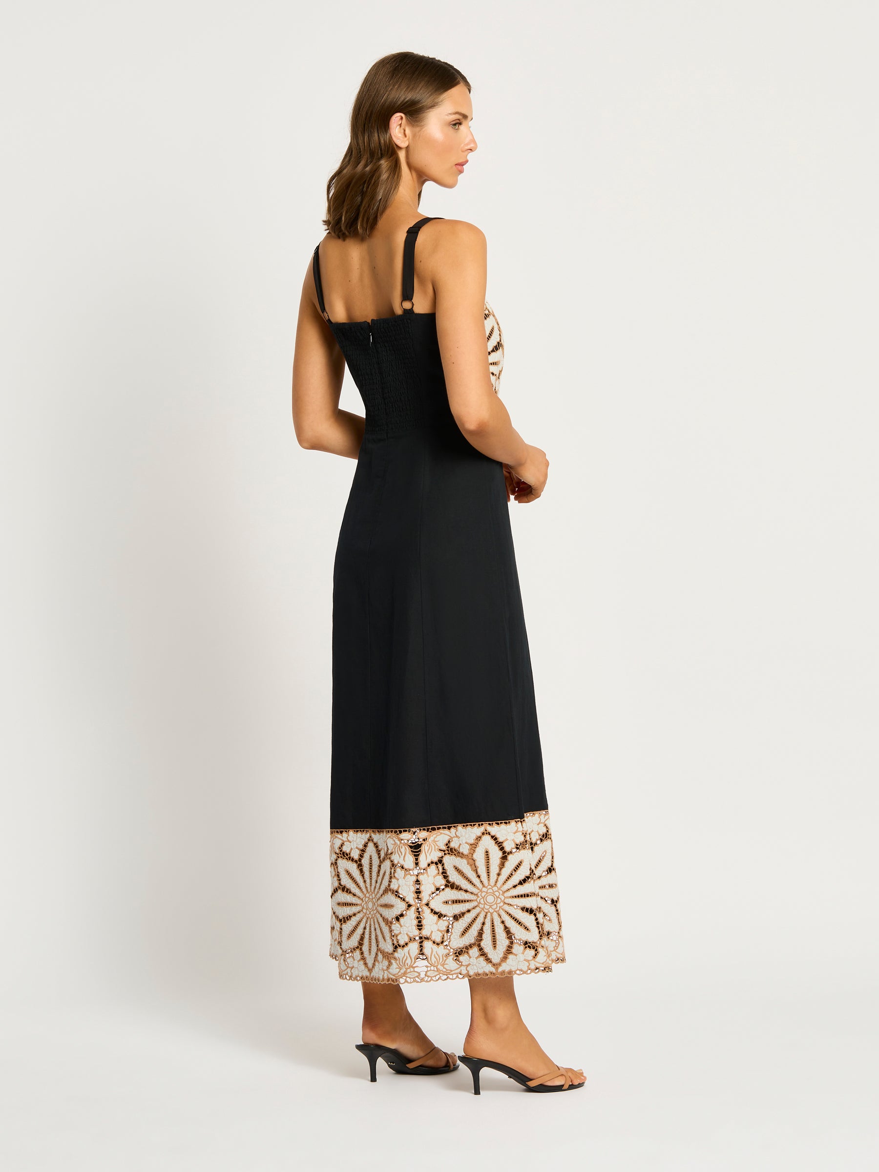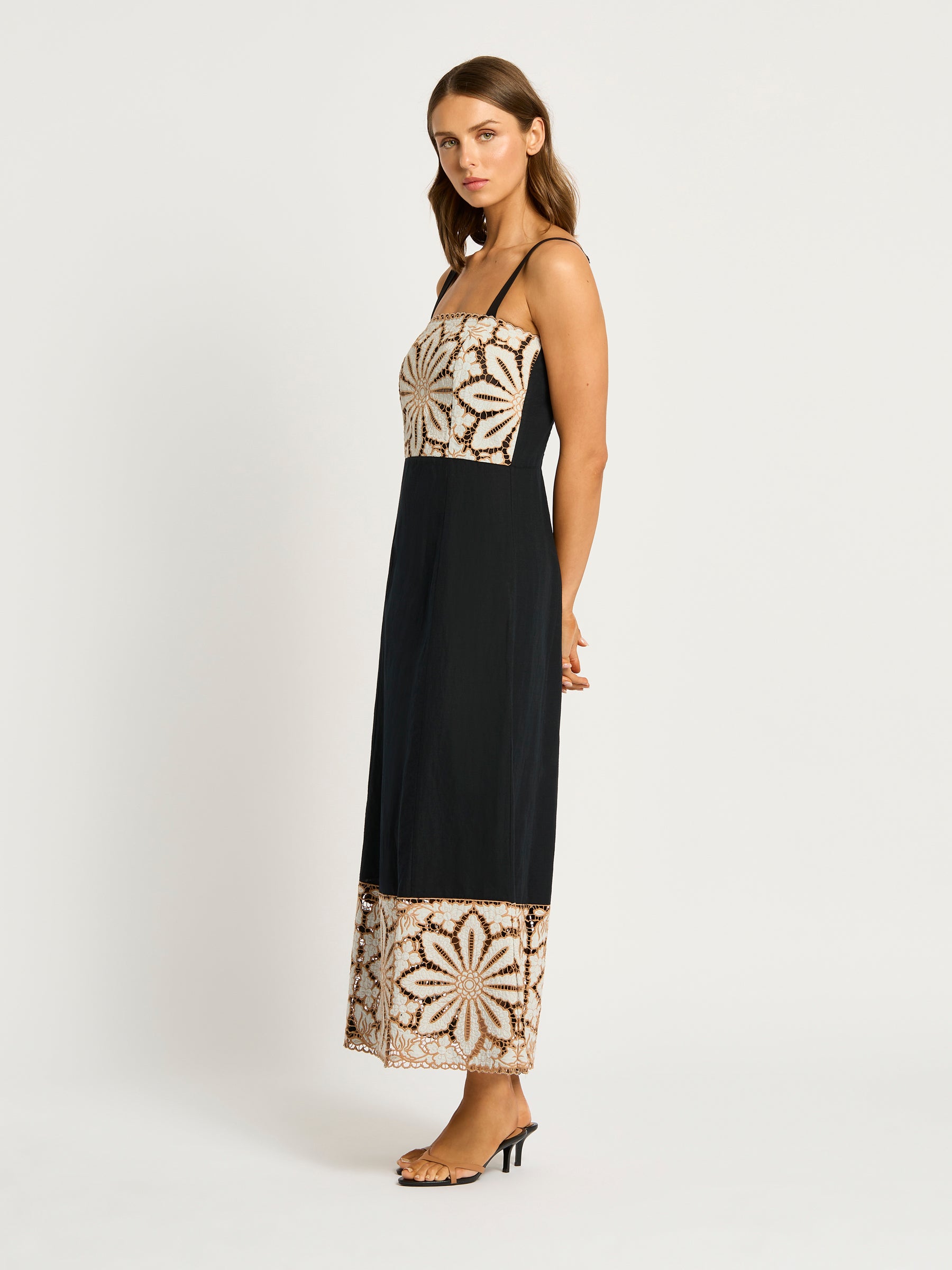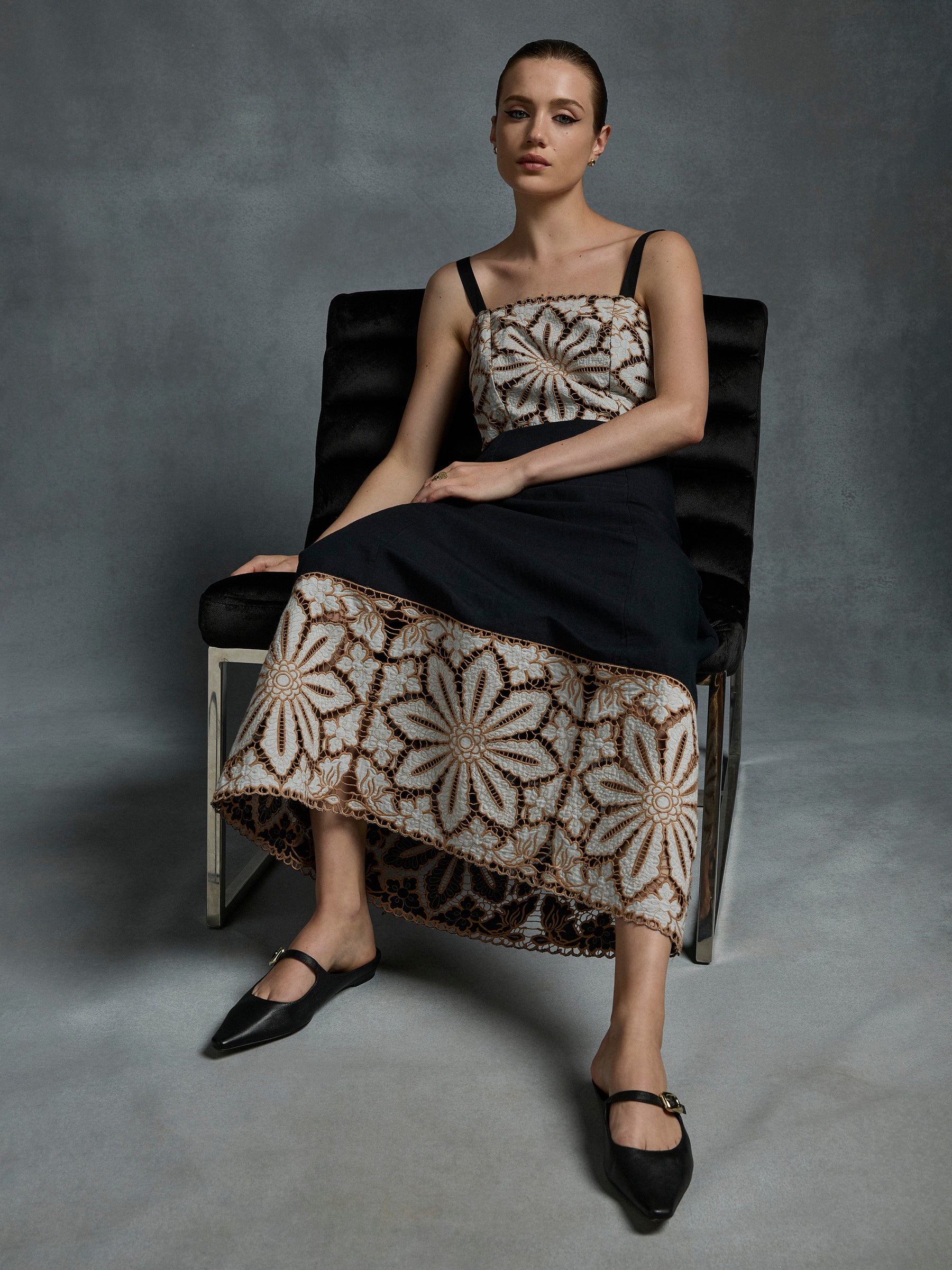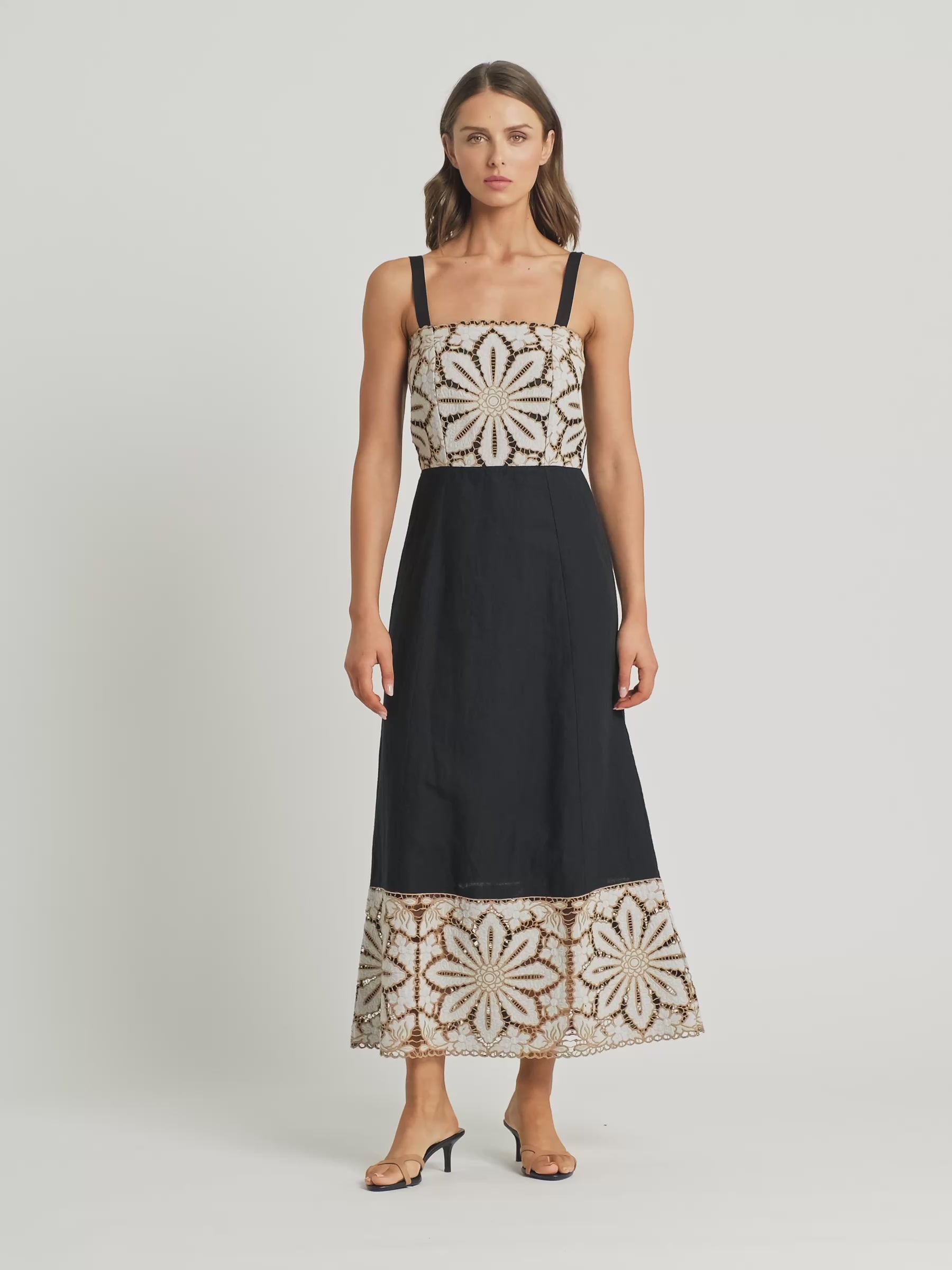 The Alma Maxi is crafted from a lightweight linen/cotton fabrication with intricate cut out embroidered detailing. Fitted through the bodice, falling into an A-line maxi length with a contrast detailed embroidered hem. Lined at the bodice with a centre back zip, it also features shirring at centre back for comfort and ease. An effortless, chic, staple piece that can be worn day to night.