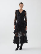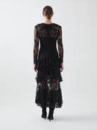 Delicate and expressive, the Antoinette Dress is crafted from black scalloped lace with cascading frill detailing. The silhouette moves into a soft full-length skirt, creating fluidity and depth. Designed for day-to-evening wear with a romantic finish.