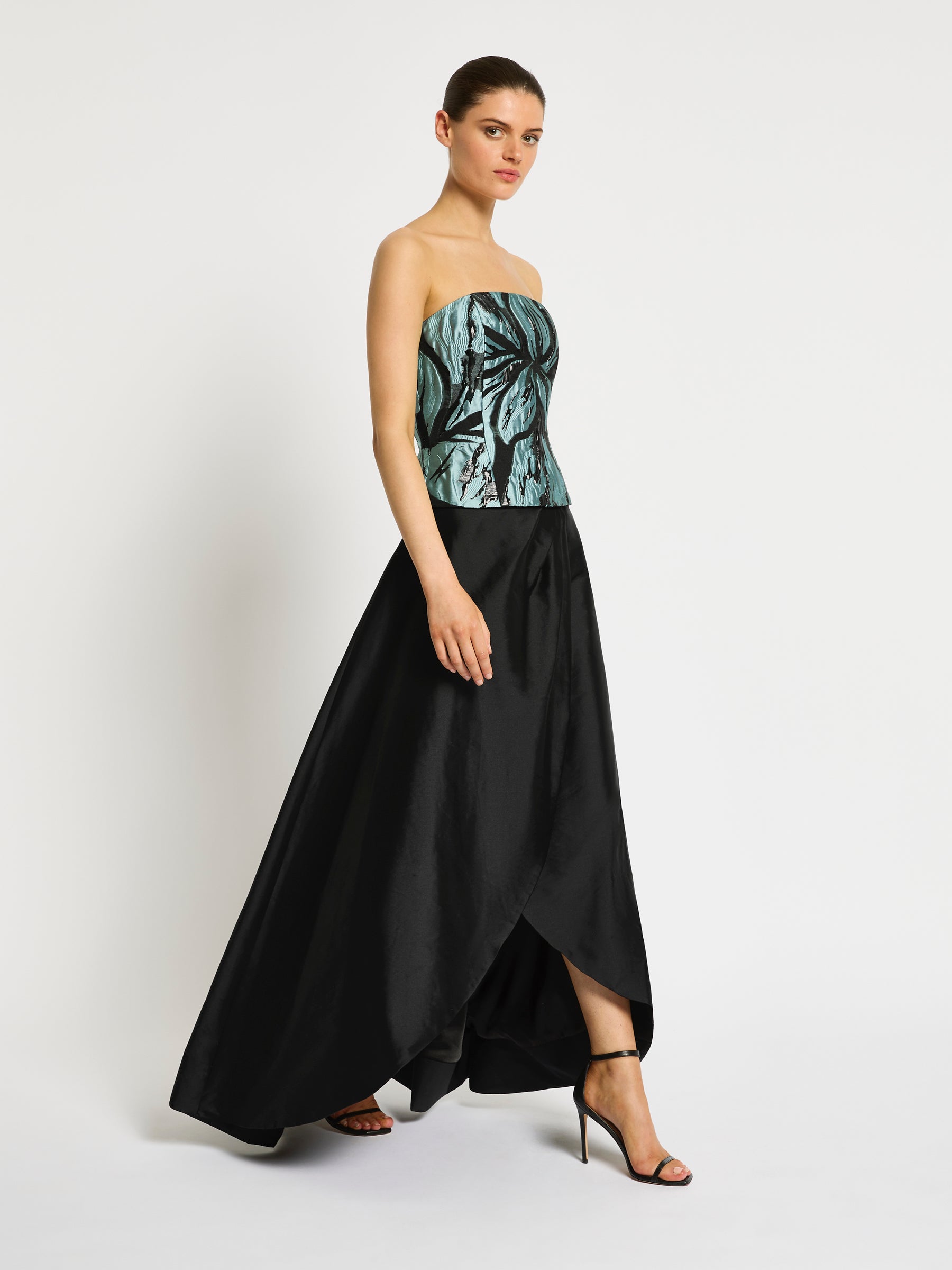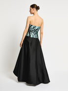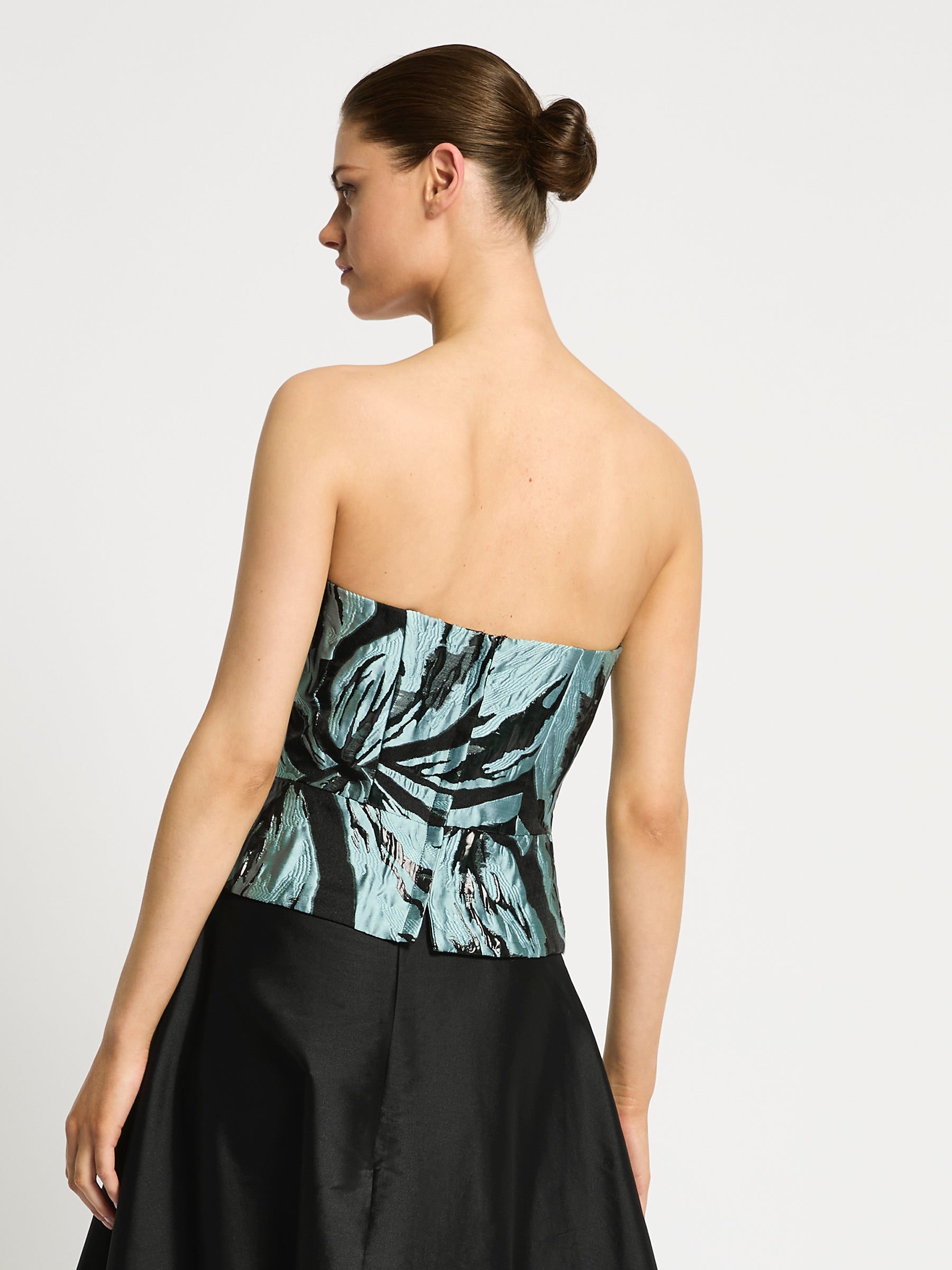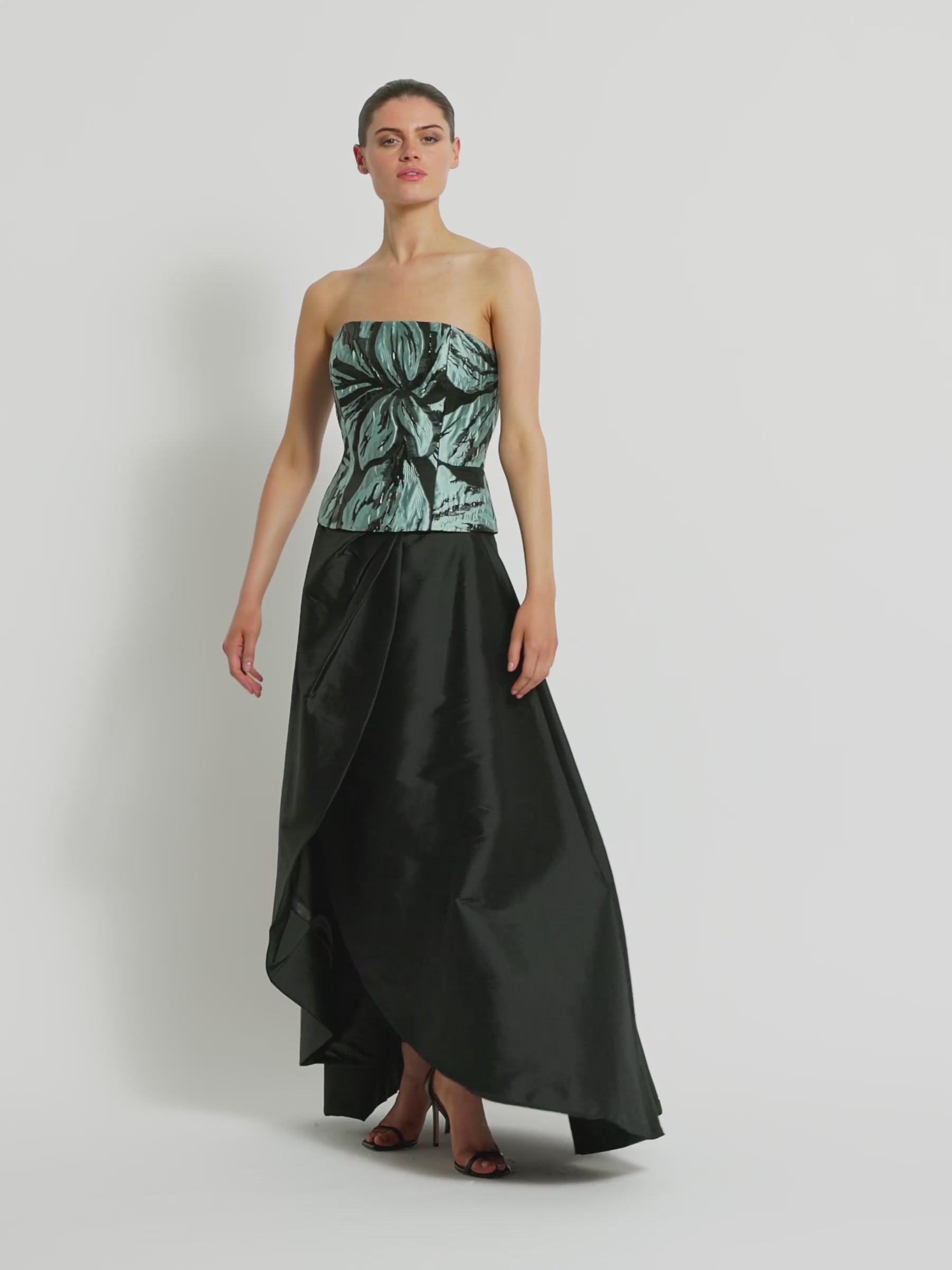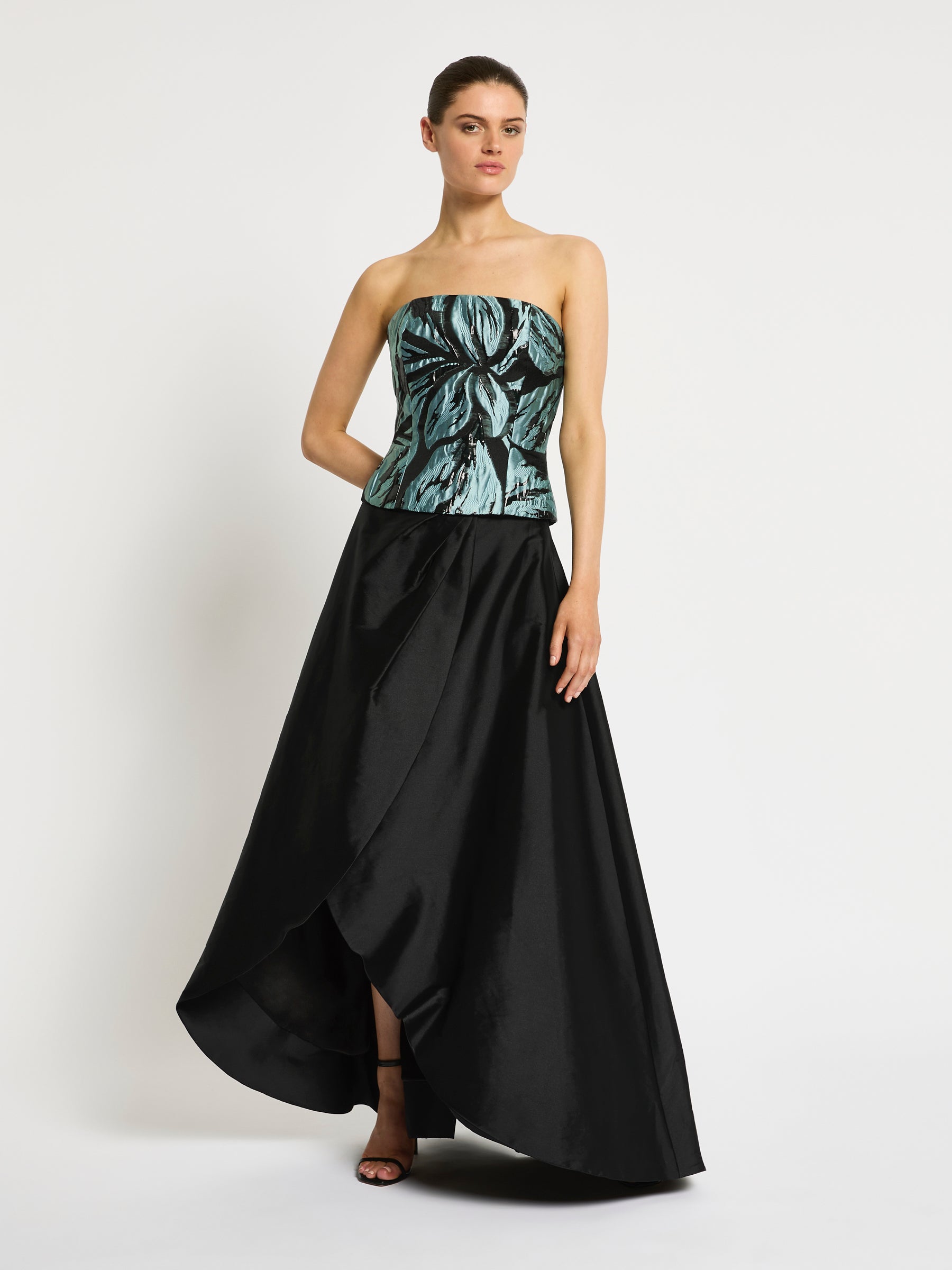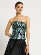 The Bella Bustier is a true statement piece, featuring a mint blue floral design with subtle metallic highlights, crafted on a contrasting black organza jacquard. This strapless bustier is fully lined and structured with boning through the bodice to create a fitted silhouette. Pair with the Rene Skirt for an effortlessly bold look, perfect for any cocktail event.