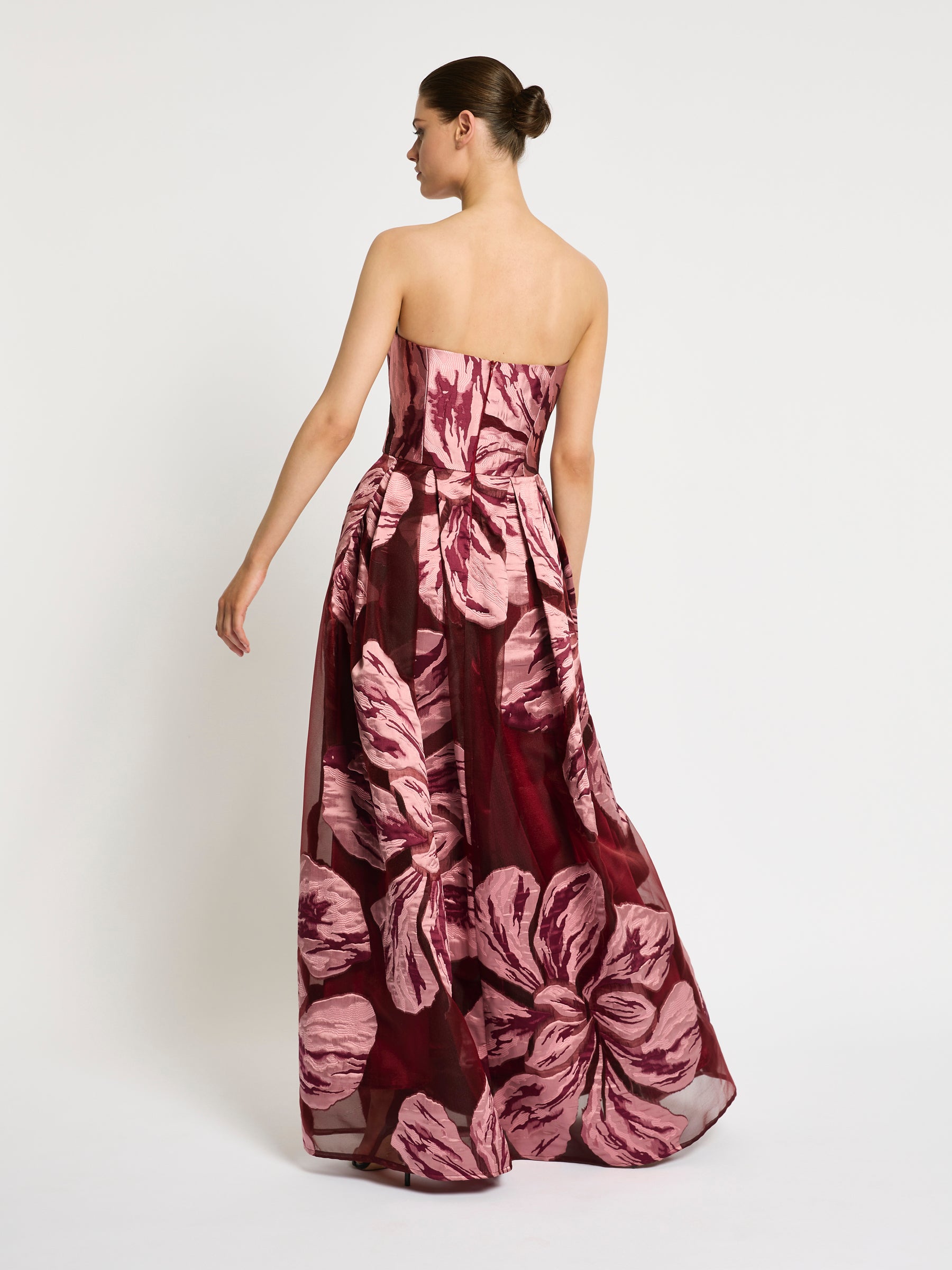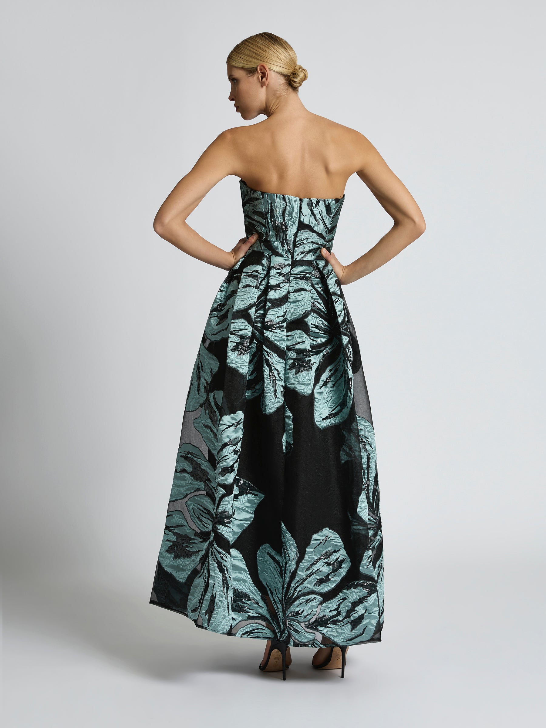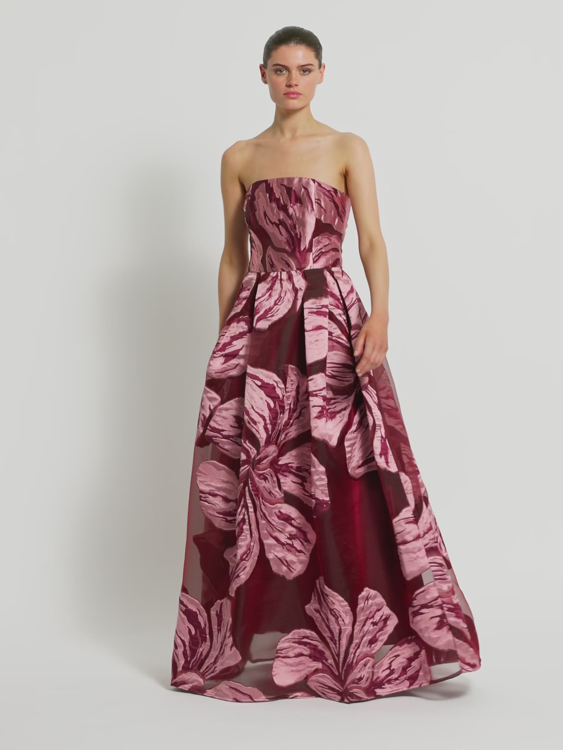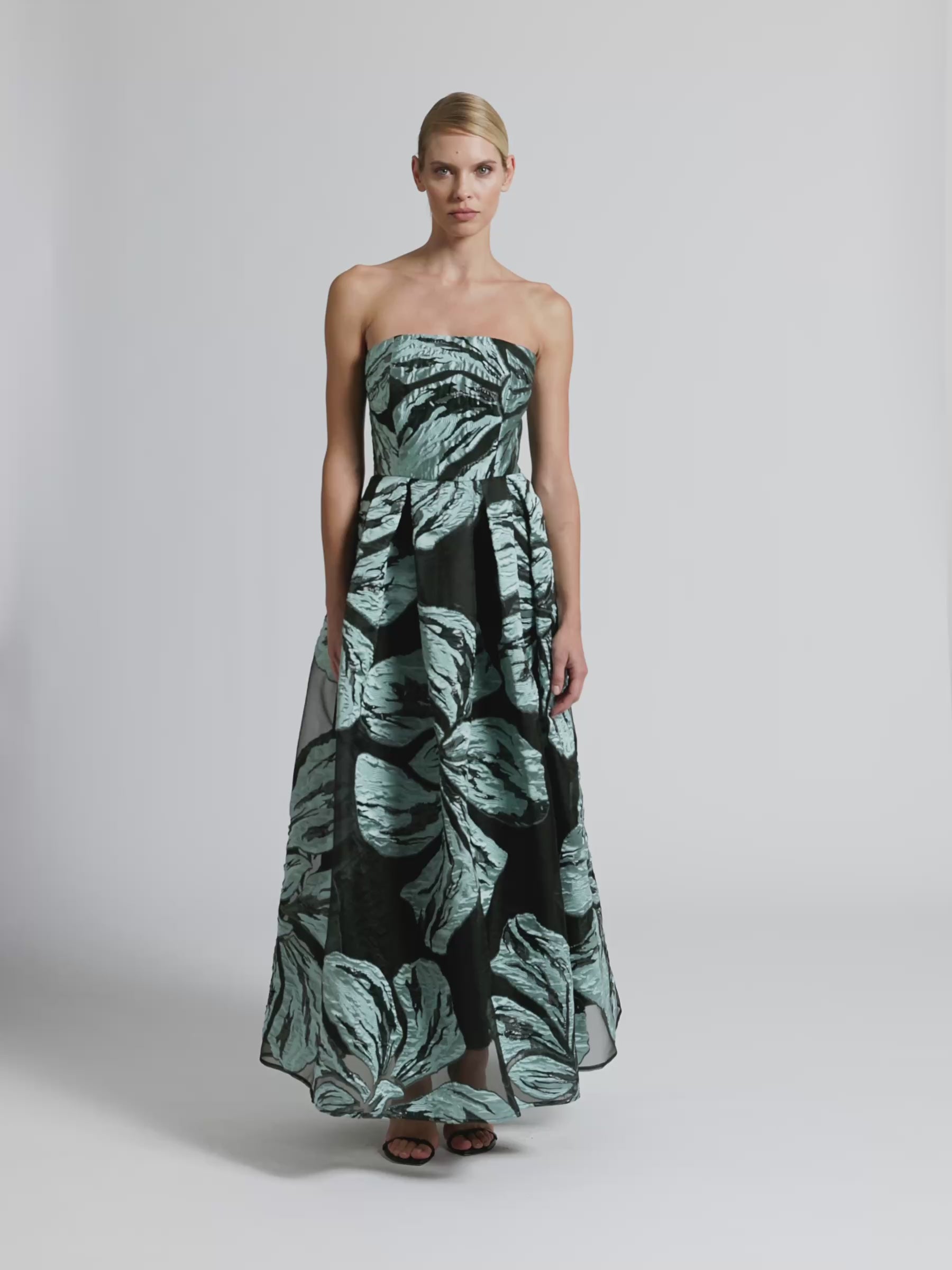 Be the Belle of the Ball in the Bella Gown. Crafted from an organza jacquard with a contrasting floral design, meticulously placed to flatter the body. Fitted through the bust and waist, enhanced with boning in the bodice for structure falling to a maxi length tucked A-line skirt, fully lined in a matching satin.