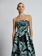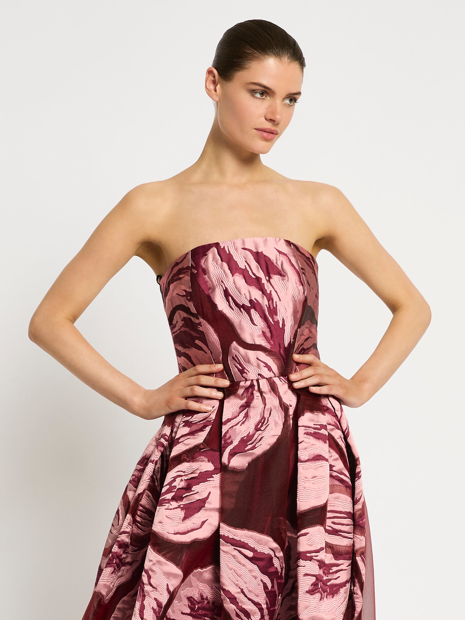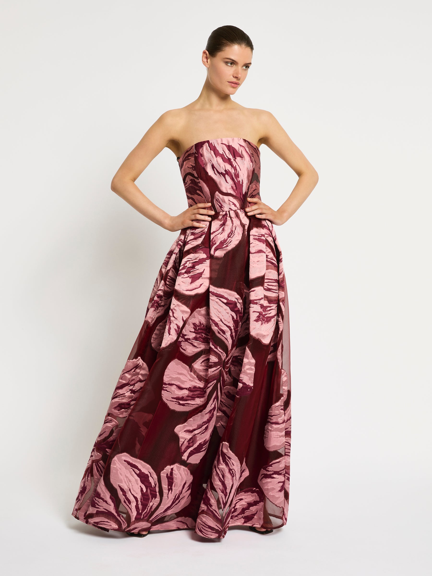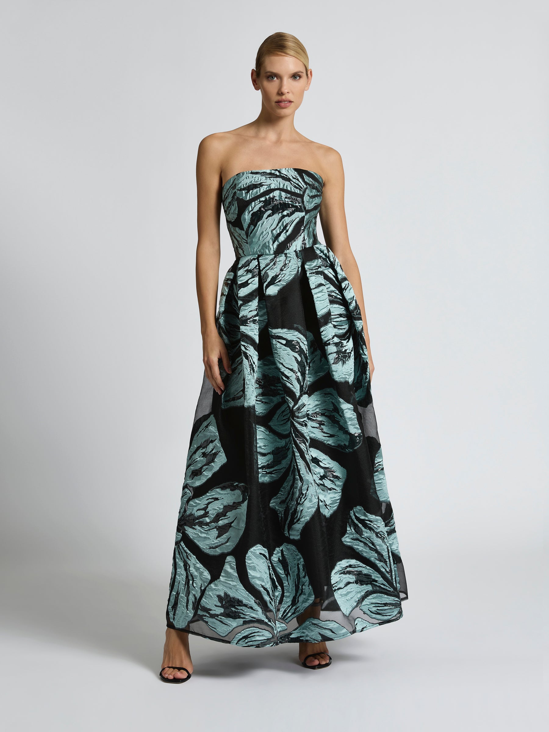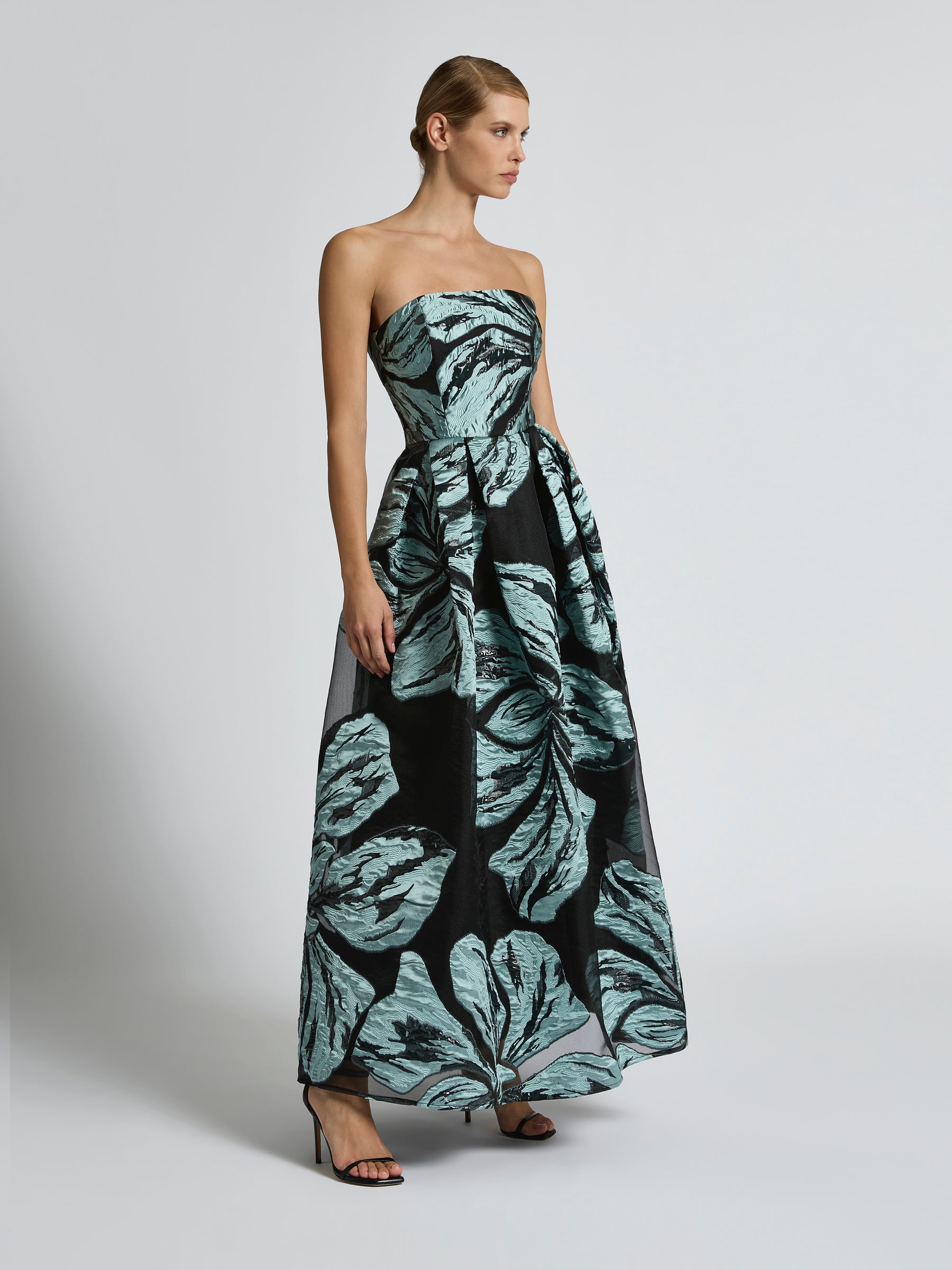 Be the Belle of the Ball in the Bella Gown. Crafted from an organza jacquard with a contrasting floral design, meticulously placed to flatter the body. Fitted through the bust and waist, enhanced with boning in the bodice for structure falling to a maxi length tucked A-line skirt, fully lined in a matching satin.