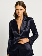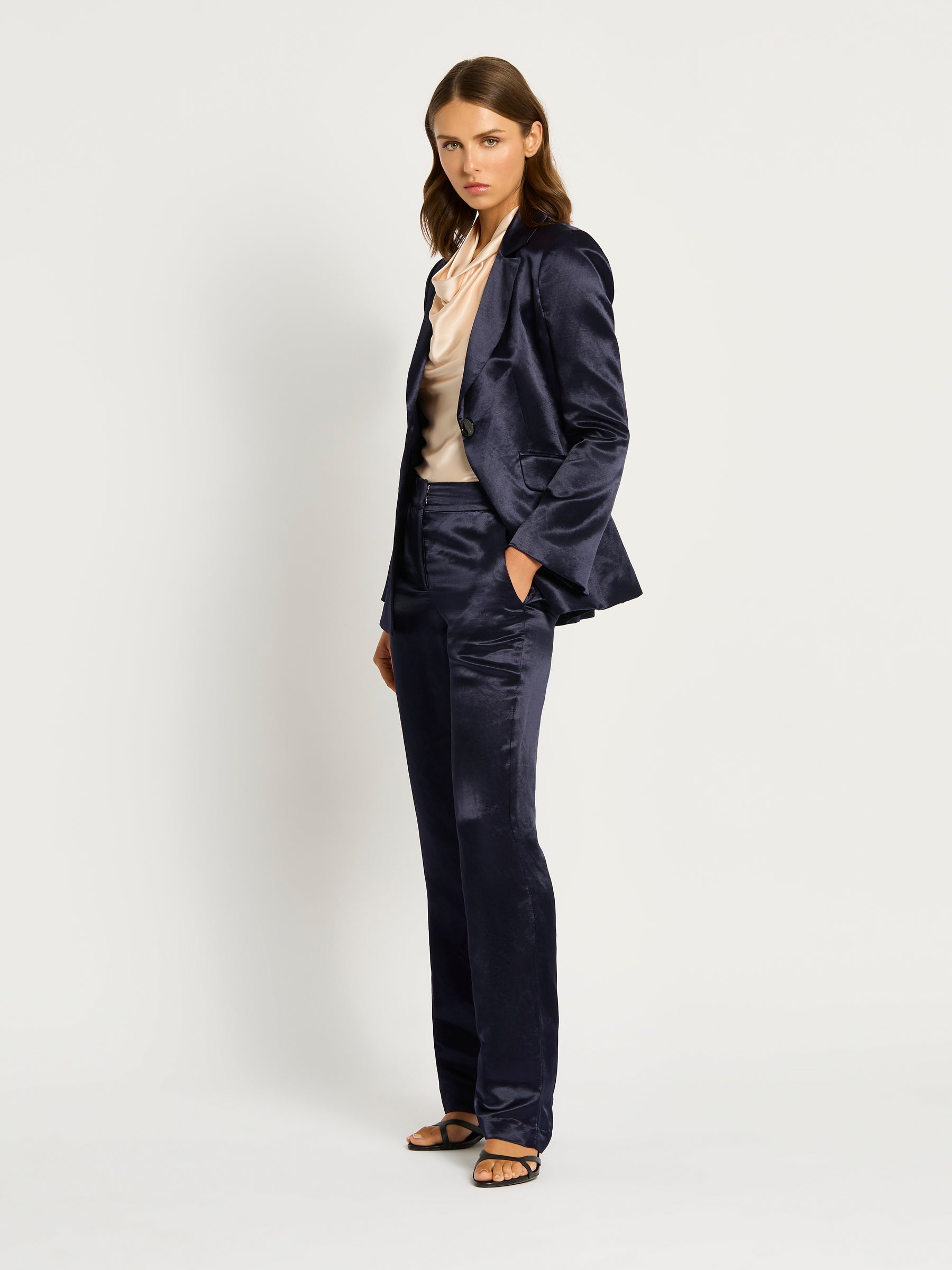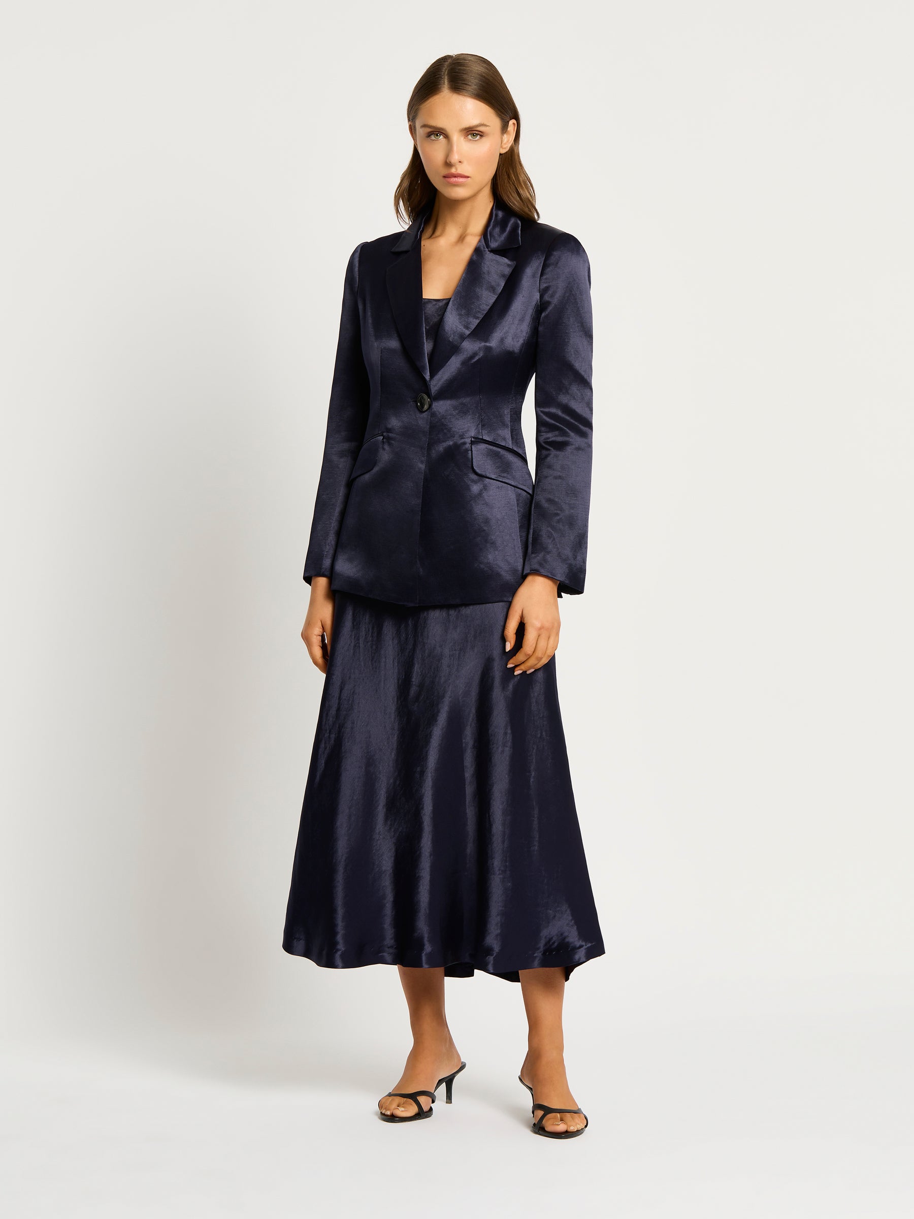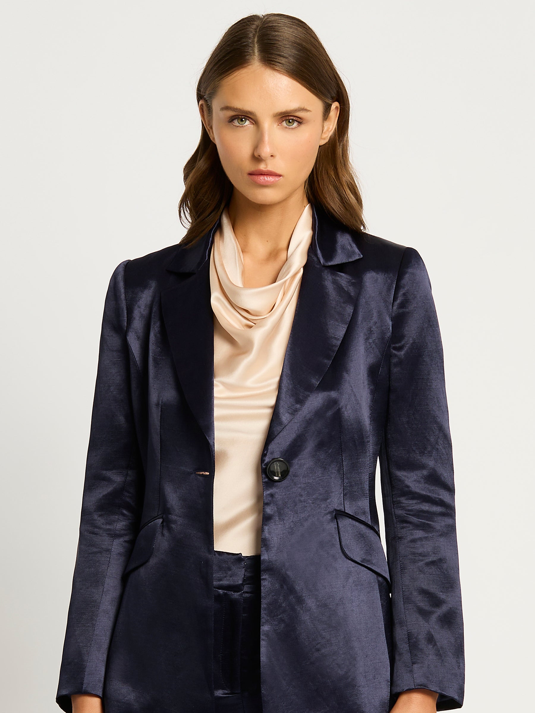The Bianca Blazer is crafted from a lightweight sateen linen viscose that allows drape whilst being a tailored fit. Designed with paneling to create a slim silhouette, it features a centre back vent for an easy fit over pants and dresses. Features shoulder pads for added structure, creating a tailored look. The Bianca Blazer is secured with a button fastening through the centre front, with functional jet pockets and fully lined with stretch satin.