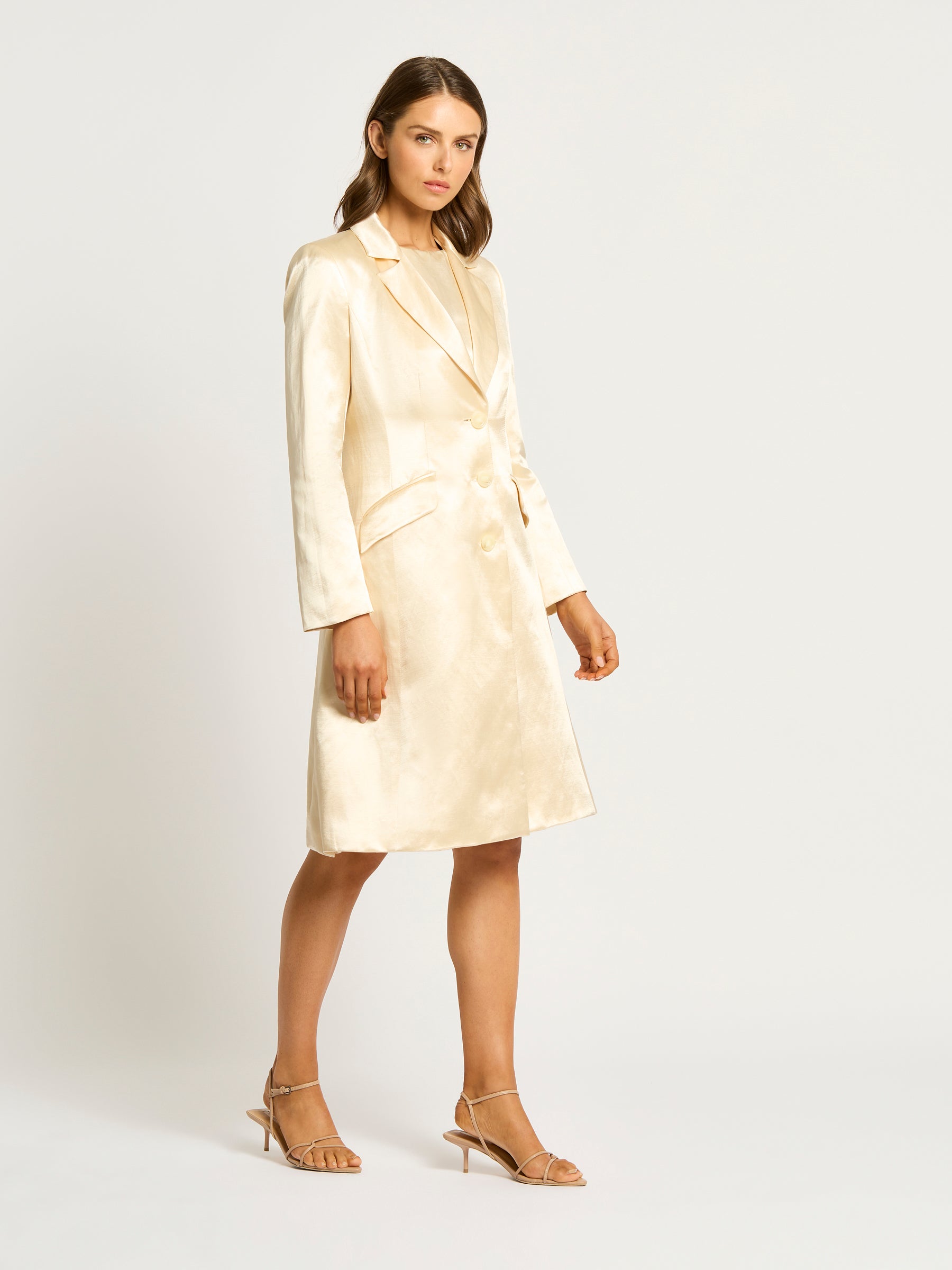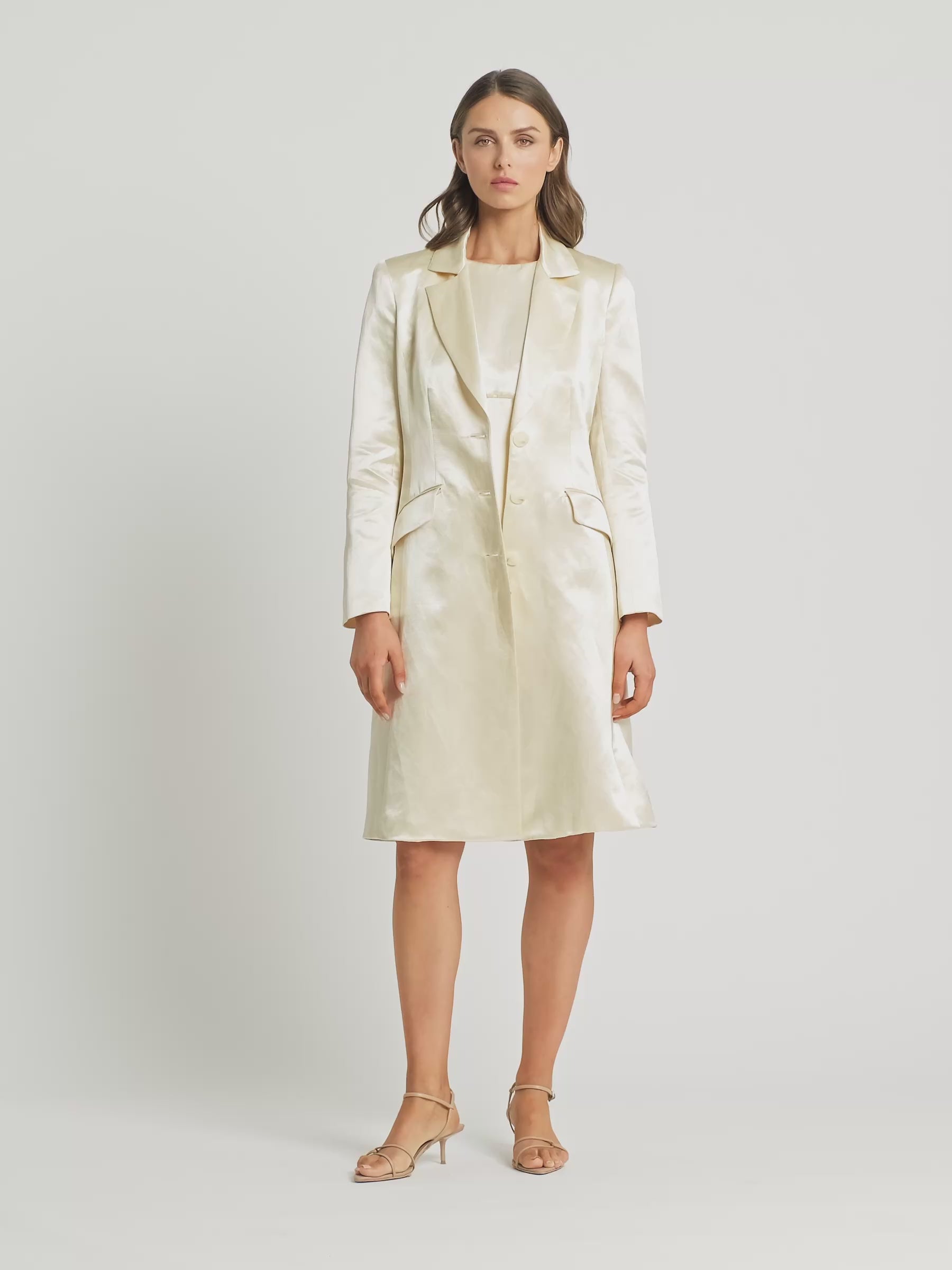 The Bianca Long Jacket is crafted from a lightweight sateen linen viscose that allows drape whilst being a tailored fit. Designed with paneling to create a slim silhouette and features shoulder pads for added structure, creating a tailored look. The Bianca Long Jacket is secured with button fastenings through the centre front, with functional jet pockets and fully lined with stretch satin. Features a centre back vent for an easy fit over pants and dresses. Pair with the Bianca Midi for a complete look.