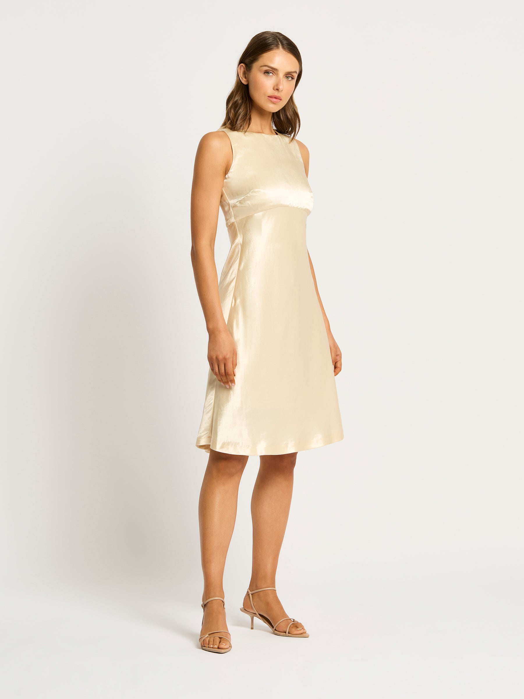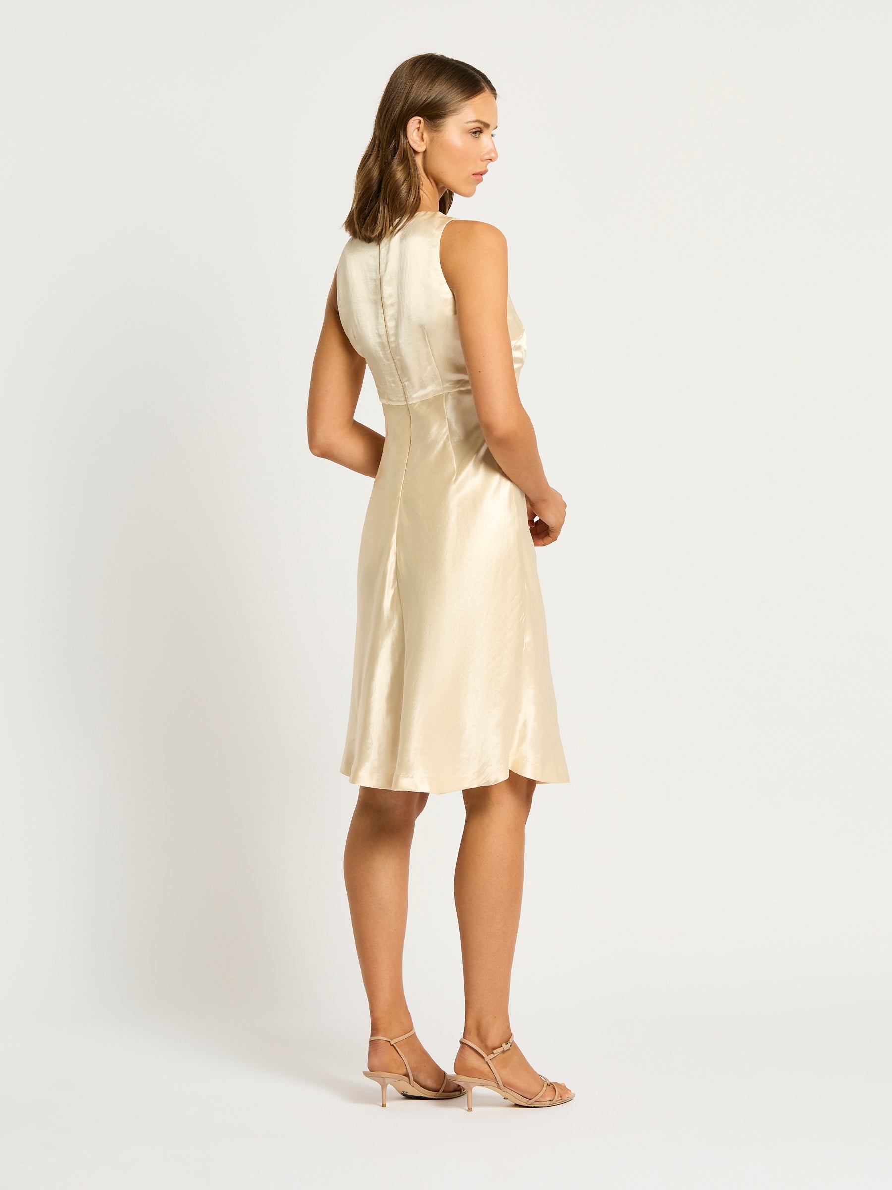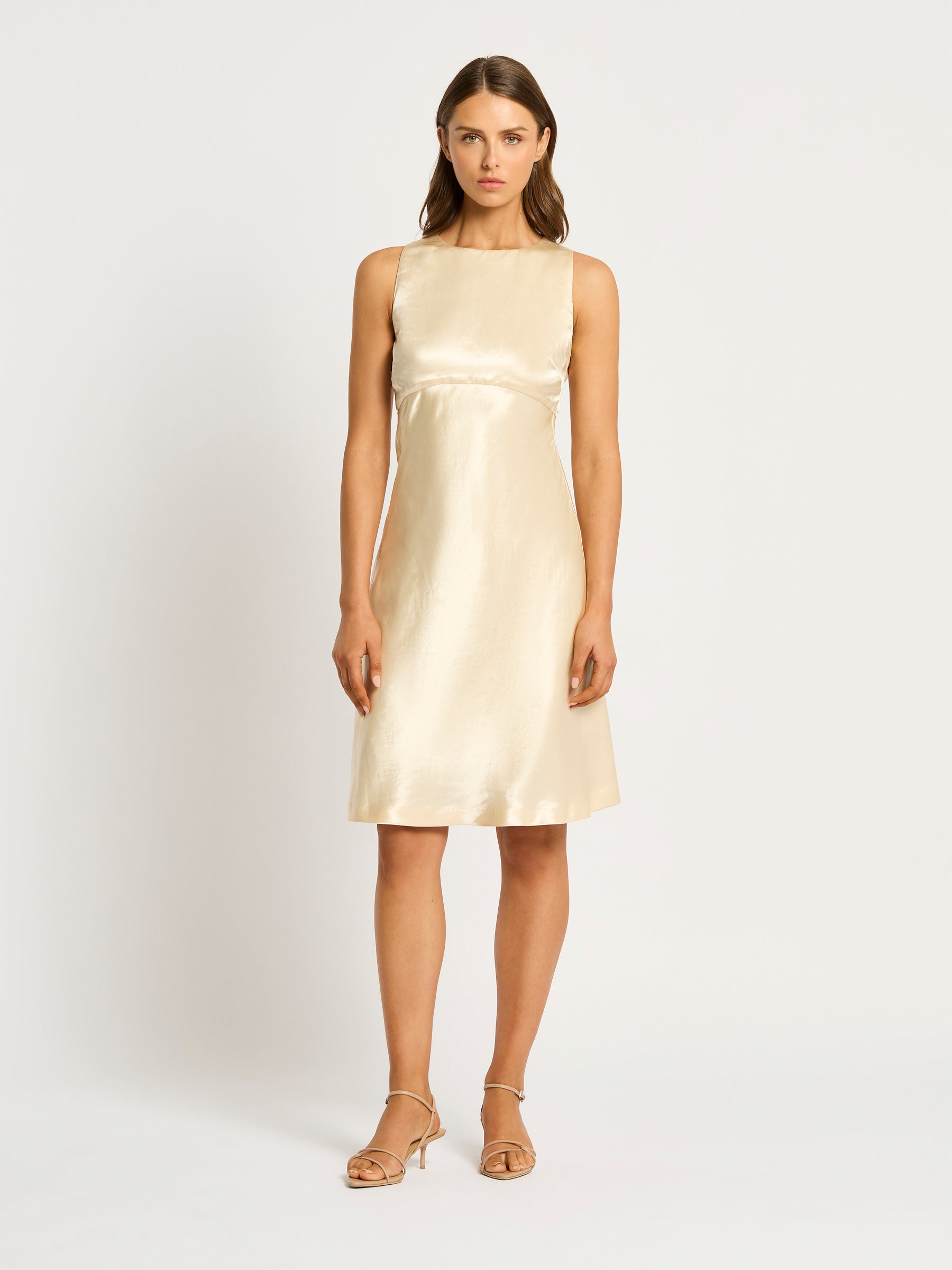 The Bianca Short Dress is crafted from a lightweight sateen linen viscose and cut on the bias to allow for a slight flare. Features an under bust seam falling into an A-line silhouette, finishing on the knee. The Bianca Short Dress is fully lined in a stretch satin and features a centre back invisible zipper. Pair with the Bianca Blazer or the Bianca Long Jacket for a complete look.