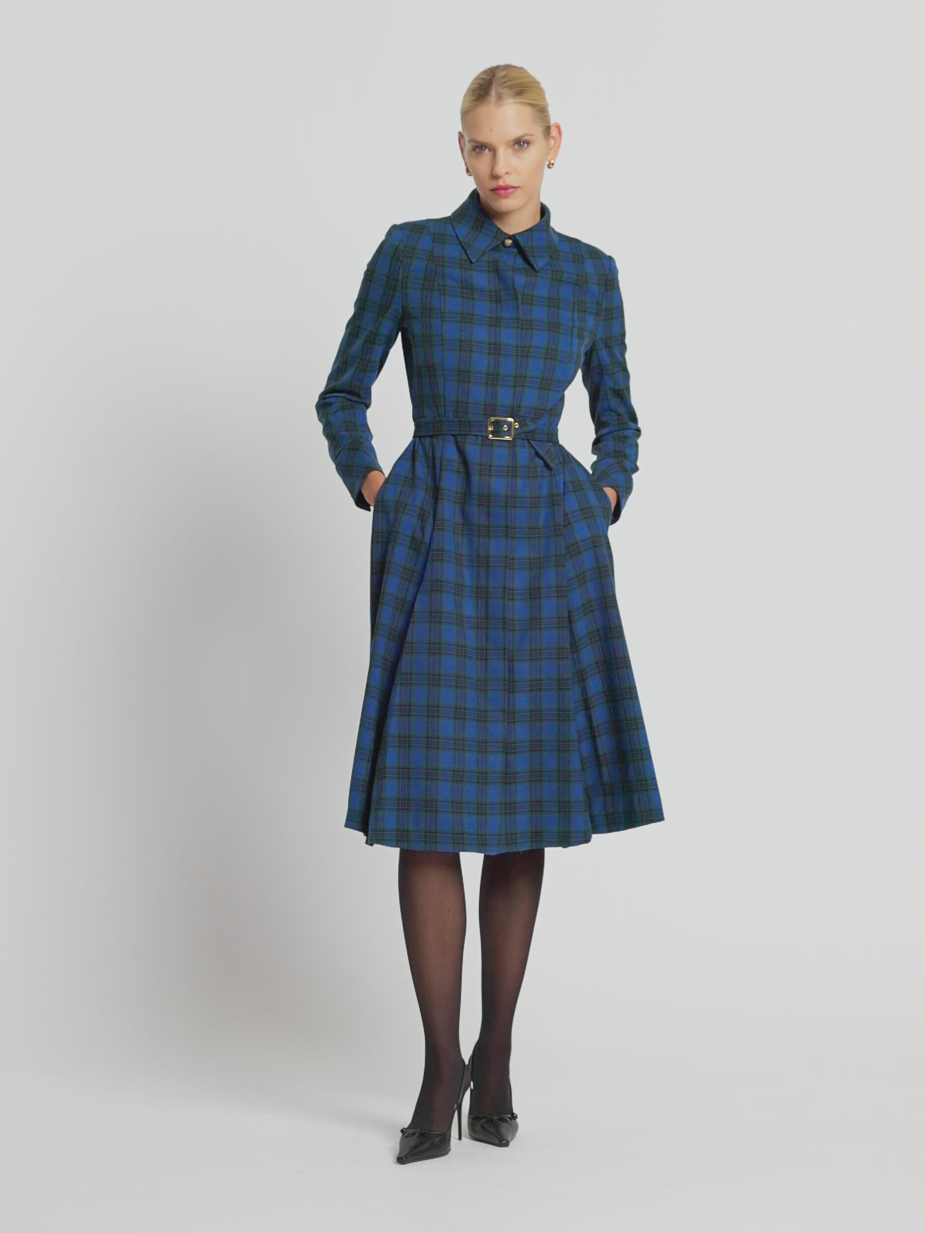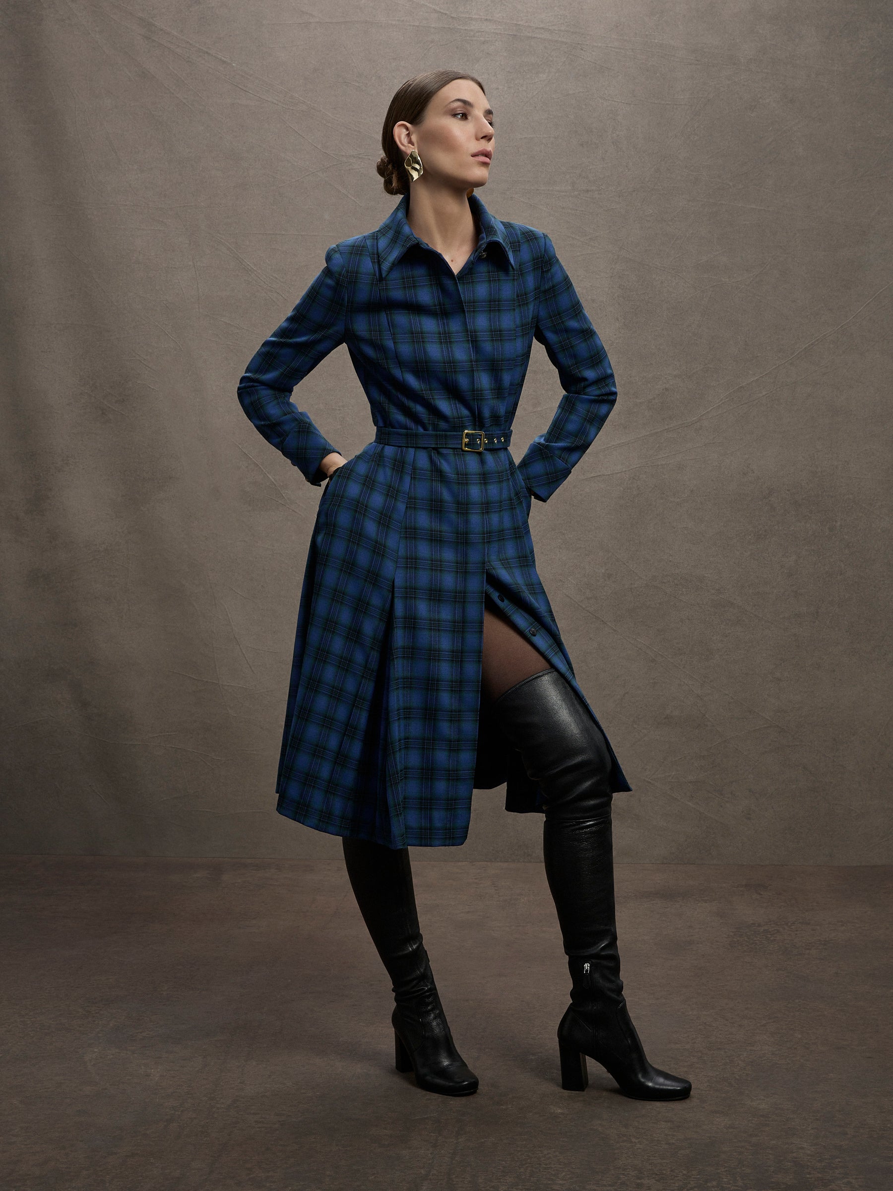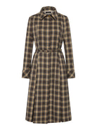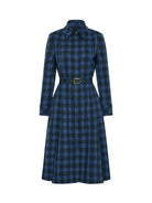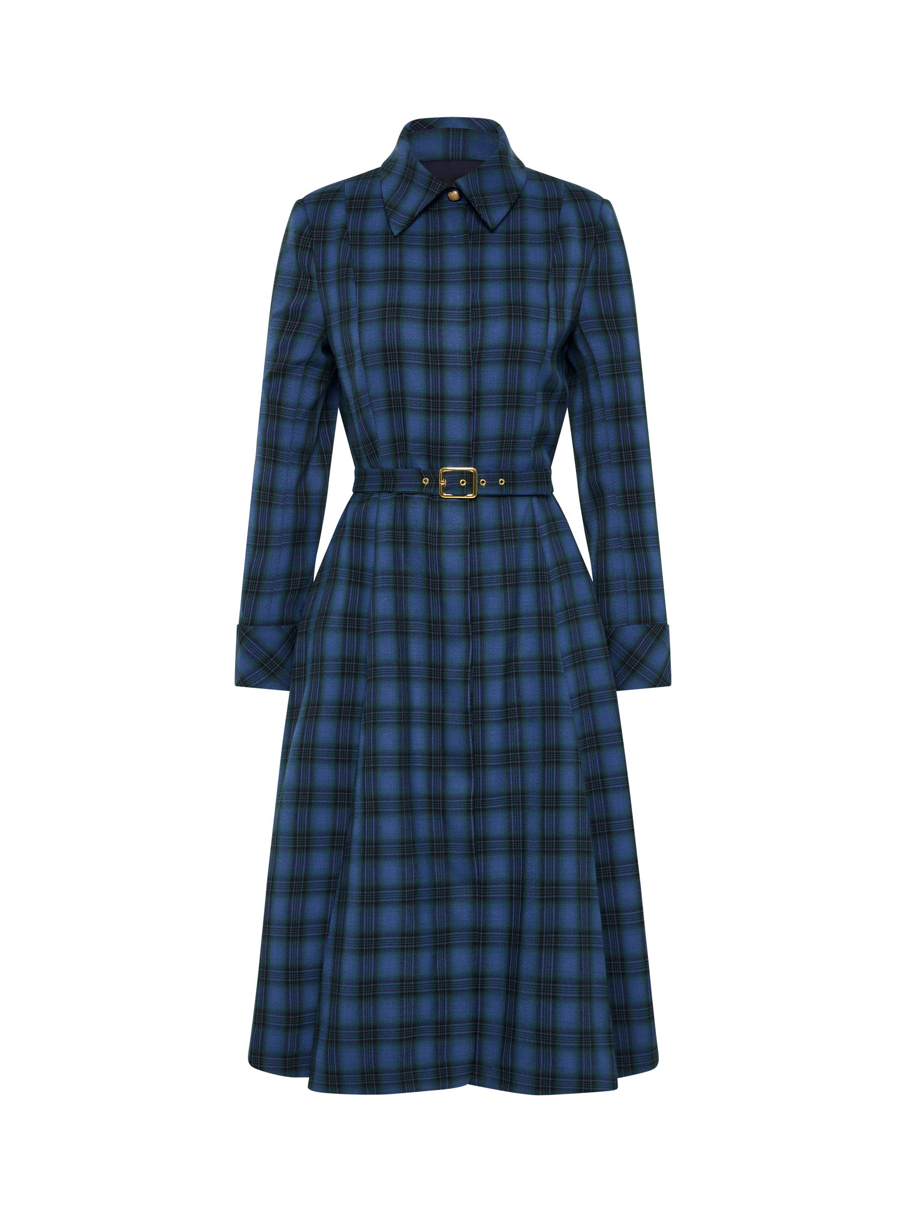 The Blair Coat Dress features a concealed front with a distinctive antique brass crest top button and a matching covered belt with a gold buckle to cinch in the waist. Tailored from stretch check suiting, it falls to an A-line skirt with pleats, finishing at mid-calf. A timeless and sophisticated look with knee high boots or your favourite heels, this versatile piece can also be worn as a coat over pants. Pairs perfectly with the Blair Pleat Pant.