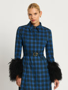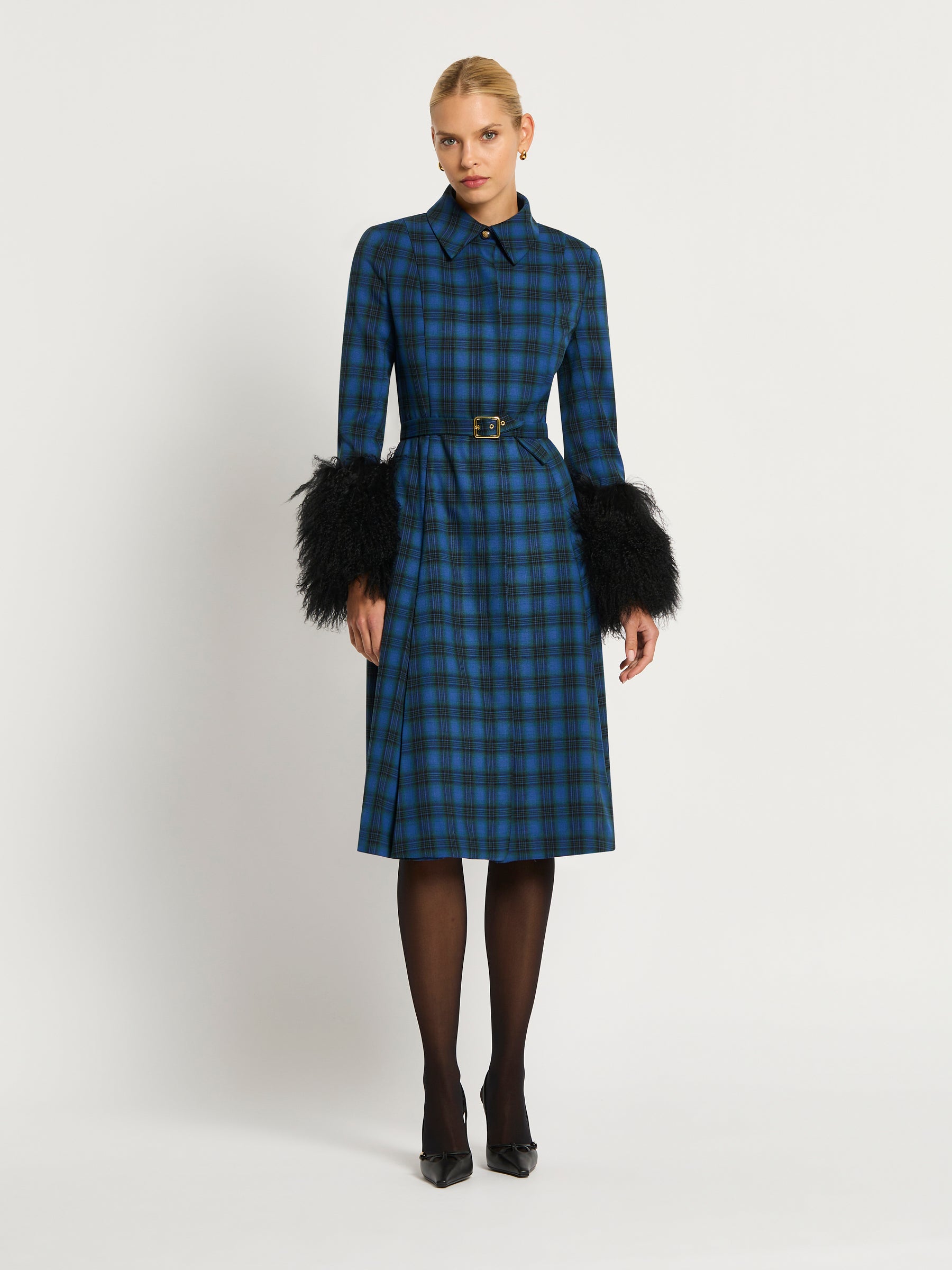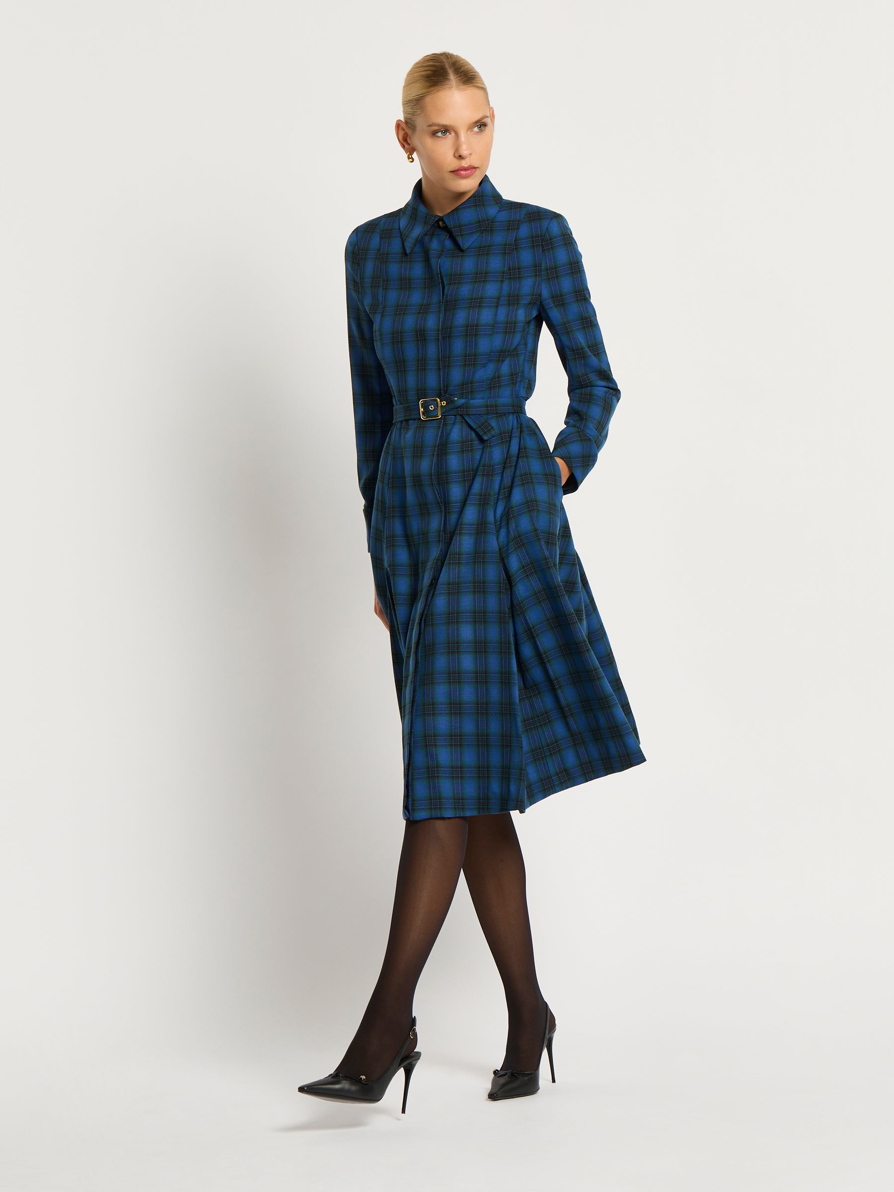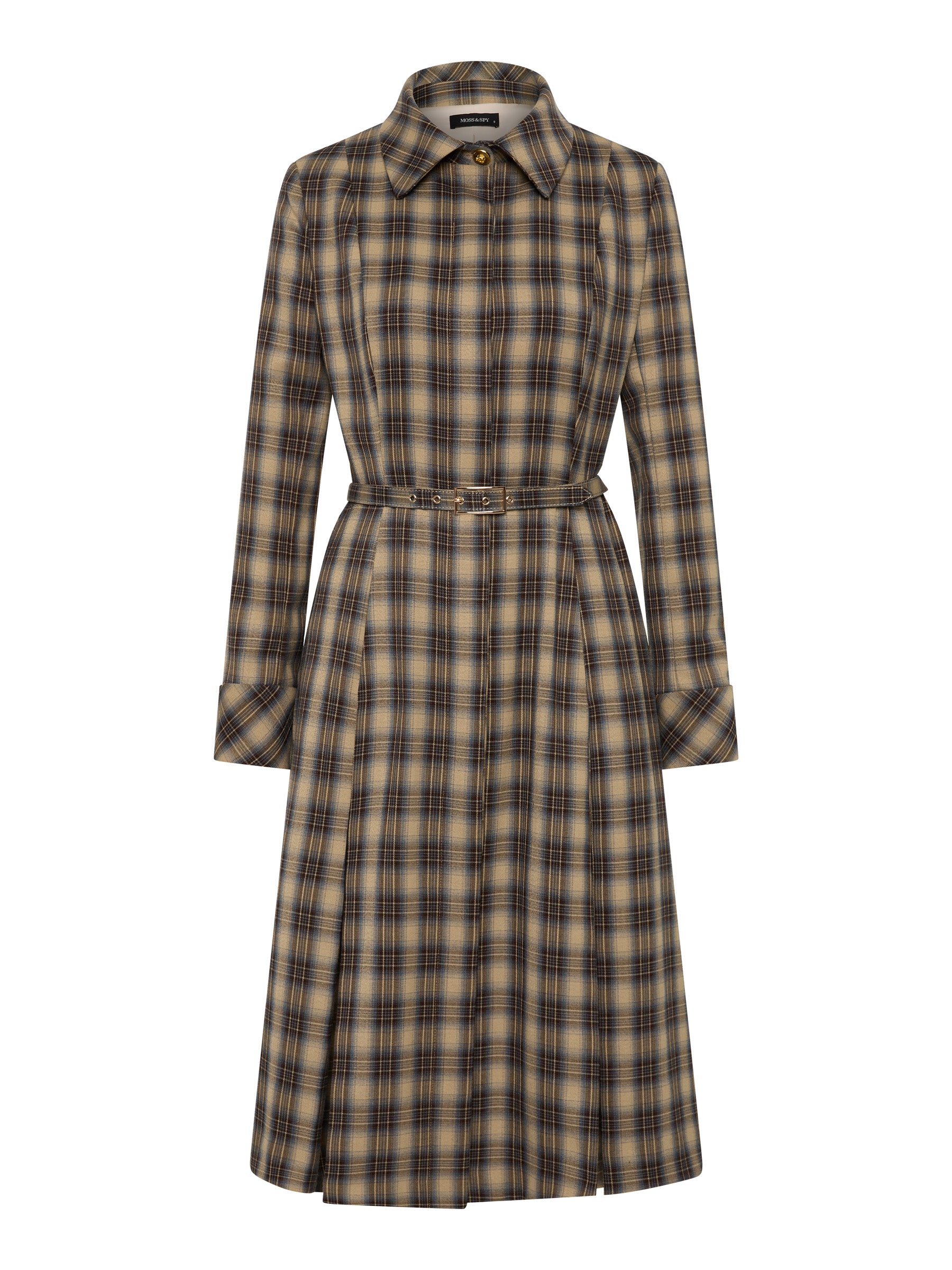 The Blair Coat Dress features a concealed front with a distinctive antique brass crest top button and a matching covered belt with a gold buckle to cinch in the waist. Tailored from stretch check suiting, it falls to an A-line skirt with pleats, finishing at mid-calf. A timeless and sophisticated look with knee high boots or your favourite heels, this versatile piece can also be worn as a coat over pants. Pairs perfectly with the Blair Pleat Pant.