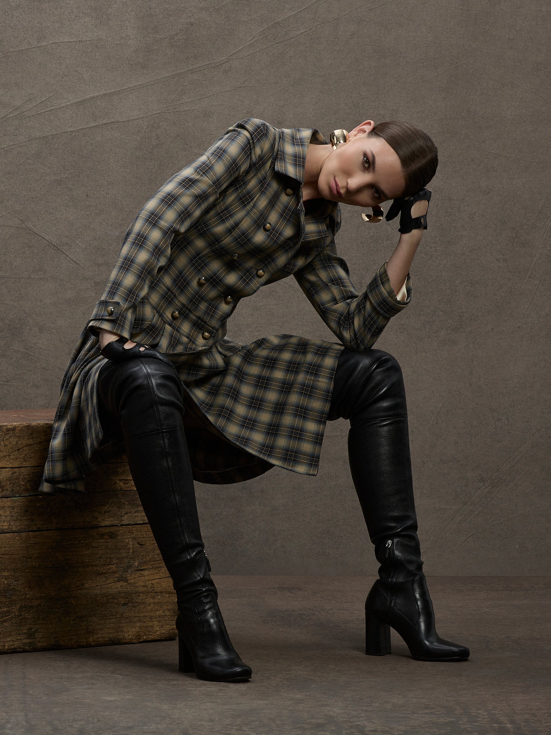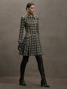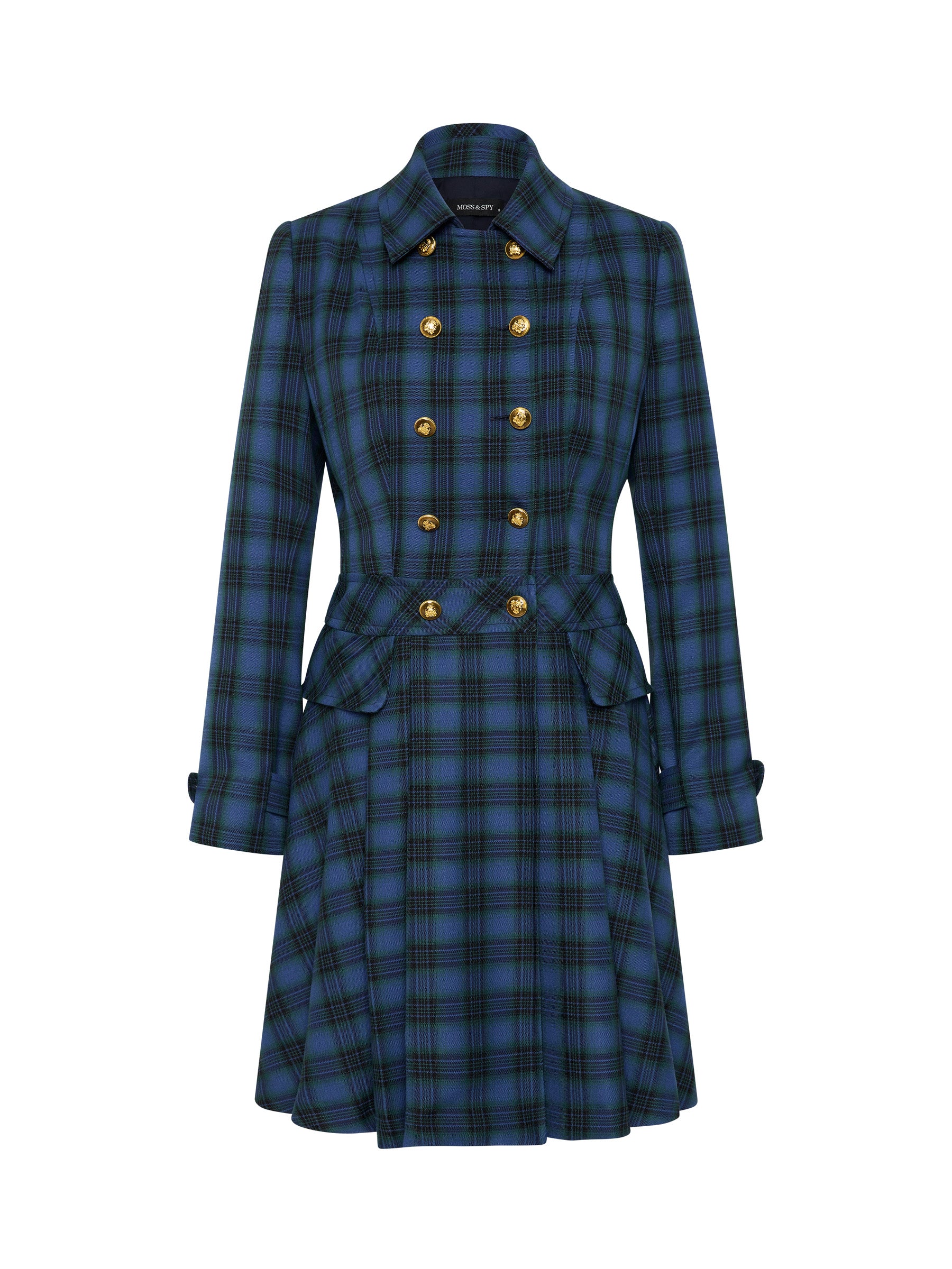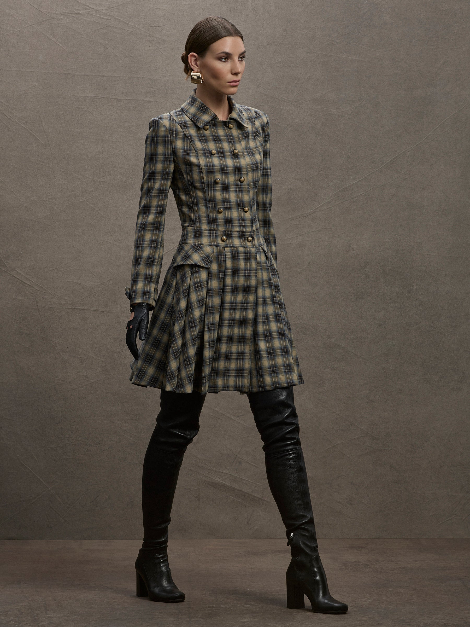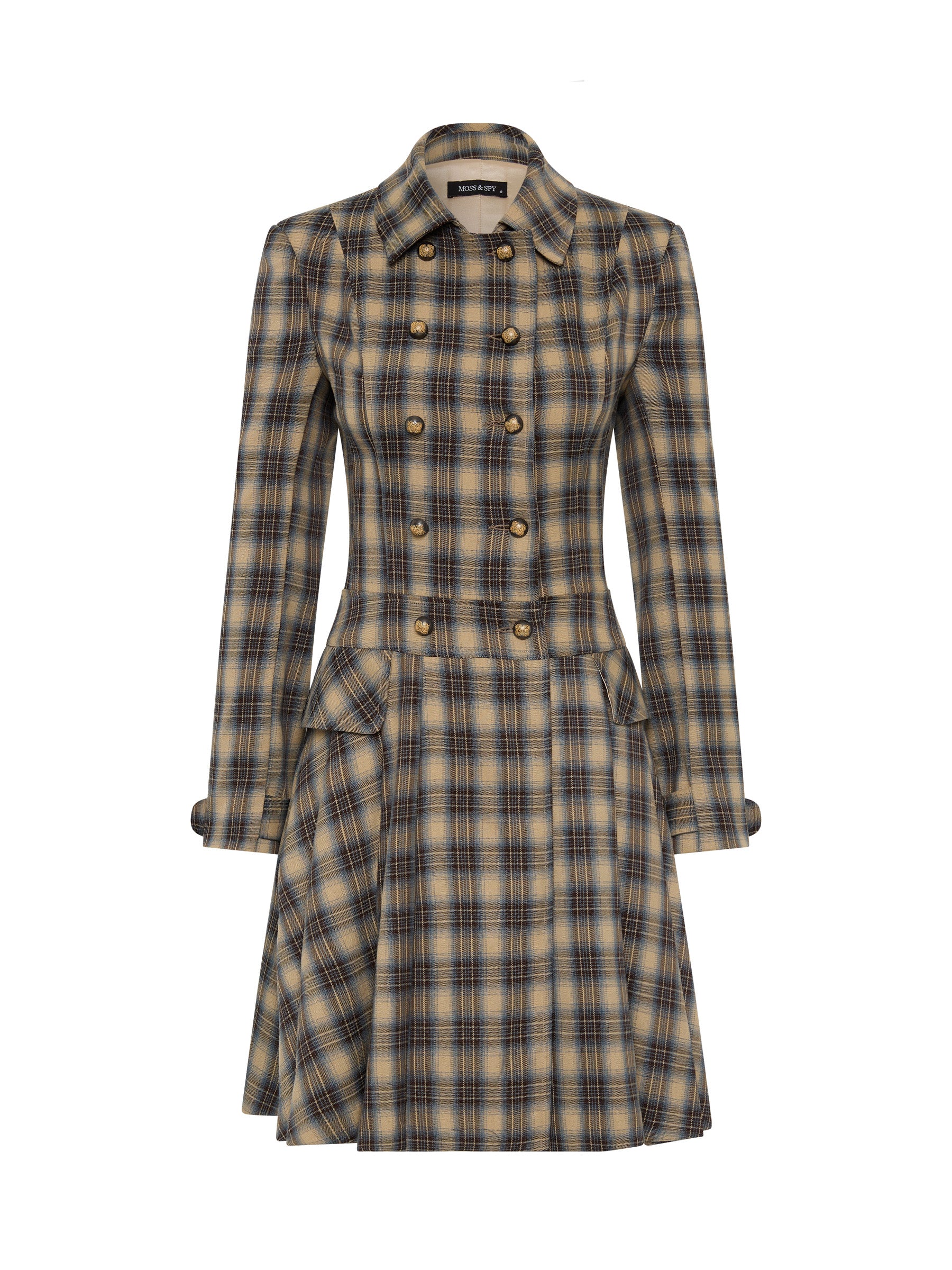 With a modern retro feel, the distinctive double-breasted design of the Blair Pleated Coat Dress is enhanced with two rows of antique brass crest buttons and shoulder pads. Tailored from stretch check suiting, it is fitted to the waist with a pleated hem line finishing above the knee. Wear it as a dress or jacket to create your own look for day or night or make a statement with knee-high boots