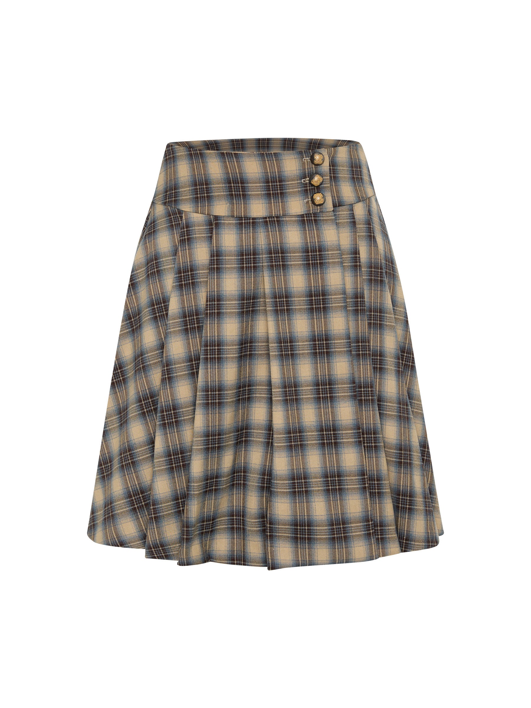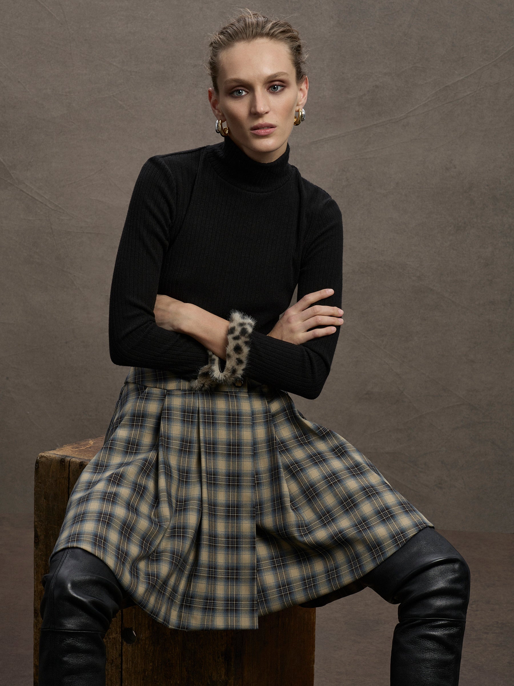 The Blair Pleated Skirt is fitted through the waist with a shaped wide waistband. Crafted from a stretch check suiting, it features a wrap skirt with antique brass crest button closure. An easy to wear winter piece which looks perfect with the Tanya Fur Trim Top for day or night .