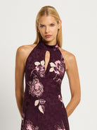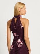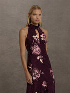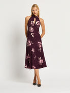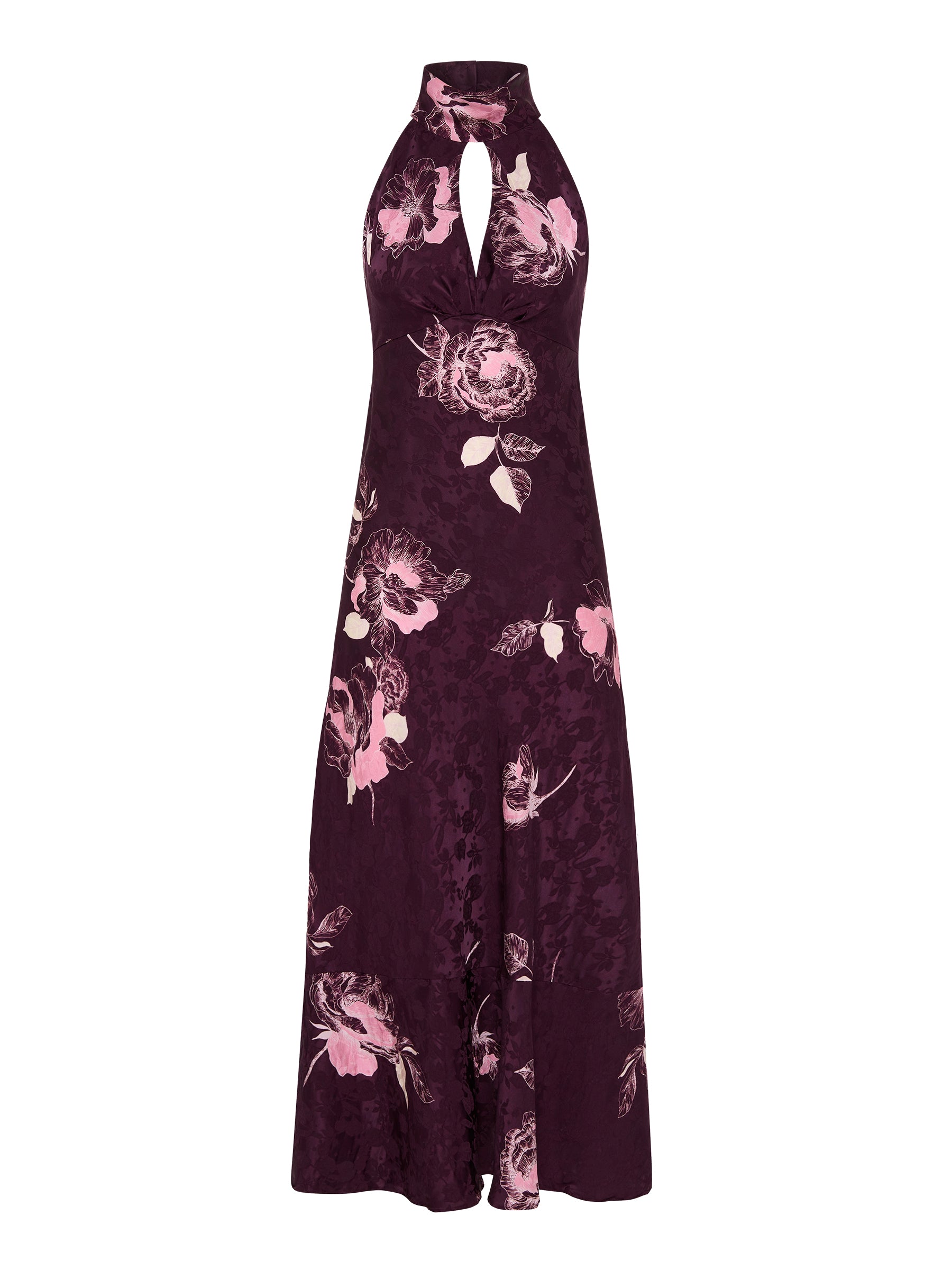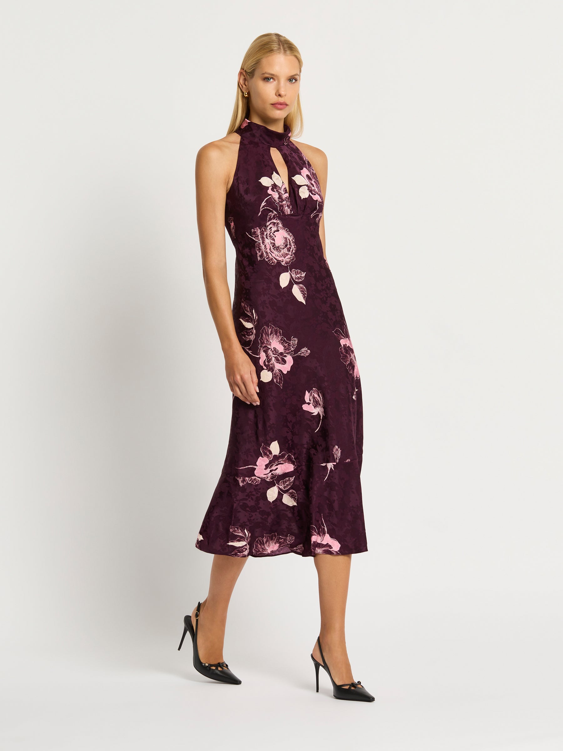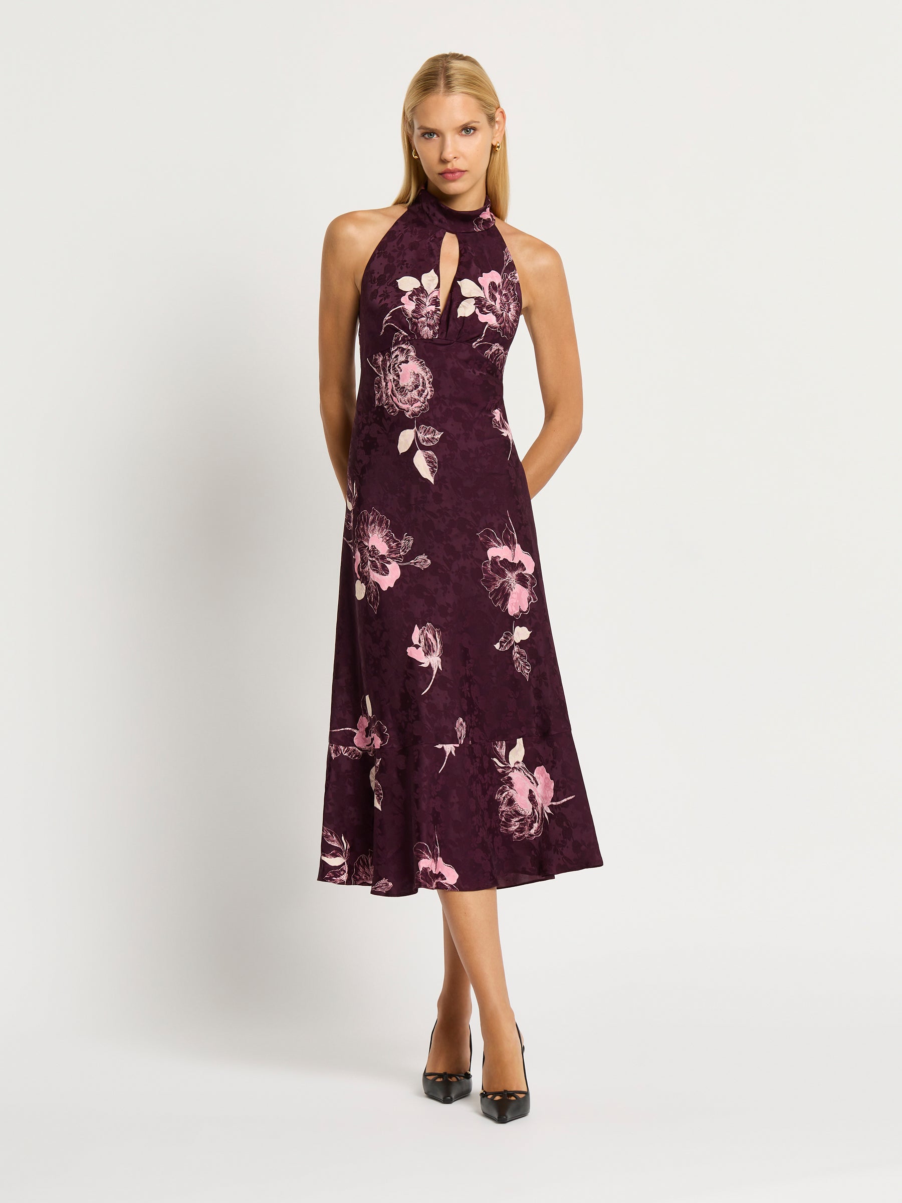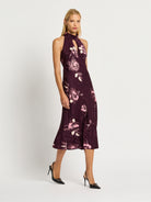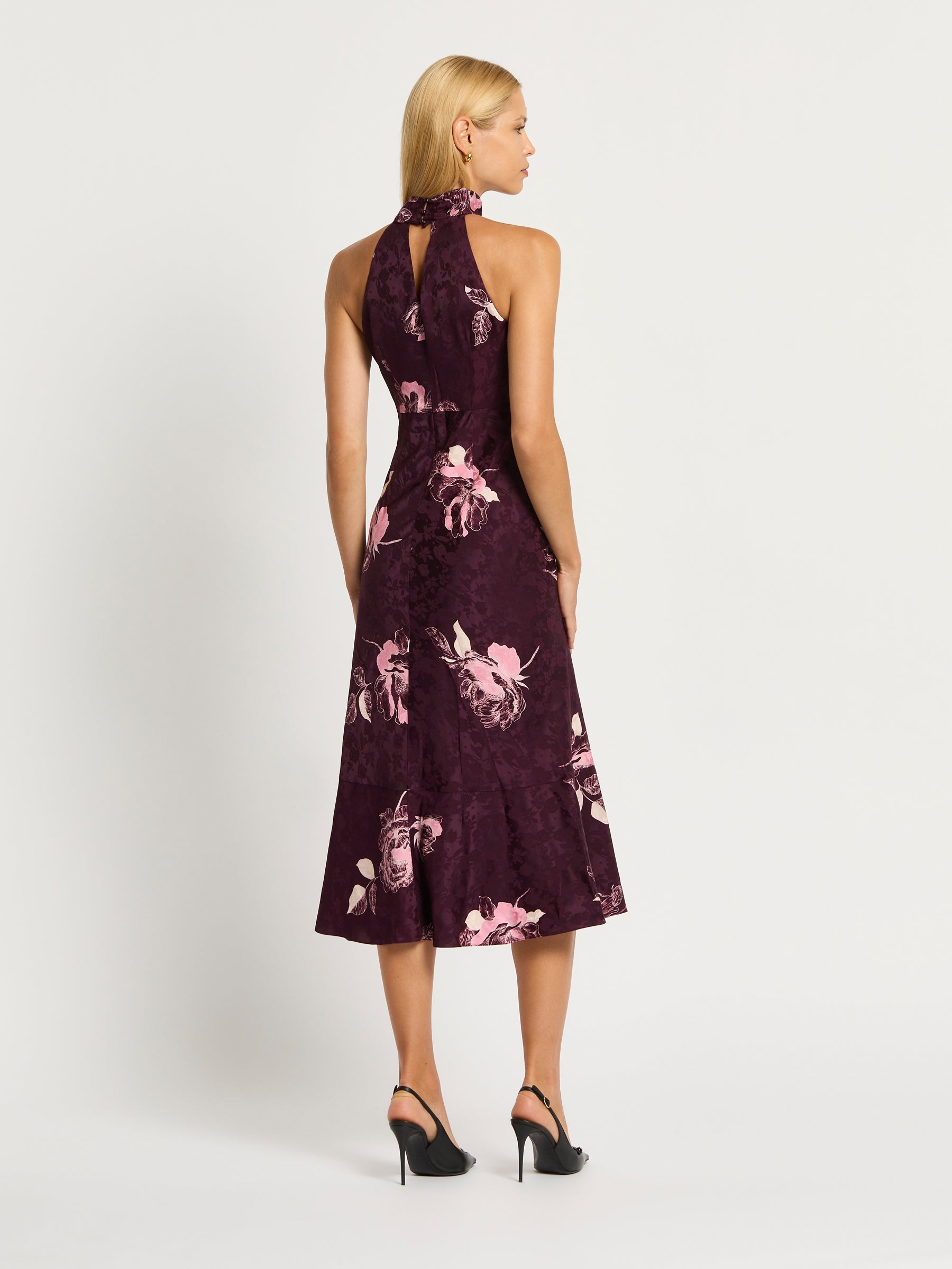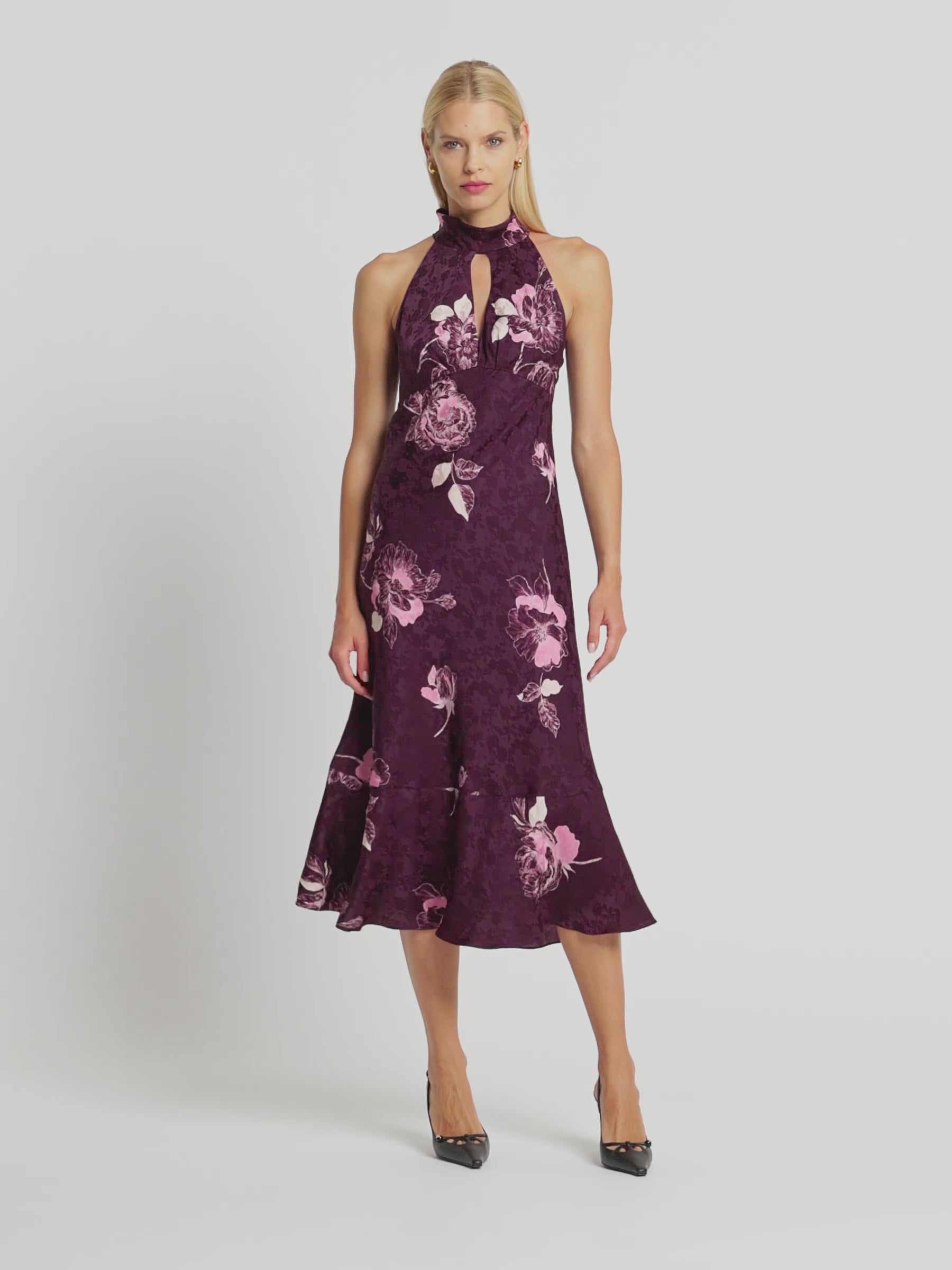 The Camille Sleeveless Midi Dress is crafted from a mid-weight viscose floral jacquard with an exclusive floral print perfectly placed to flatter the body. Fitted through the bodice with a cut away armhole and under bust seam, it has a keyhole opening secured with a button and loop fastening at centre back. Cut on the bias, this shapely yet relaxed silhouette gently hugs the body whilst falling to a midi length flounce hem, finishing at mid-calf. The perfect dress for your upcoming cocktail events