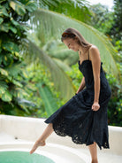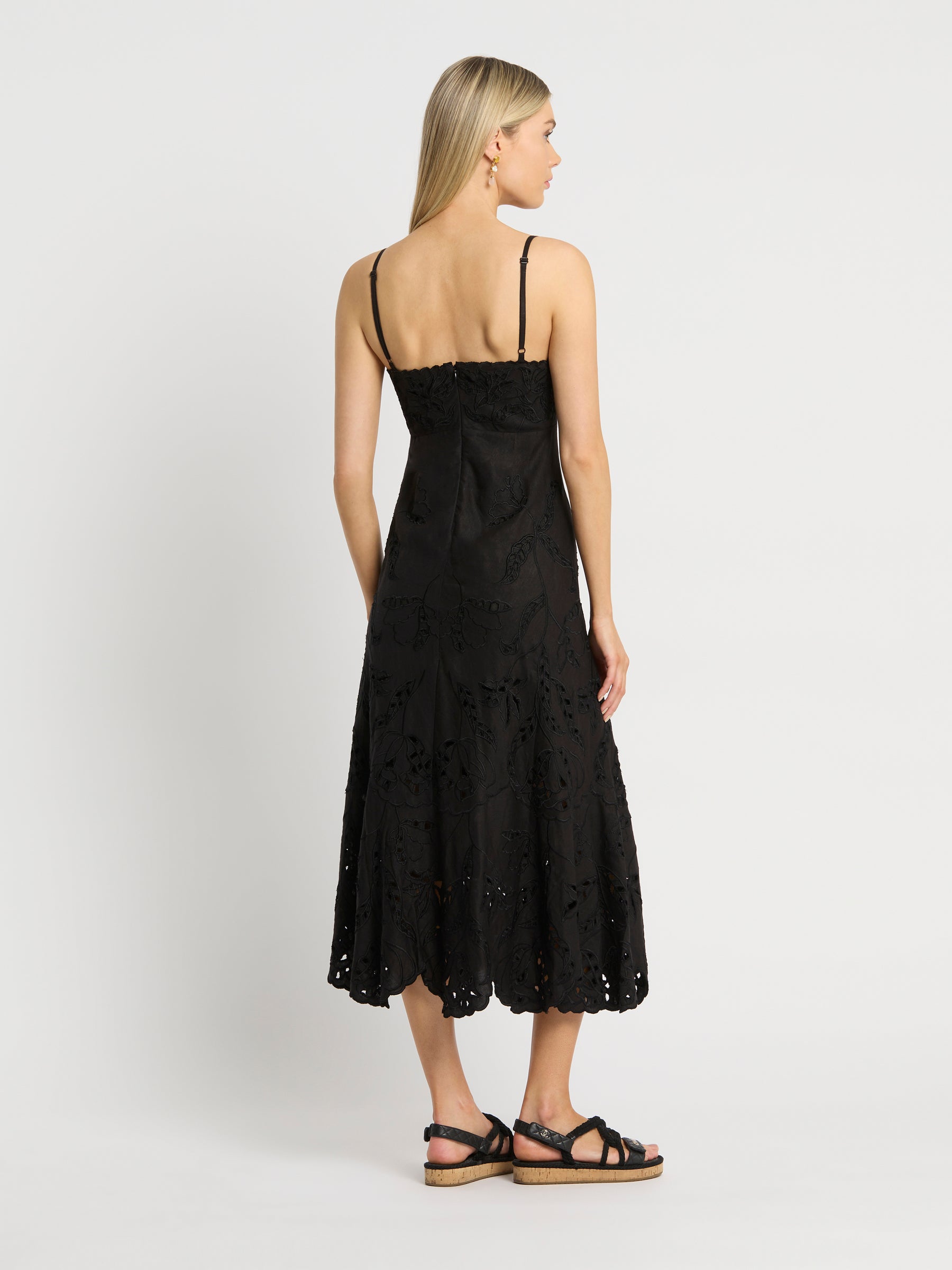 The Cannes Dress is intricately embroidered with cutwork and embroidery on a Linen/Viscose fabrication. Fitted at the bust with embroidery detailing and adjustable straps it falls into a bias-cut skirt. Beautifully tailored and lined in cotton voile the Cannes dress is worthy of a special occasion as well as an easy dress for summer days. Dress it up with heels or flats for holidays