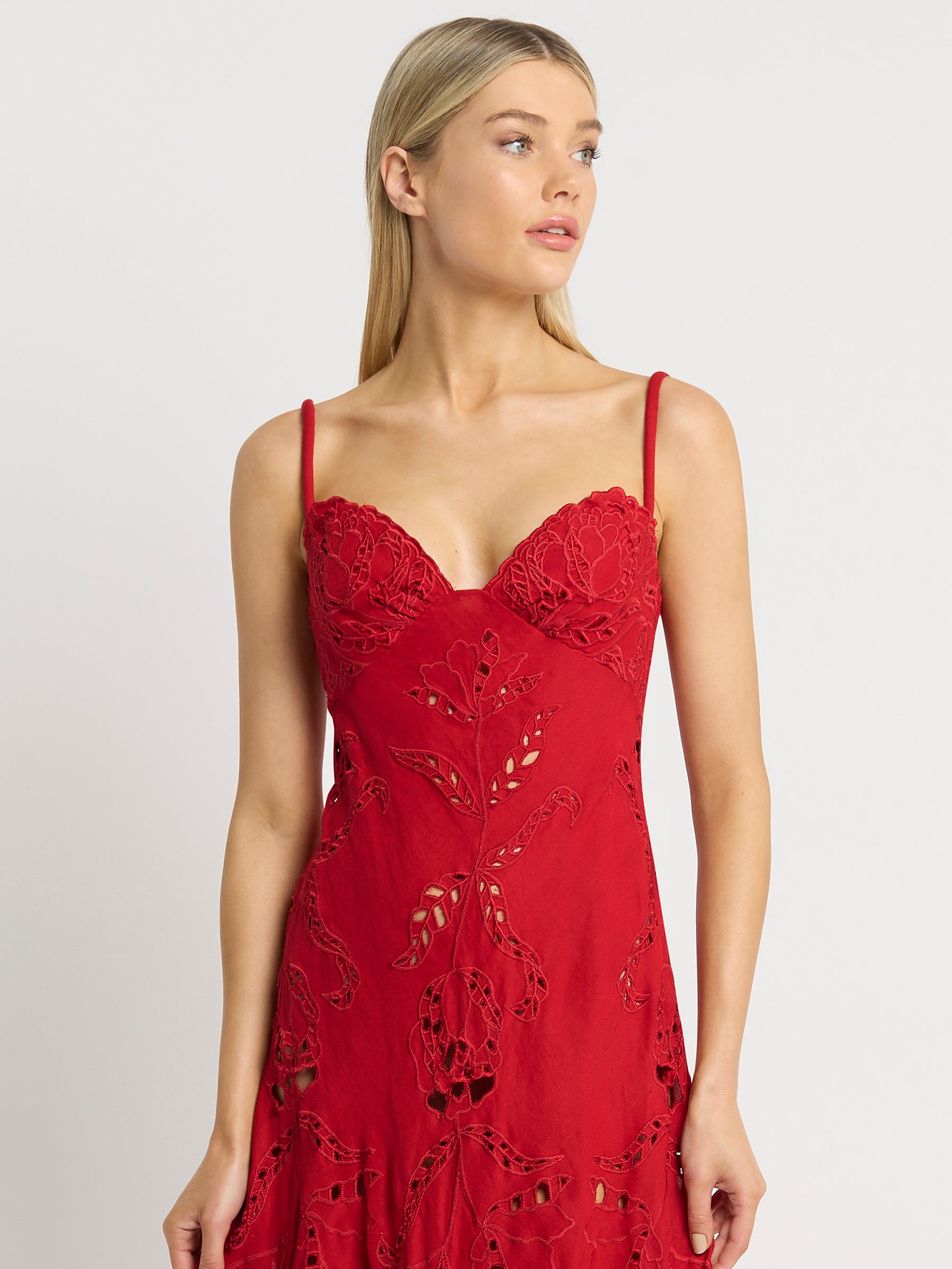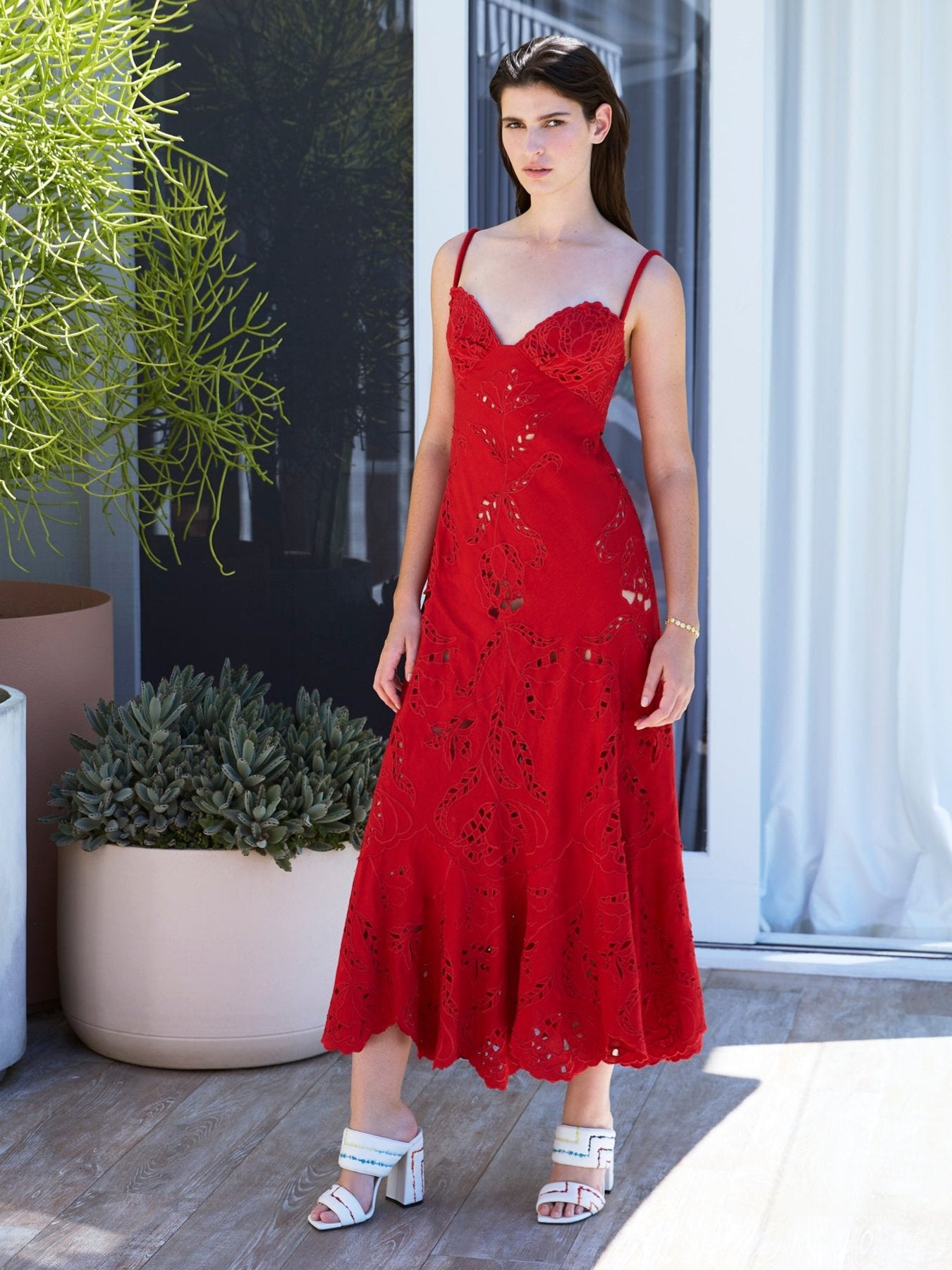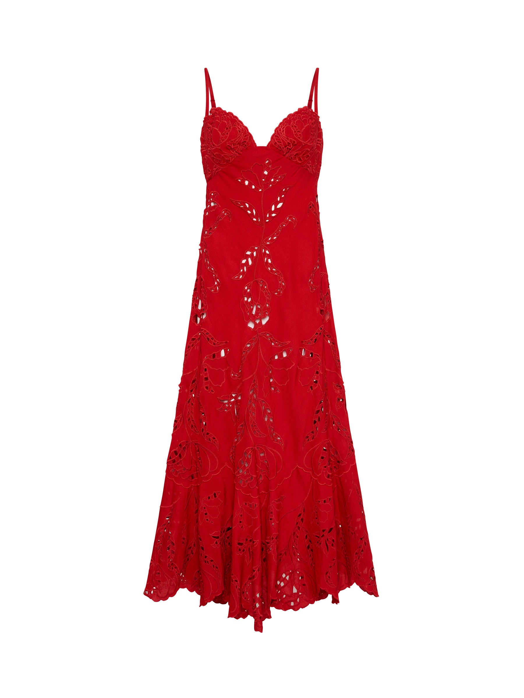 The Cannes Dress is intricately embroidered with cutwork and embroidery on a Linen/Viscose fabrication. Fitted at the bust with embroidery detailing and adjustable straps it falls into a bias-cut skirt. Beautifully tailored and lined in cotton voile the Cannes dress is worthy of a special occasion as well as an easy dress for summer days. Dress it up with heels or flats for holidays
