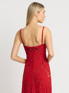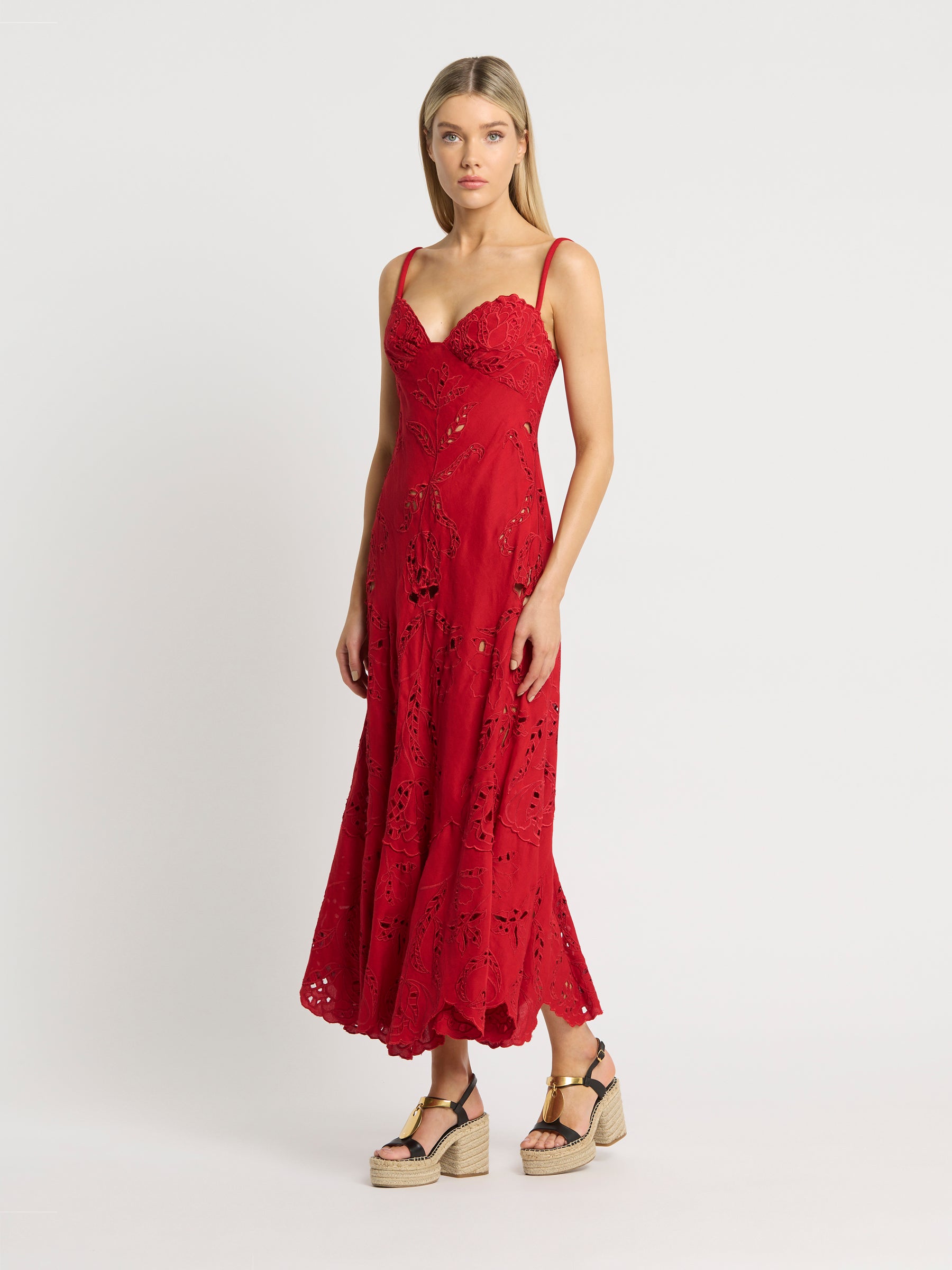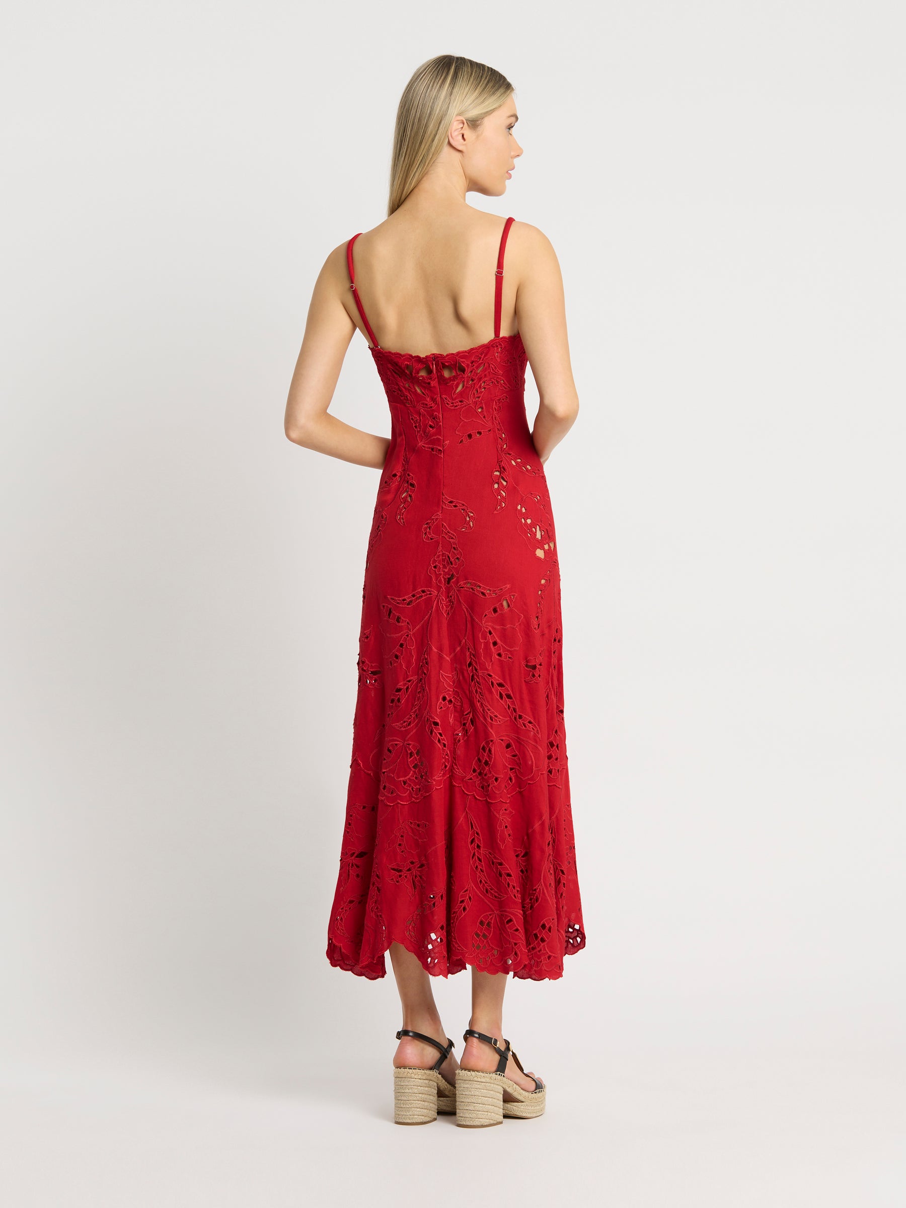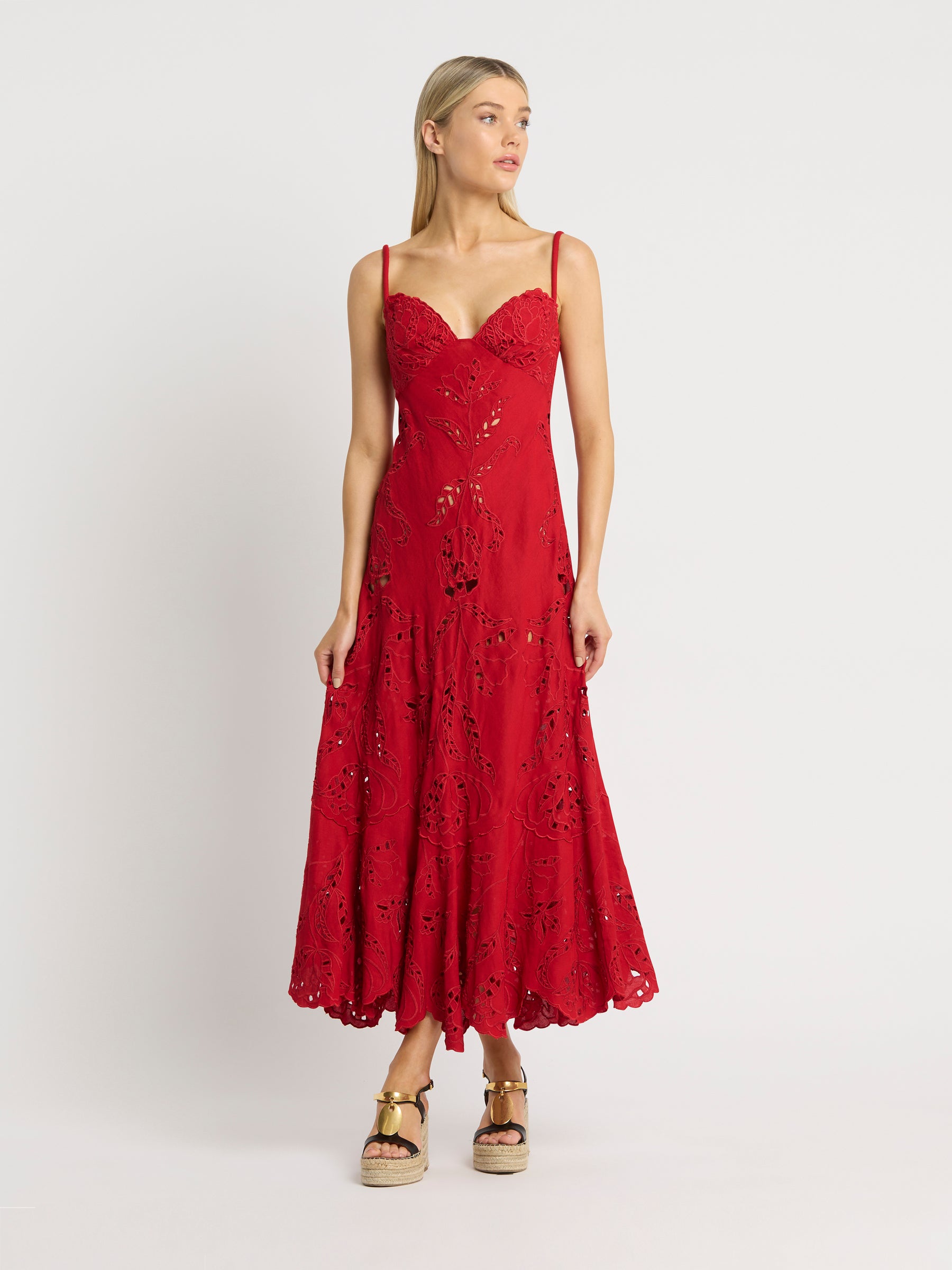 The Cannes Dress is intricately embroidered with cutwork and embroidery on a Linen/Viscose fabrication. Fitted at the bust with embroidery detailing and adjustable straps it falls into a bias-cut skirt. Beautifully tailored and lined in cotton voile the Cannes dress is worthy of a special occasion as well as an easy dress for summer days. Dress it up with heels or flats for holidays