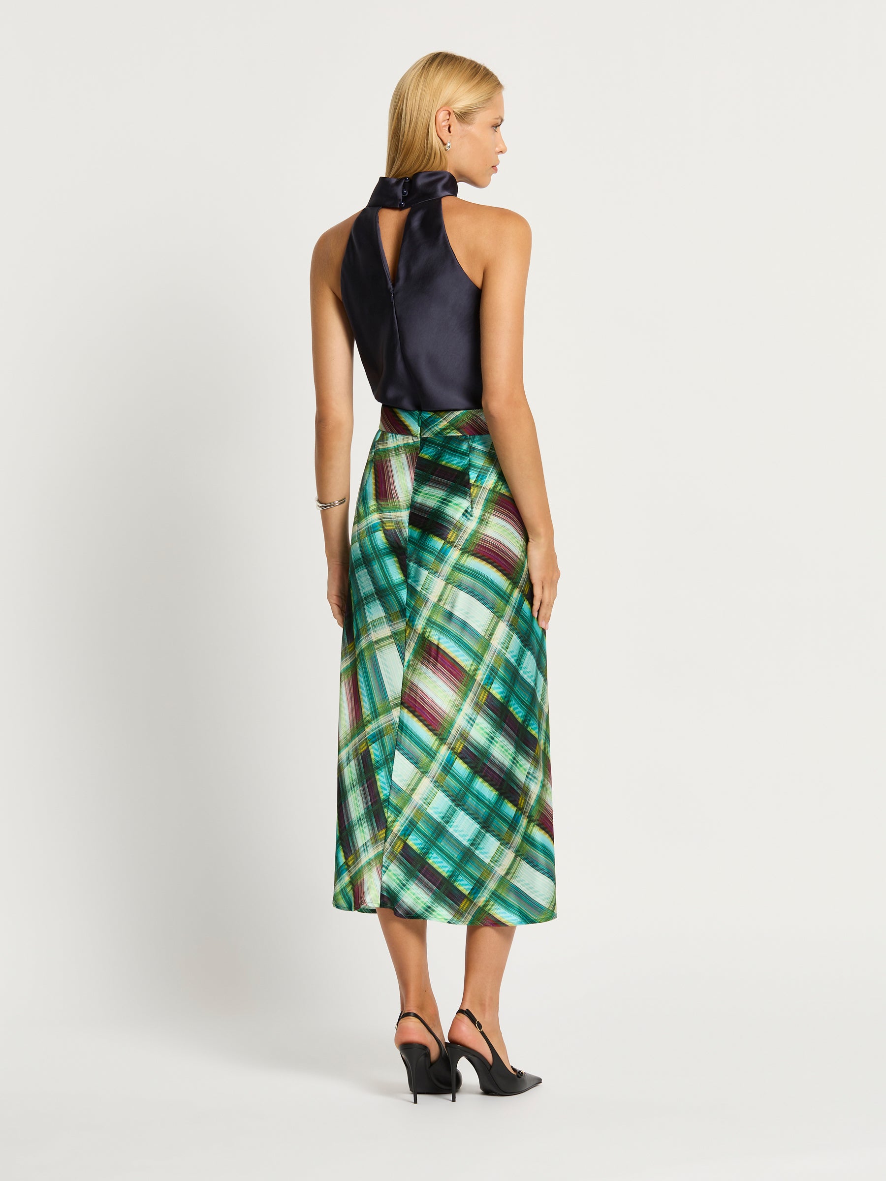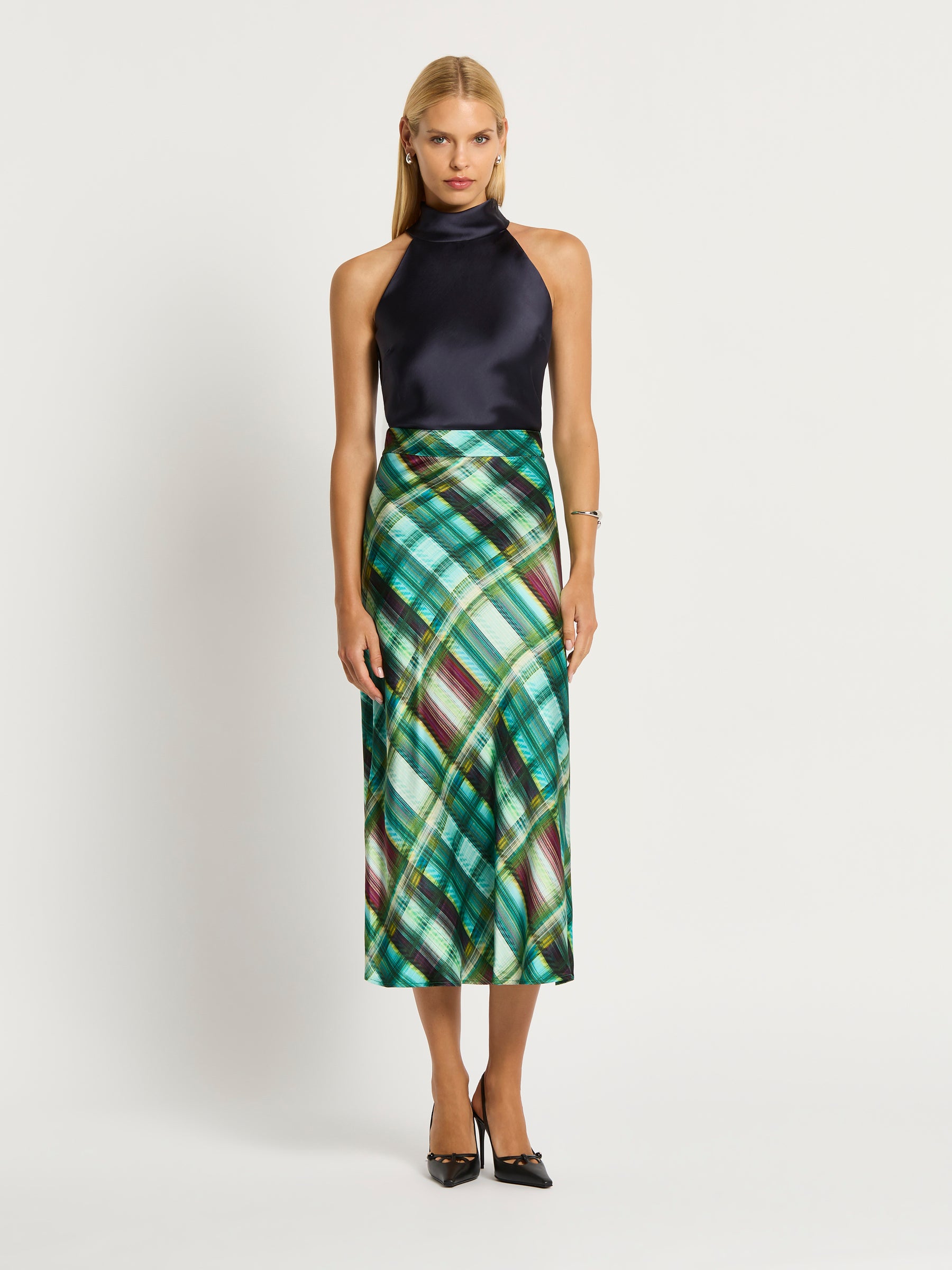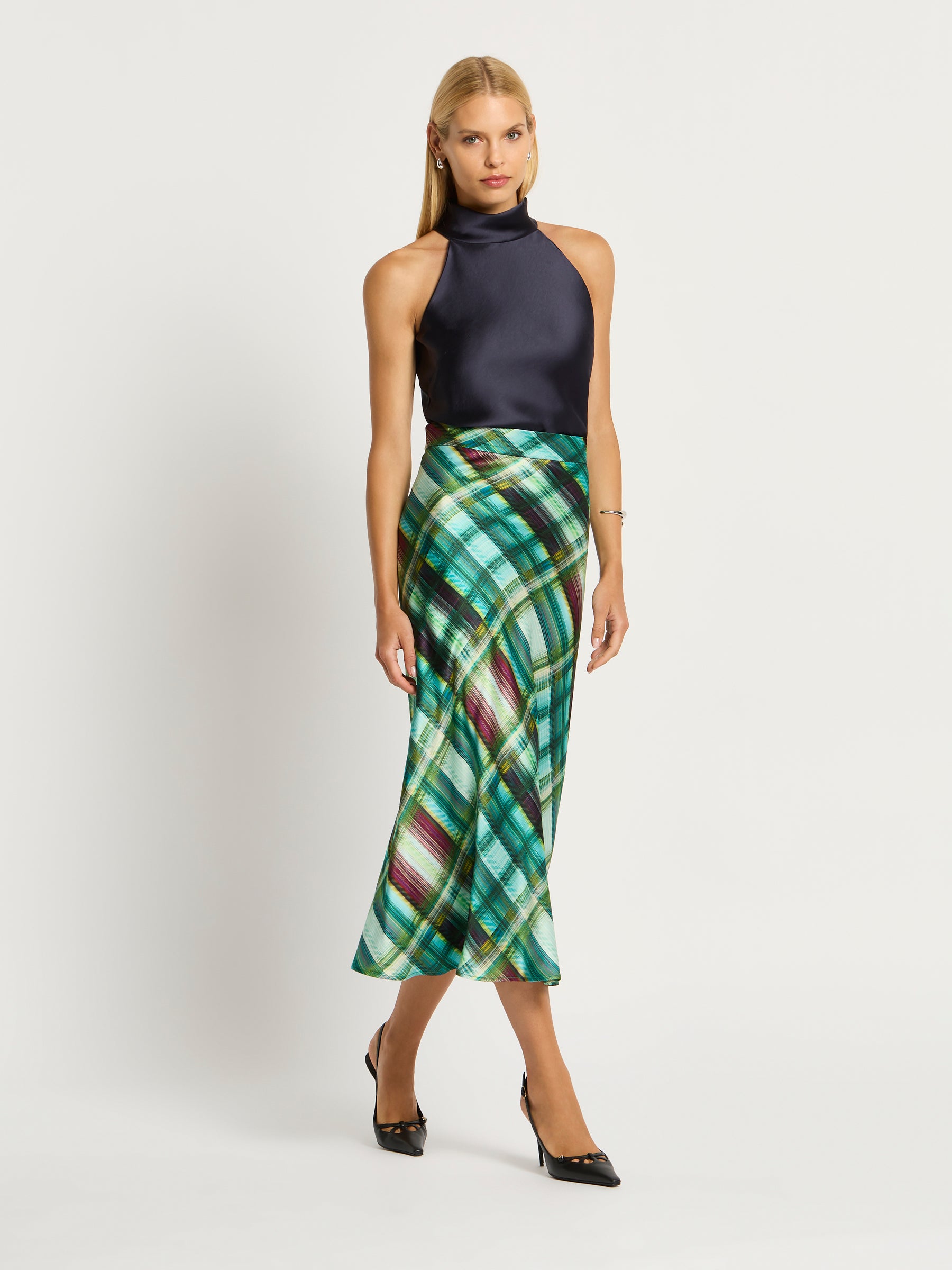 With a vibrant contemporary plaid print in shades of green and plum on a mid-weight viscose satin, the Carrie Skirt is cut on the bias and fitted through the waist, falling to a mid-length slight A-line hem. A very on-trend piece that will stand out in your trans-seasonal wardrobe. This statement skirt can be paired with the Nicola Top for a sophisticated modern look or team back with your favourite Knit for Winter.