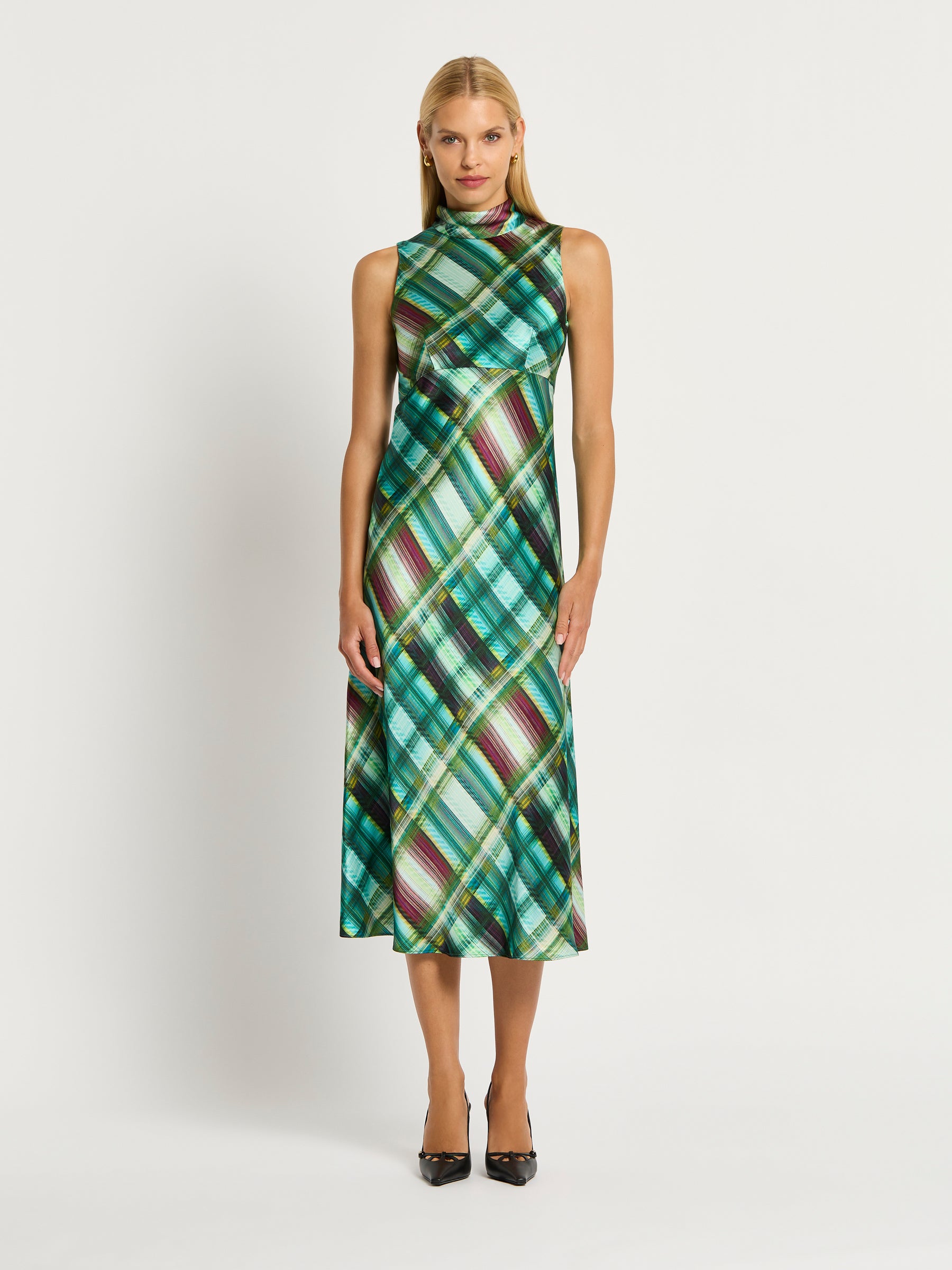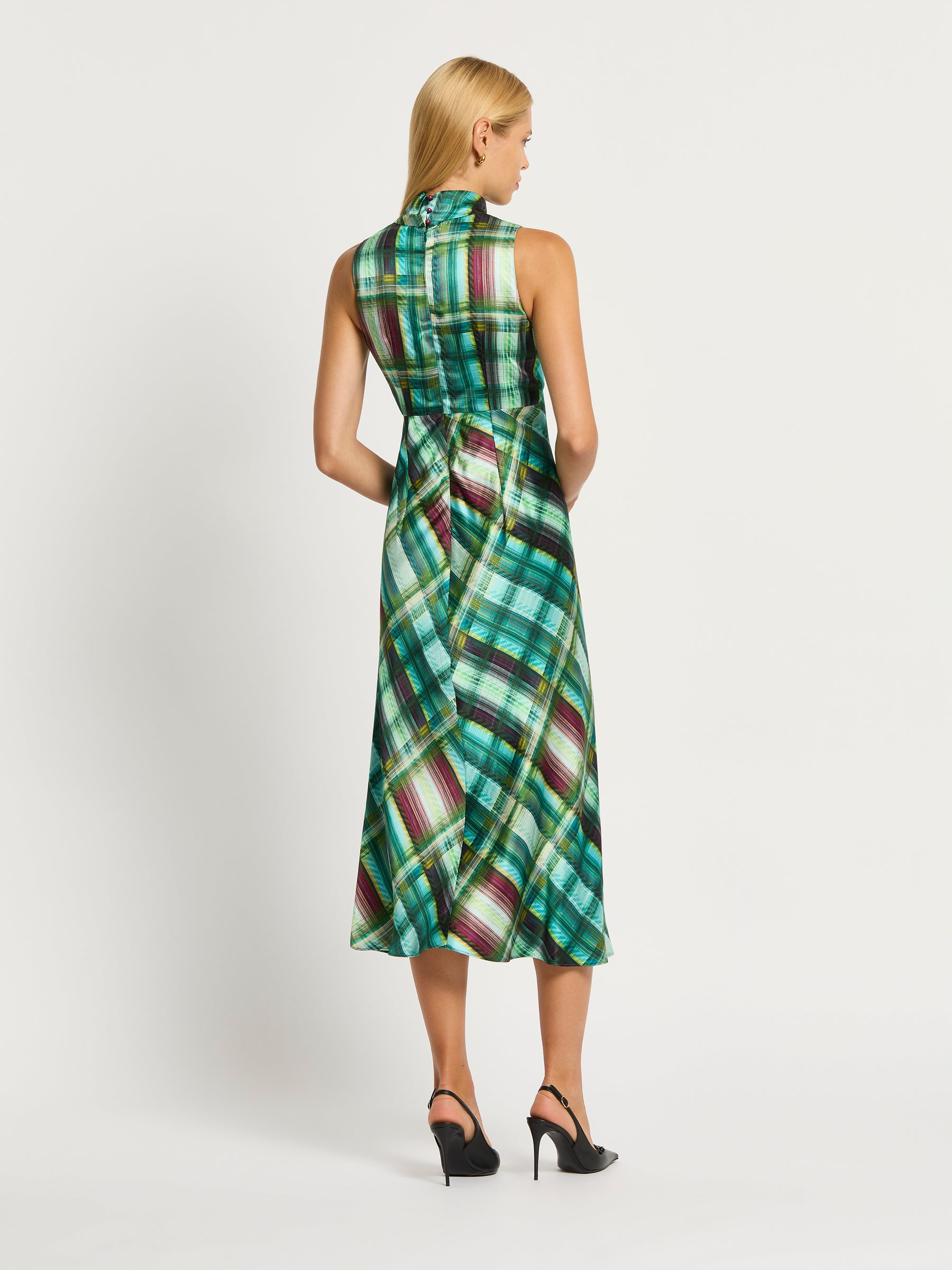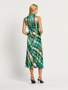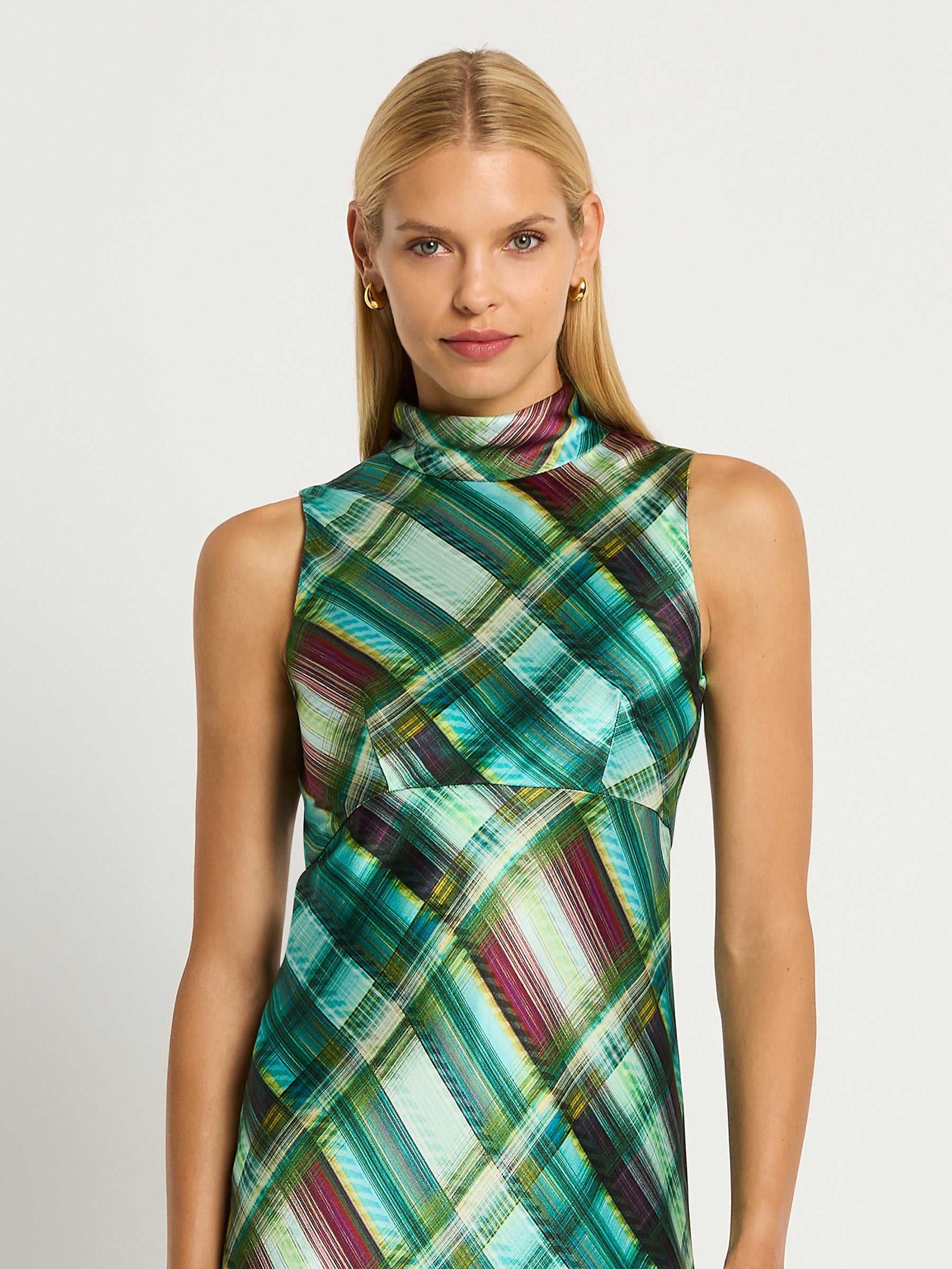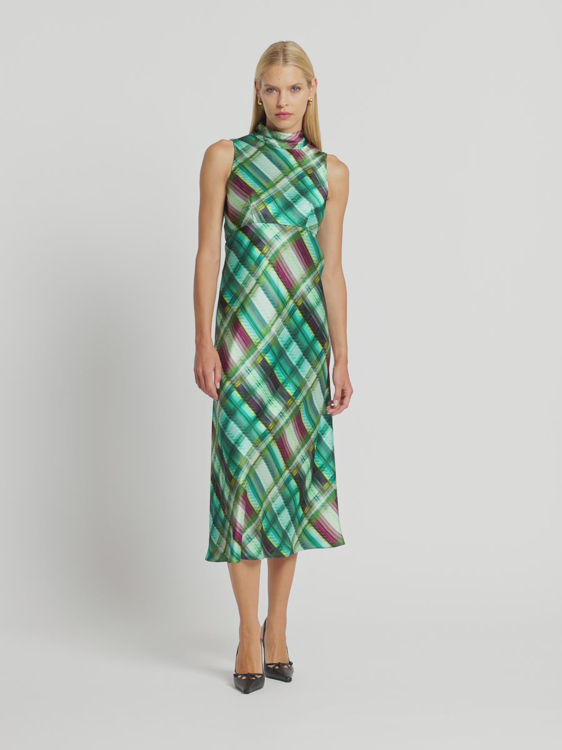 With a vibrant contemporary plaid print in shades of green and plum on a mid-weight viscose satin, the Carrie Sleeveless is cut on the bias and fitted through the bodice with an under bust seam. It has a distinctive soft high collar, cut away armhole and a shapely, yet relaxed silhouette falling to a mid-length slight A-line hem. A very on-trend piece that will stand out in your trans-seasonal wardrobe.