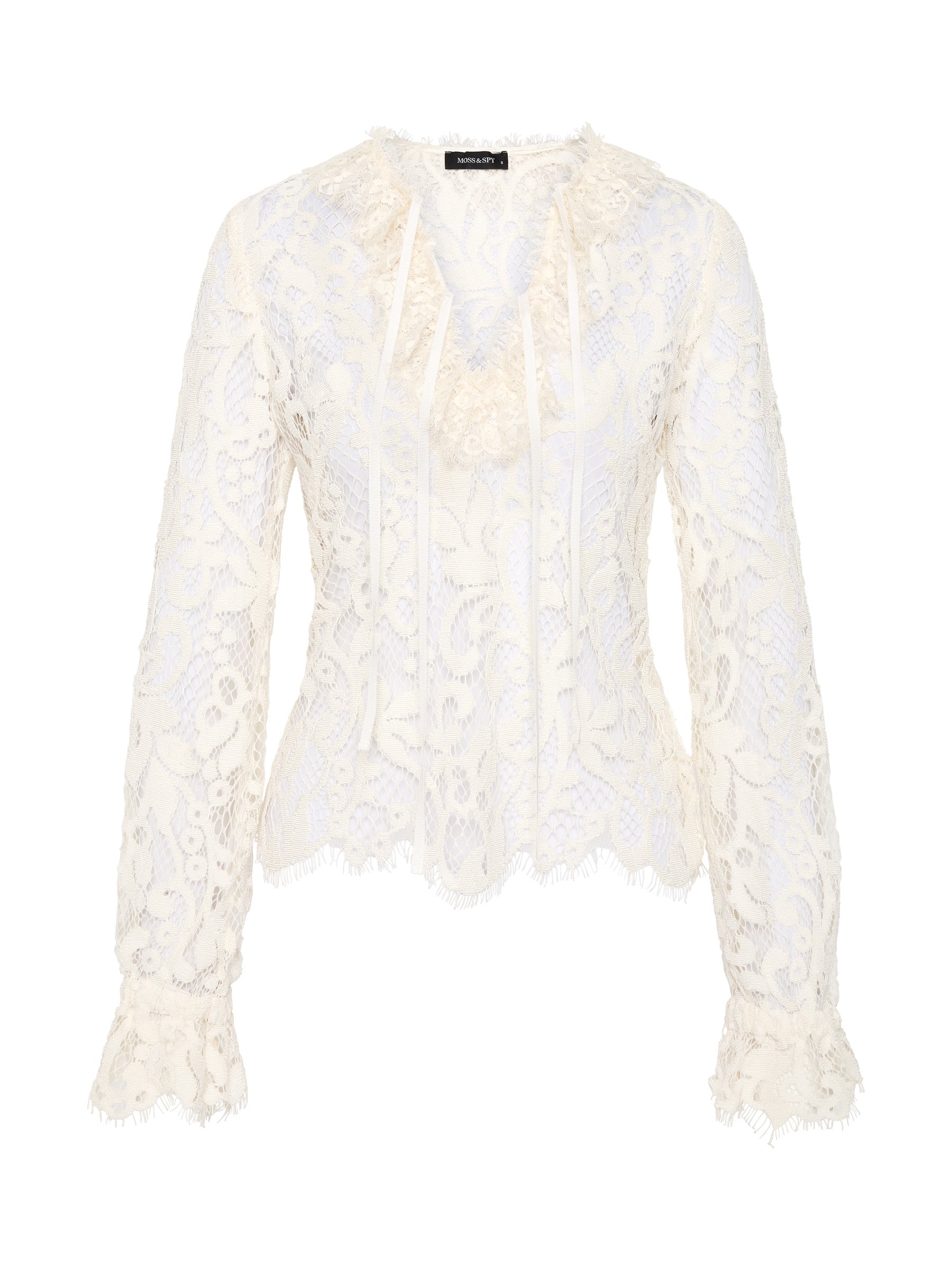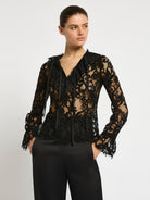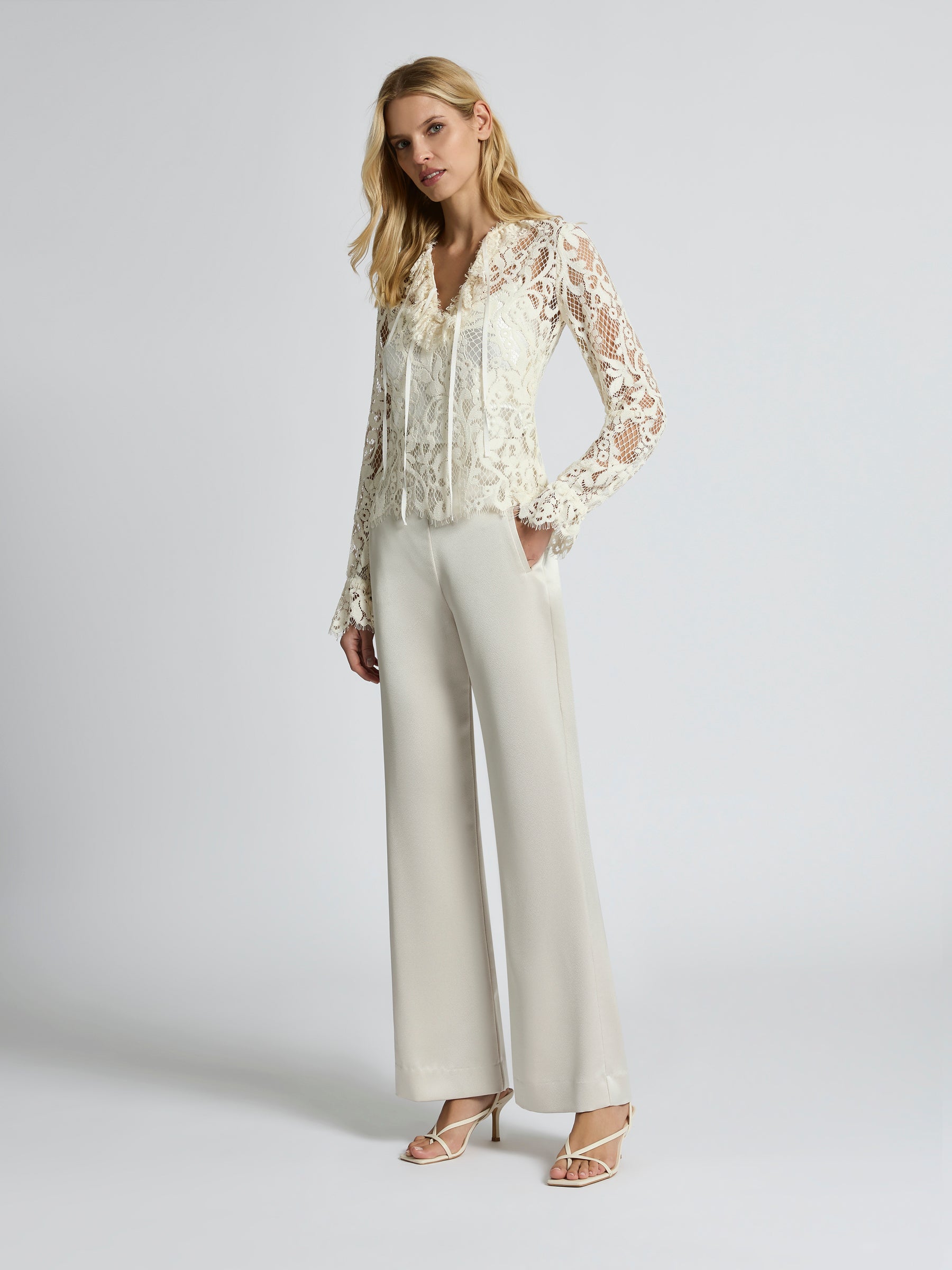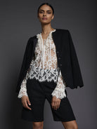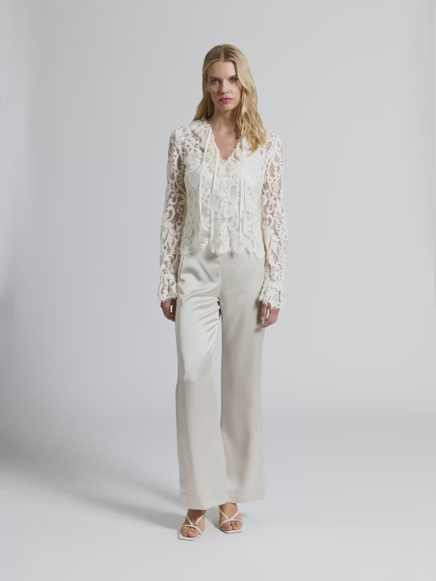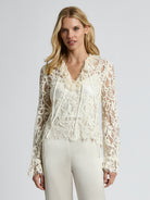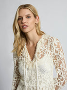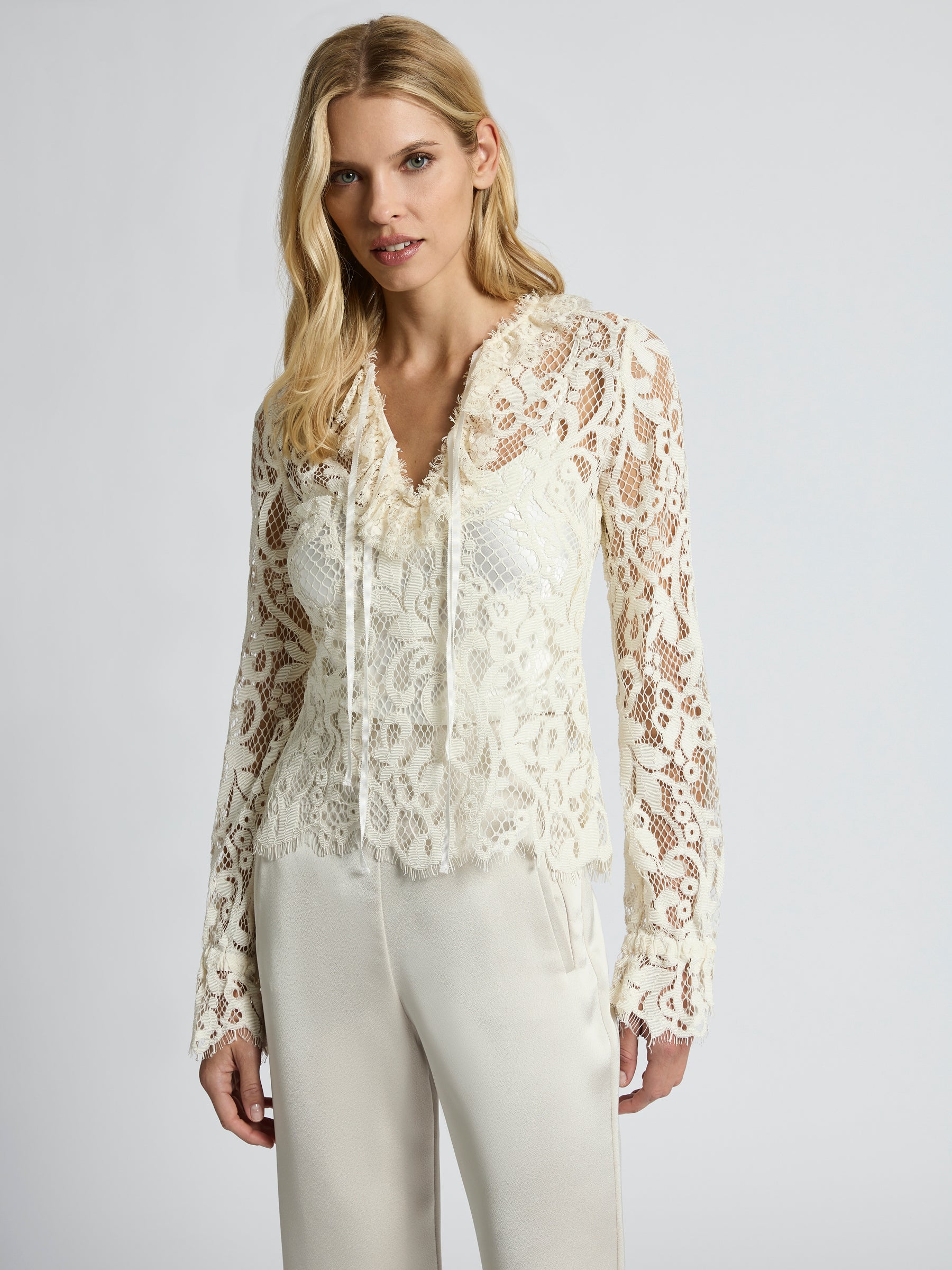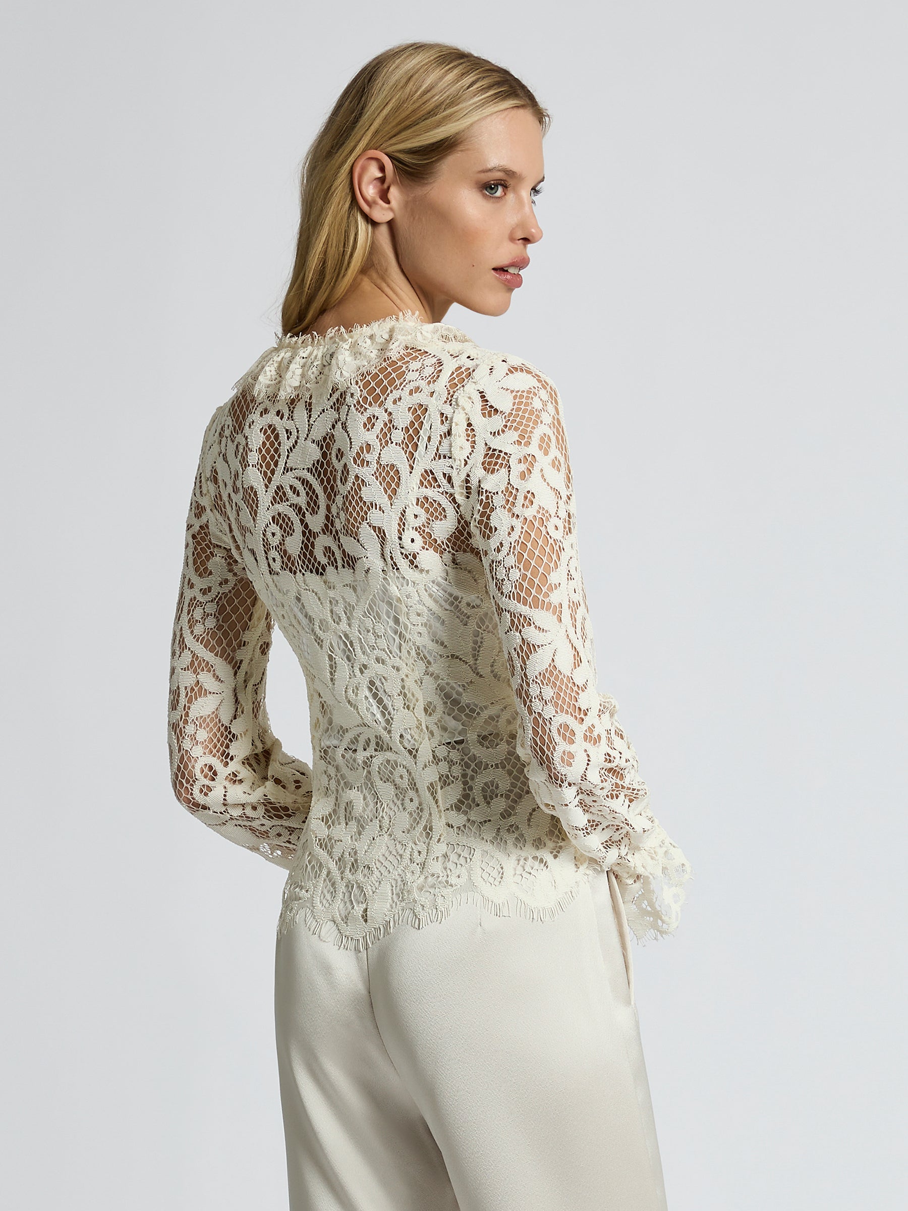 Effortlessly elegant, the Chantel Long Sleeve Top is crafted from a corded, textured lace and designed to elevate any outfit. It features a lace frill collar with opening ties down centre front neckline. Billowing sleeves are finished with lace frill and an elastic cuff that can be worn pushed up or full length. Comes with a matching jersey cami.