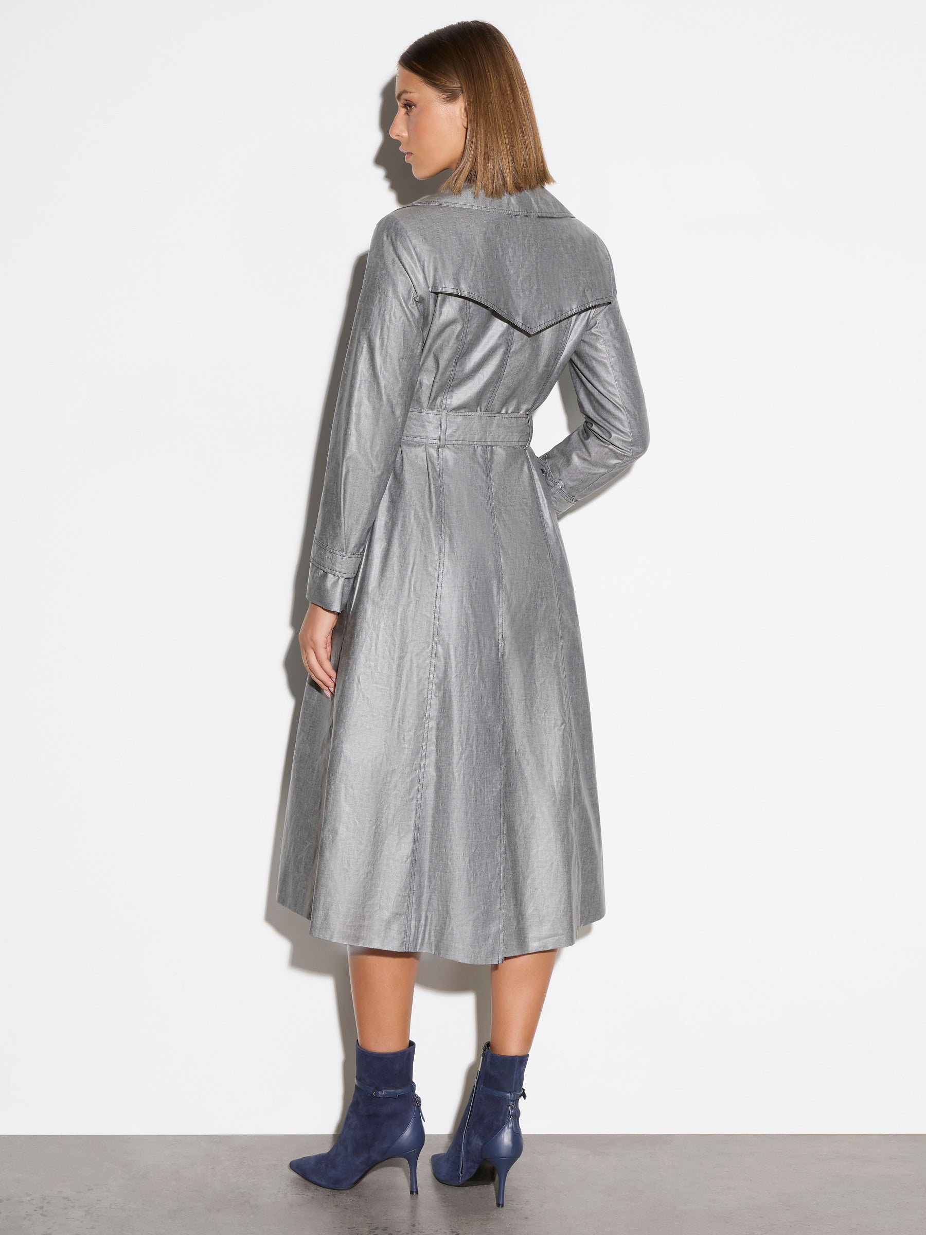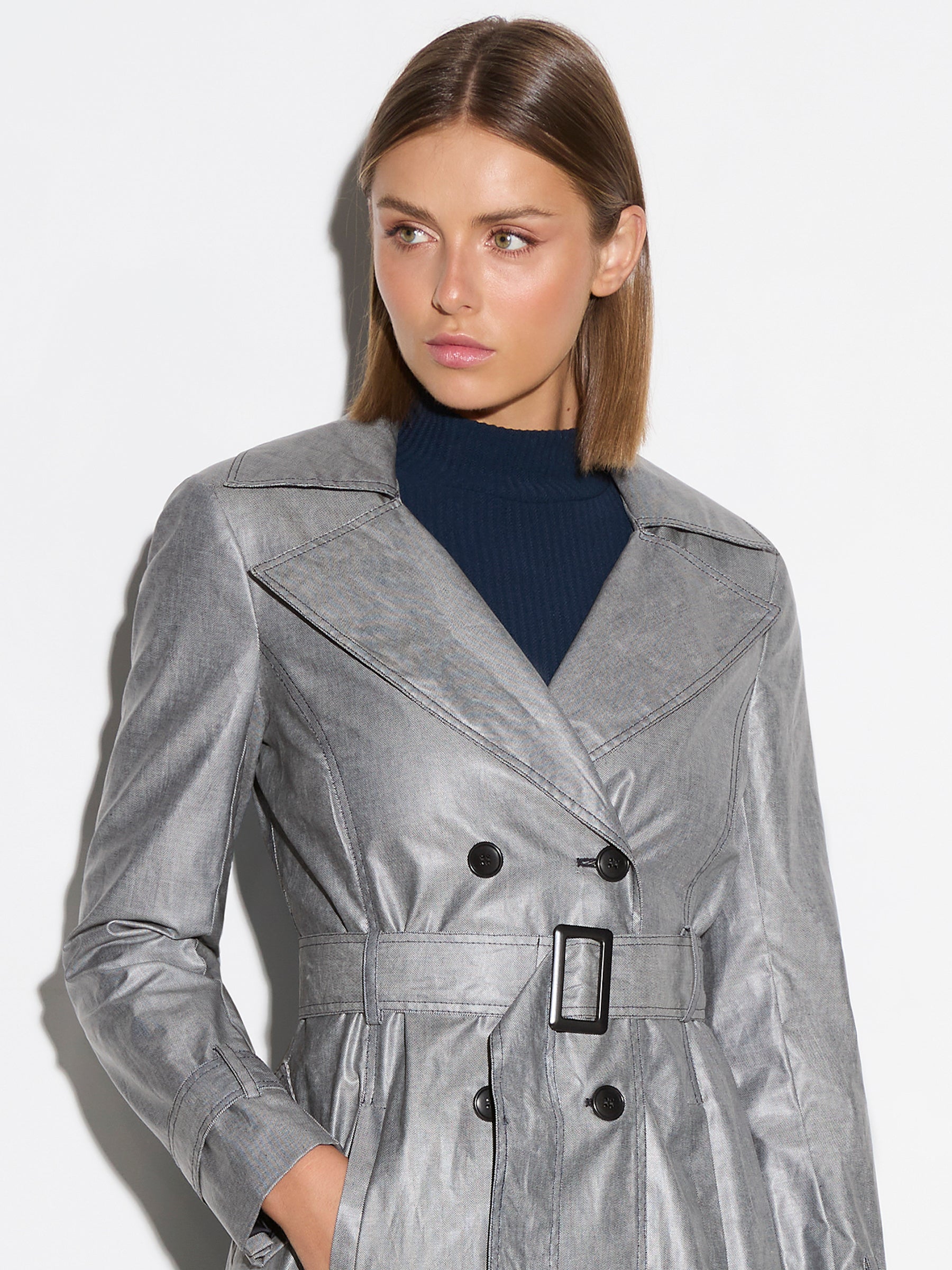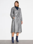 A modern update on the classic Spring coat, the Chelsea Trench is sure to be on high rotation this season. Tailored from an indigo yarn dyed, coated cotton fabrication, this trench features navy detailing with a double-breasted button closure, a self-belt with a buckle to cinch in the waist and beautiful top stitching. With a slight A-line silhouette, finishing mid to low calf, the Chelsea Trench is a neutral and versatile style, making it the perfect staple for your Spring/Summer wardrobe.