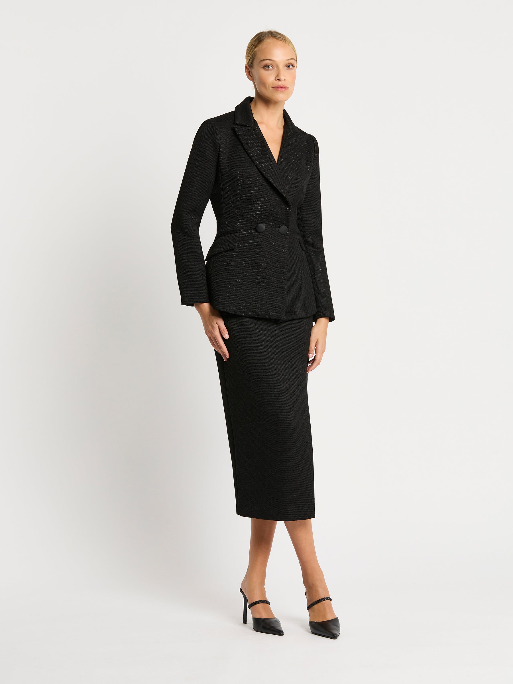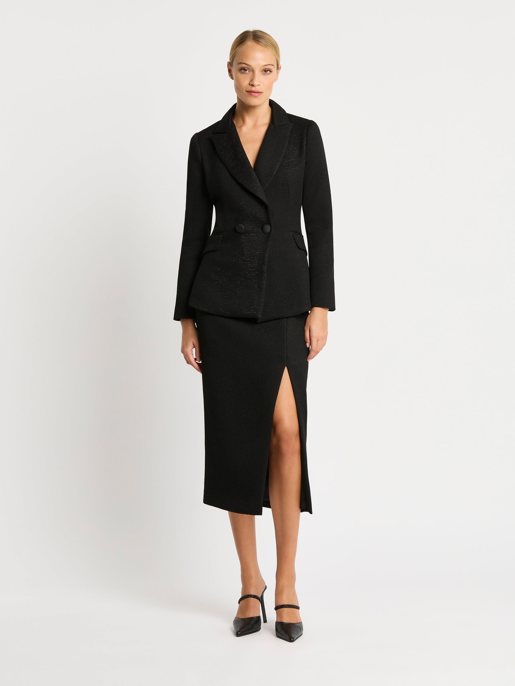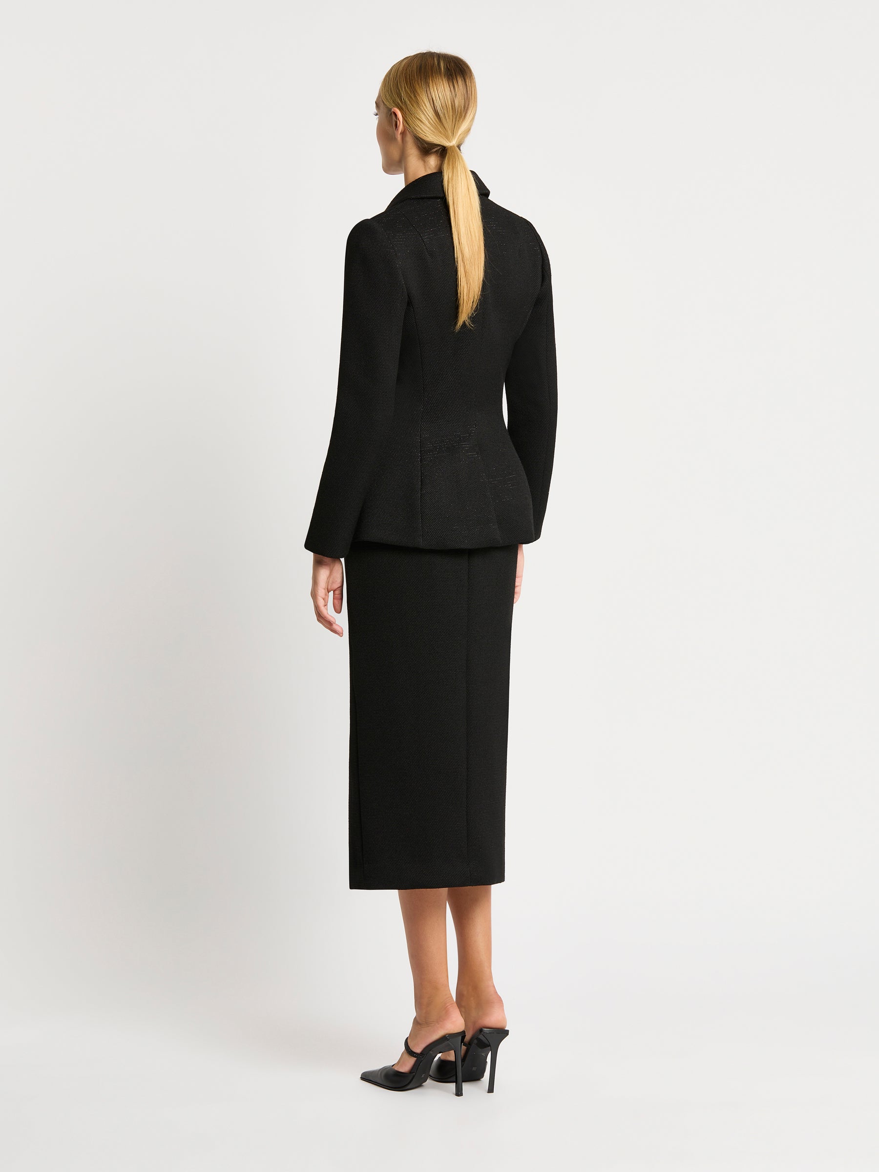 This classic pencil skirt is crafted from a subtle metallic finish crepe suiting. Beautifully tailored with a high waist and piping, it finishes below the knee with a front split.