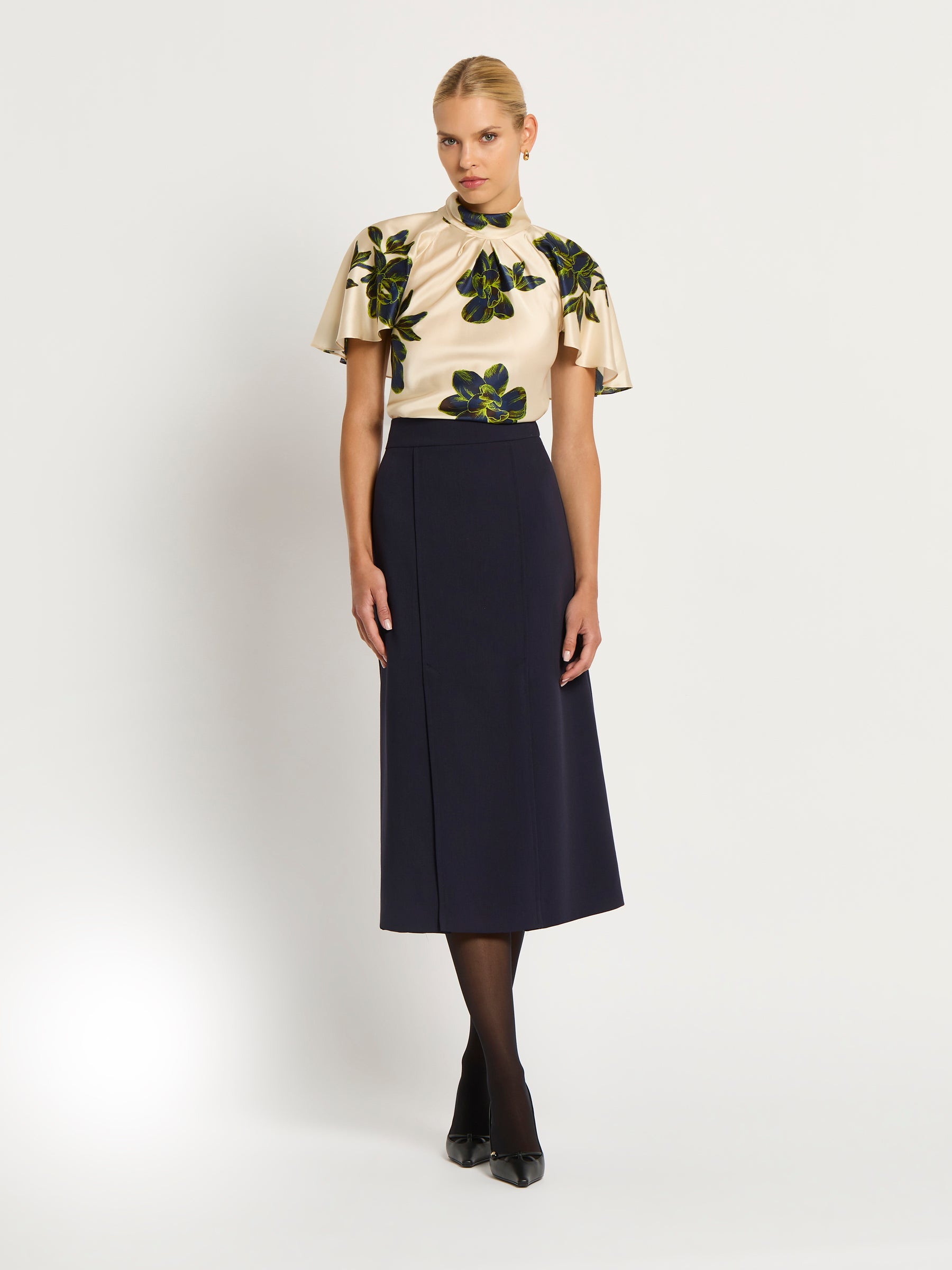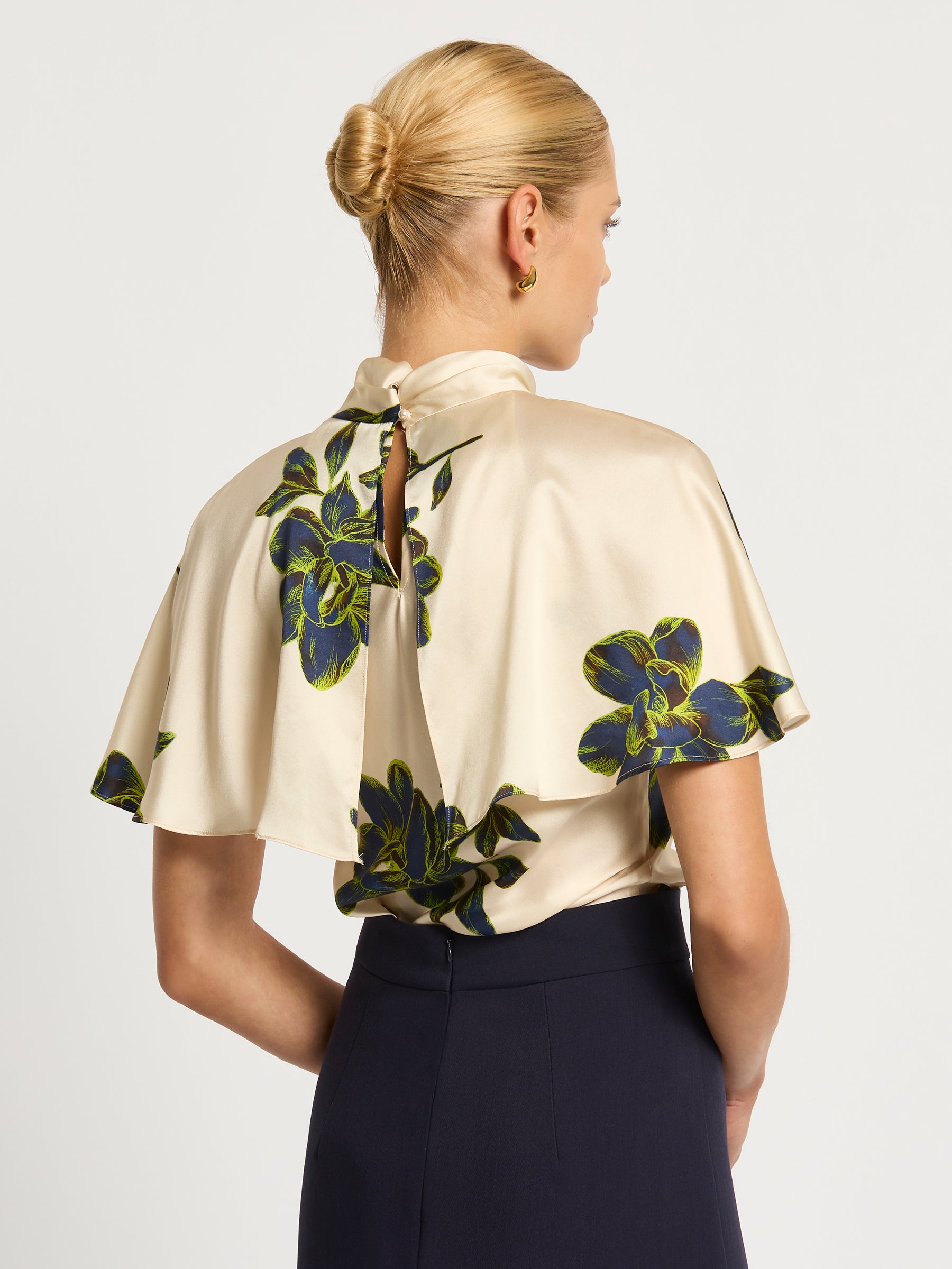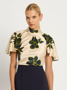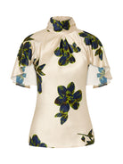 The Dahlia Cape Top is striking top for any occasion - with flowy cape sleeves, rich floral pattern in shades of green and blue on an ivory background and soft, high neckline. Crafted from silk viscose and secured at centre back with button and loop fastenings, it will take you from day to night, easily paired with your favourite skirt or pants.