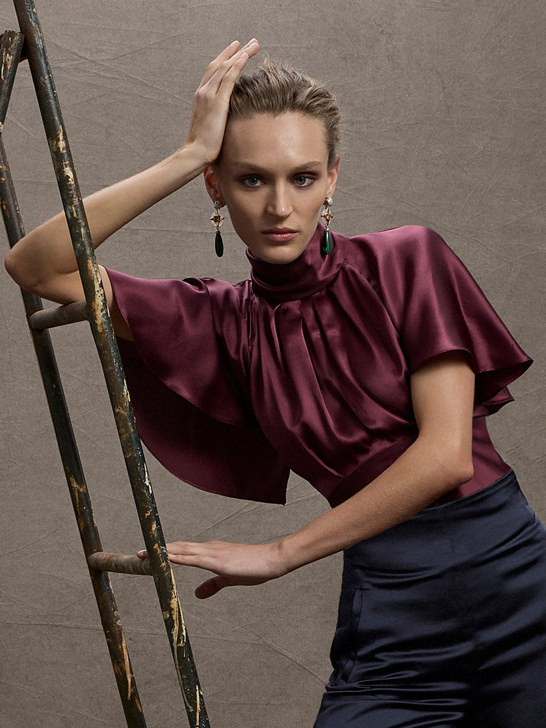 Crafted from a silk viscose, the Eleanor Cape Top features a high collar, secured at centre back with button and loop fastenings. With a flowy cape sleeve attached at the centre back neckline. Pair the Eleanor Cape Top with your favourite skirt or pants, the perfect top to take you from day to night.