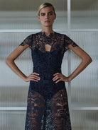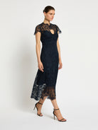 A contemporary take on the classic lace dress, the elegant style of the Elise Midi is crafted from a geometric floral design on midnight guipure. Perfect for any cocktail event or party, this timeless silhouette features scalloped detailing at the neckline, cap sleeve and hemline. Fitted through the body with a slight A-line skirt, and finishing mid-calf, it comes with a matching satin slip.
