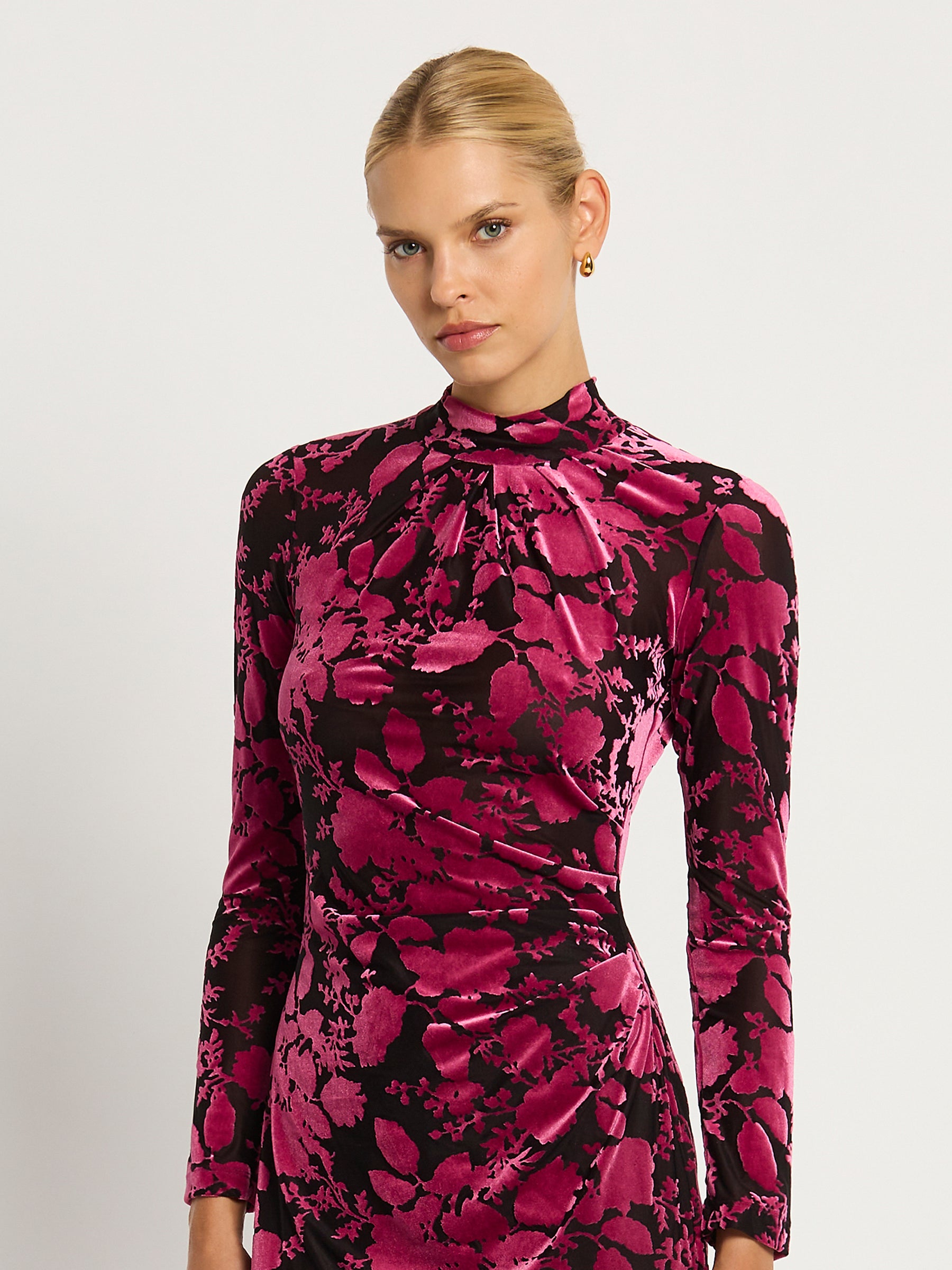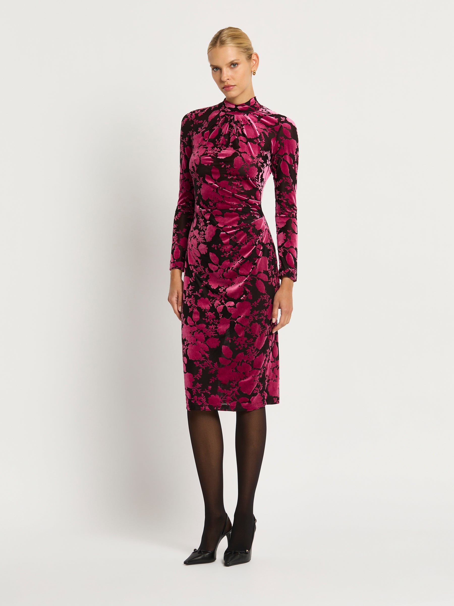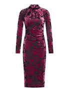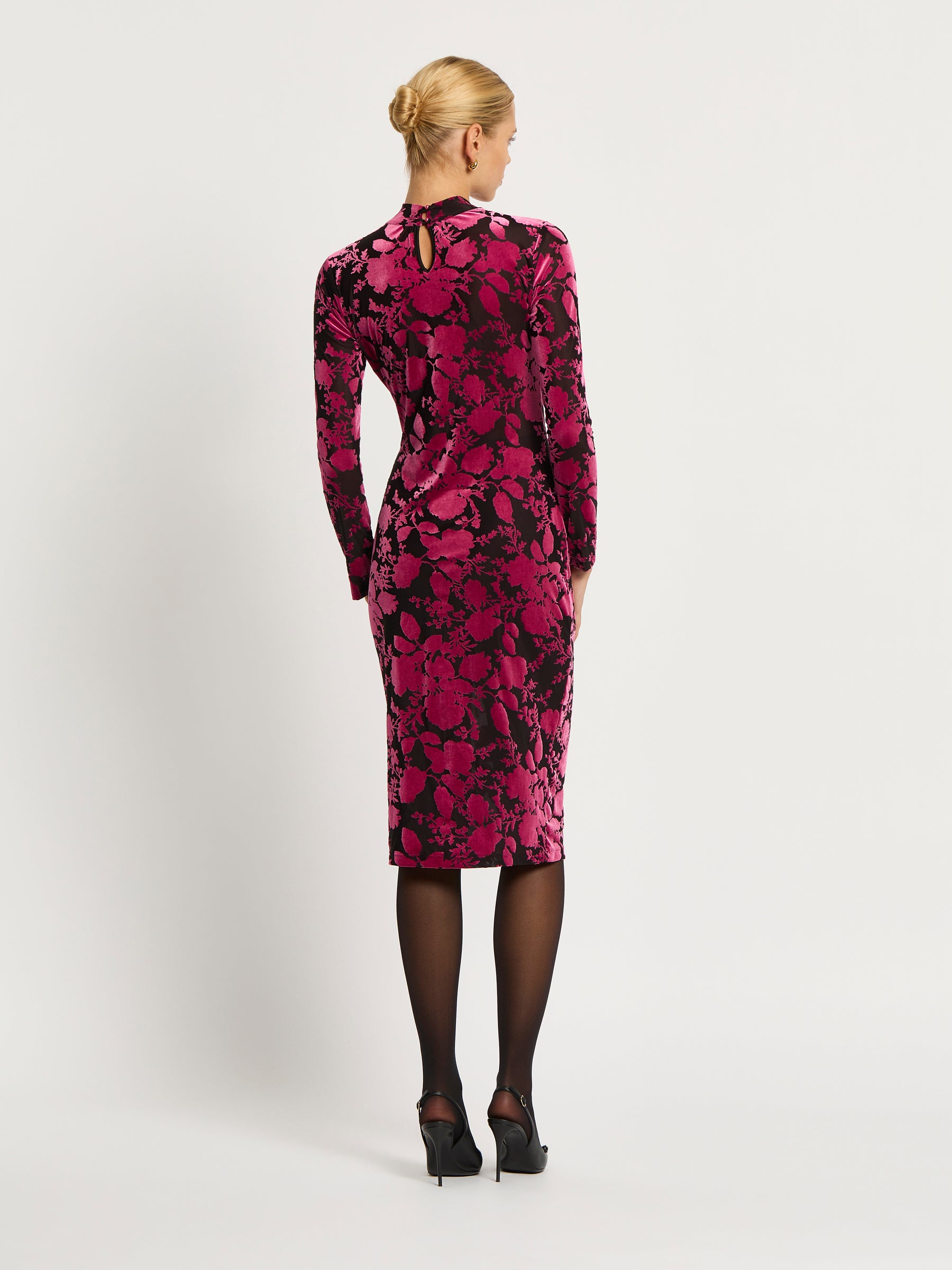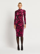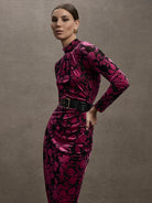 Crafted from a rich fuchsia and black velvet floral burnout knit, the Emily Dress has the style and comfort to be the centrepiece of your autumn-winter wardrobe this year. Discrete panelling and tuck detailing through the front creates a shapely flattering silhouette. Features an extended neckline with tuck detailing at the neckline, button and loop closures at centre back and the long sleeves make this a comfortable yet stunning choice for any day or night. Comes with a black jersey slip.