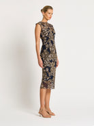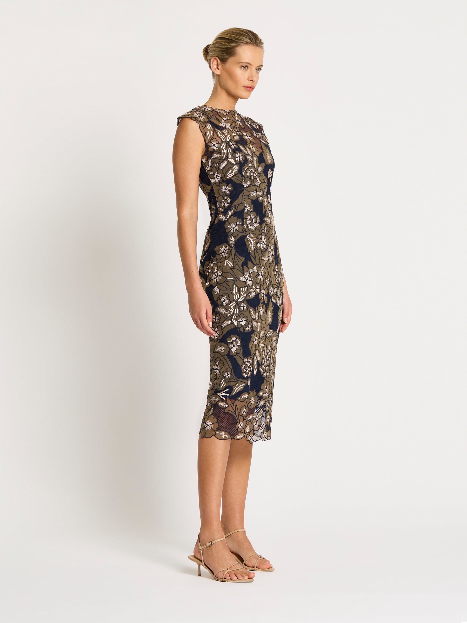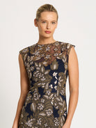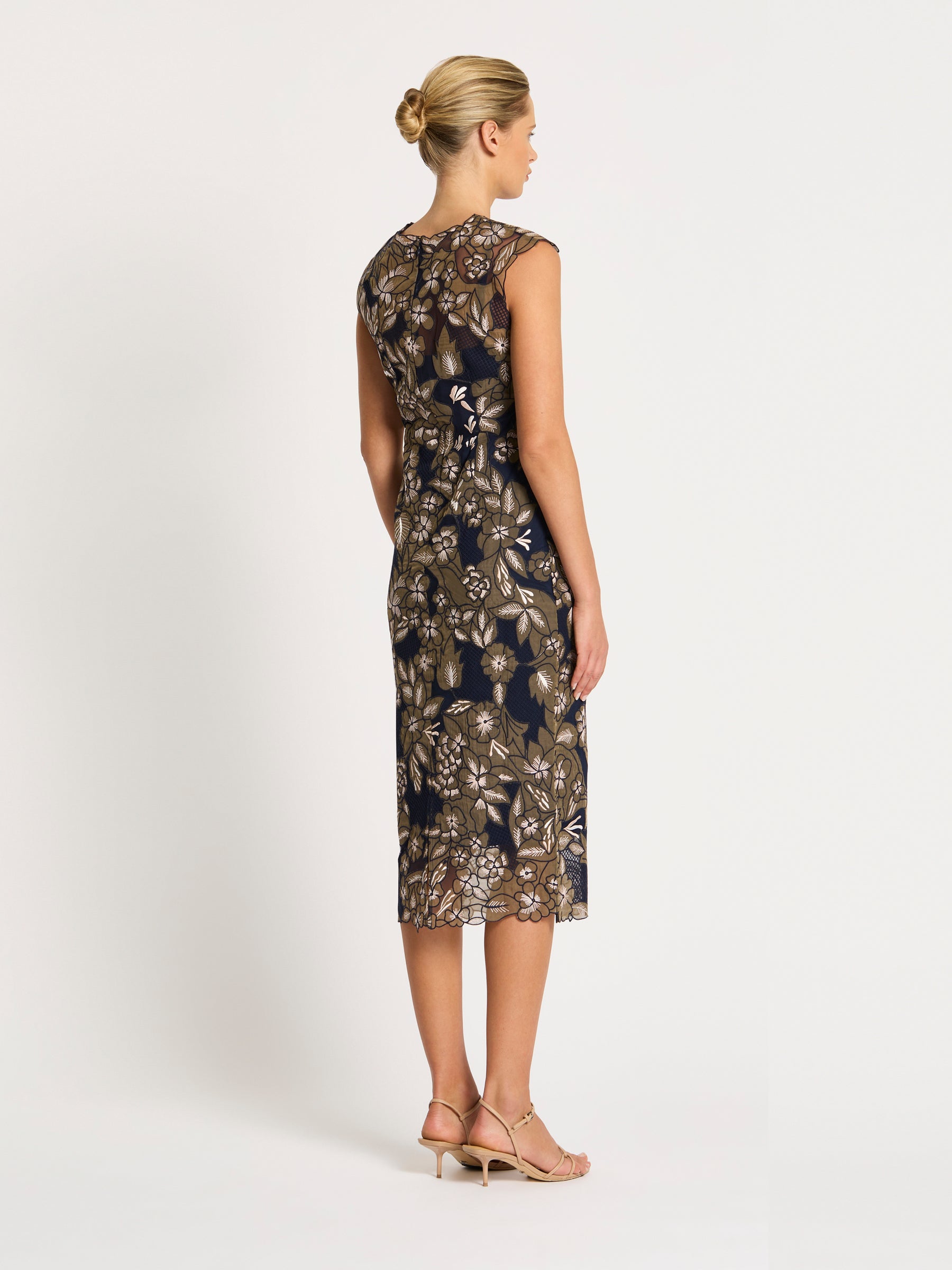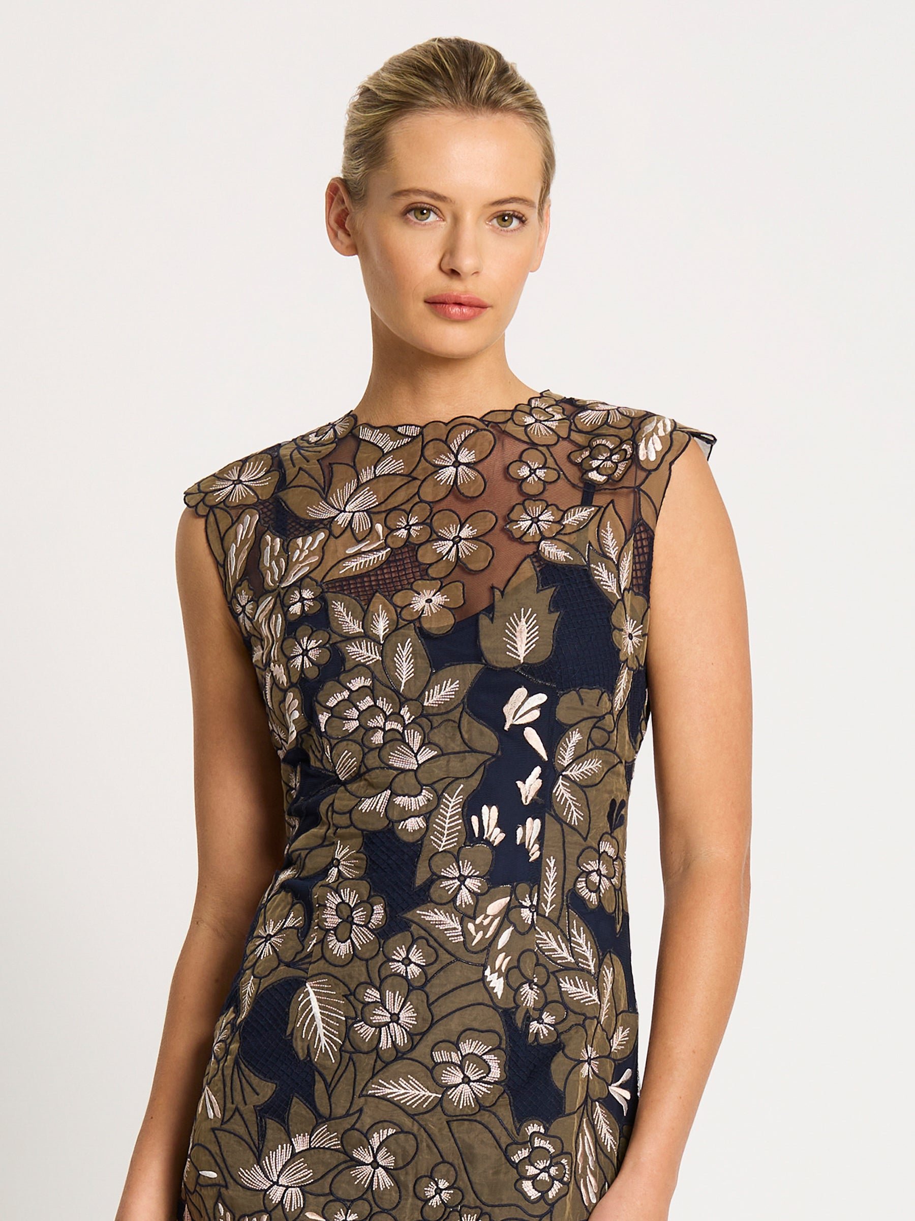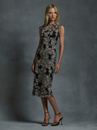 The intricate applique of delicate pink and white flowers woven into a grey background and embroidered onto a dark navy fine tulle create the unique look of the Fleur Dress. Designed with a figure-flattering shift silhouette, it finishes at mid-calf with an invisible zip back closure.