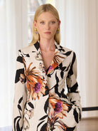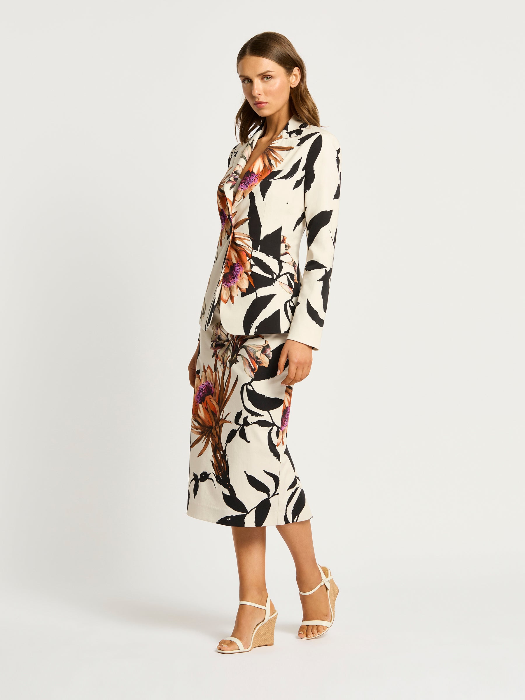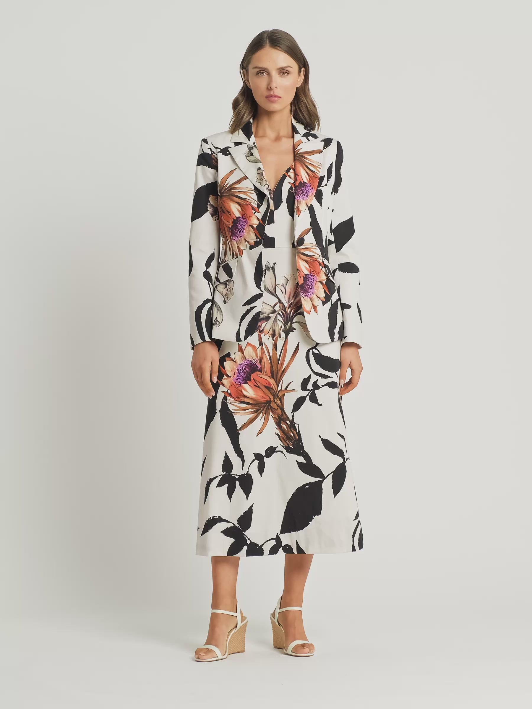 Designed with panelling to create a slim silhouette, the Flora Blazer is crafted from a breathable cotton viscose fabrication with an exclusive floral print. The single-breasted design is secured with a button fastening at centre front, and shoulder pads providing added structure to enhance the tailored look. It features functional jet pockets and a centre back vent for an easy fit over skirts and dresses and is fully lined in a breathable stretch cotton lining. The Flora Blazer can be worn as a statement jacket or paired with the Flora Dress or Flora Skirt for a complete look.
